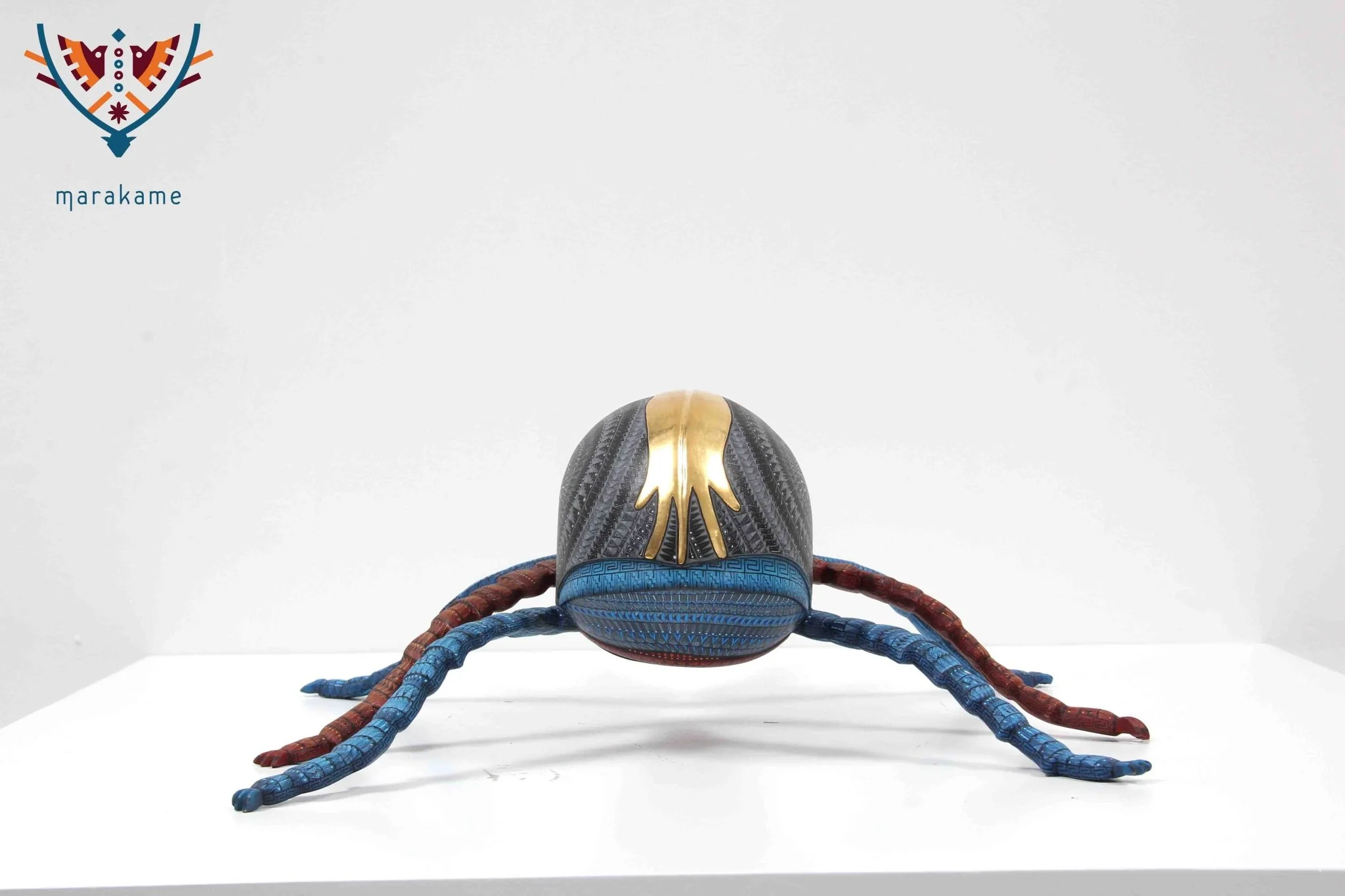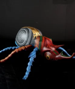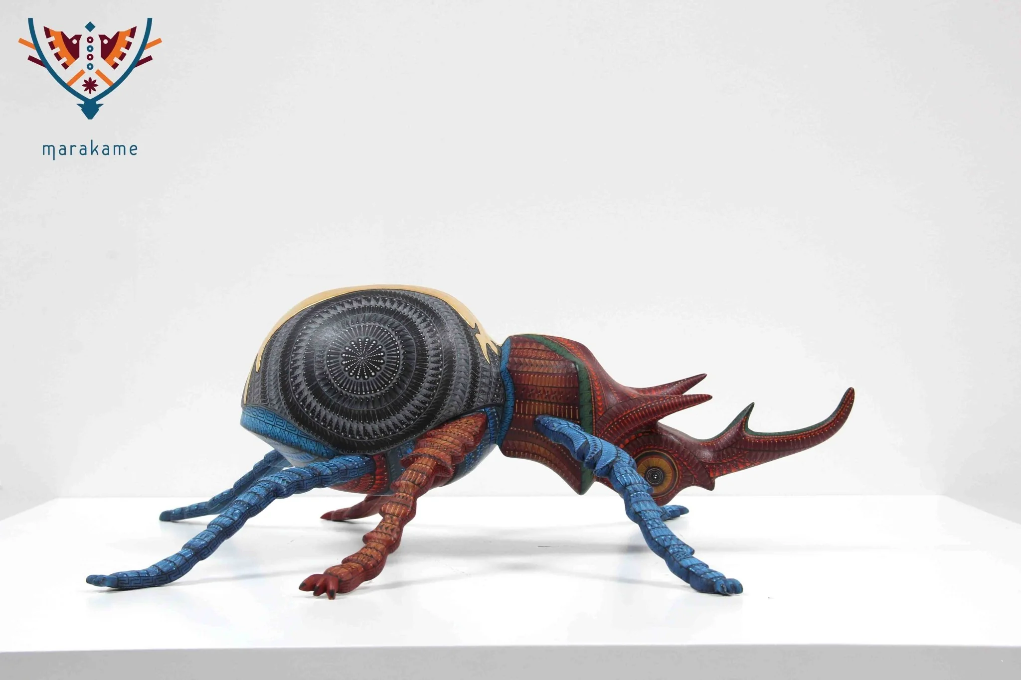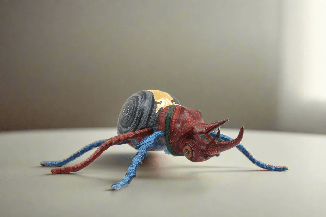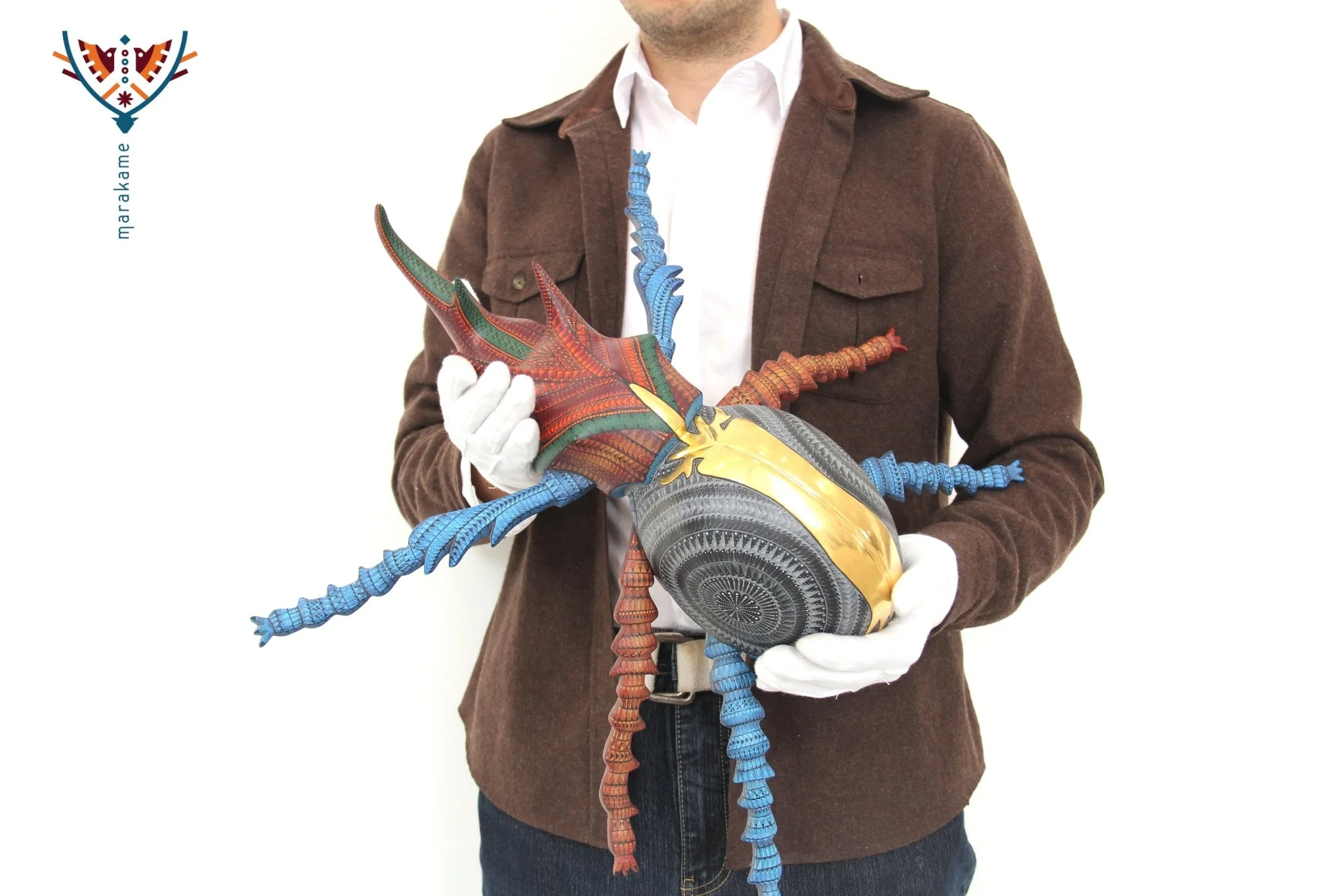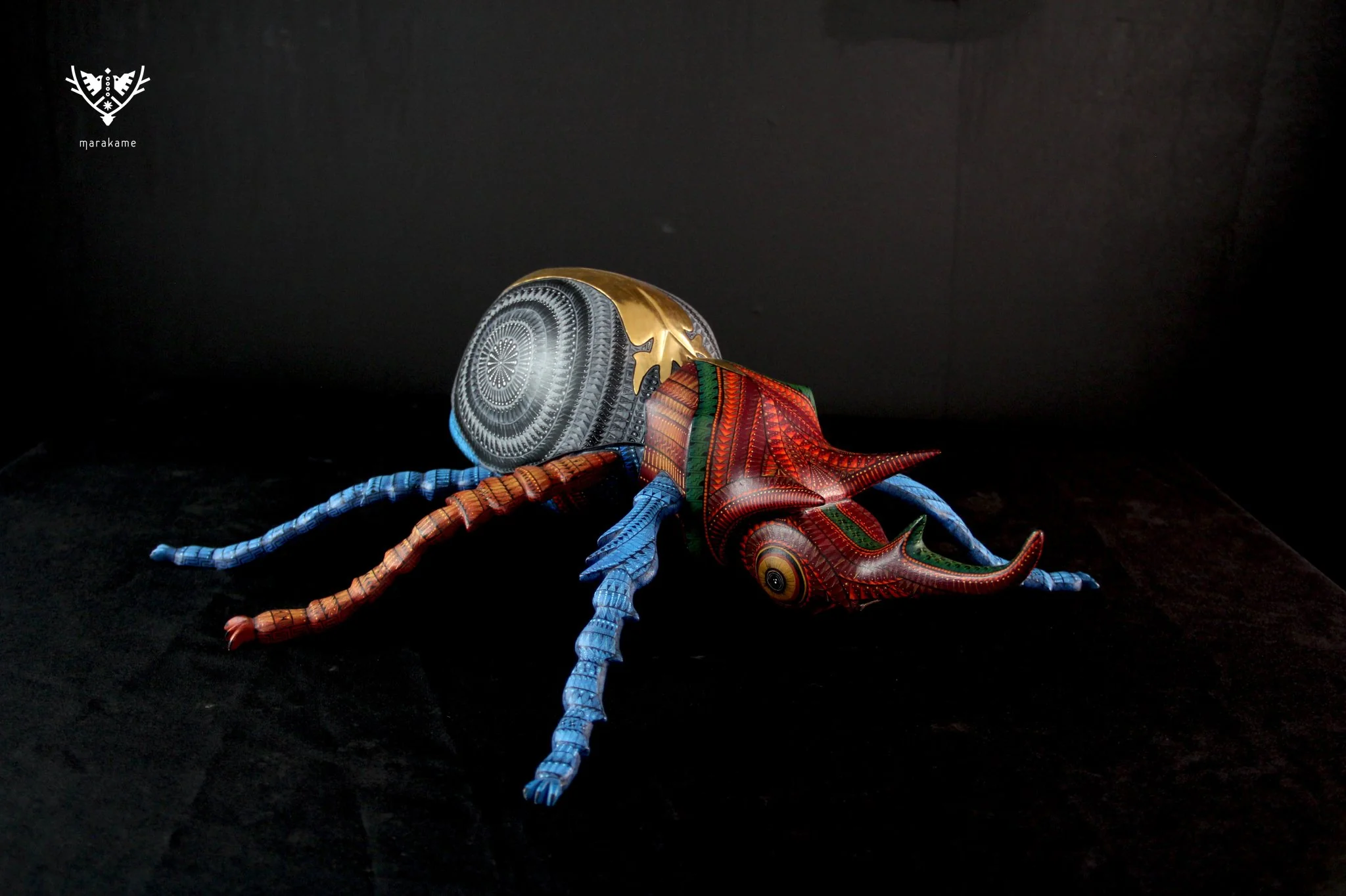 Las patas del escarabajo están decoradas con tonos azules y rojos, lo que crea un efecto visual interesante y dinámico. La parte baja del alebrije está diseñada con círculos grises y negros, lo que sugiere la conexión con la tierra y la noche. La característica más impresionante de este alebrije es la gran sección dorada en la parte inferior del cuerpo, que atrae la atención y destaca el diseño.