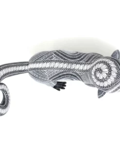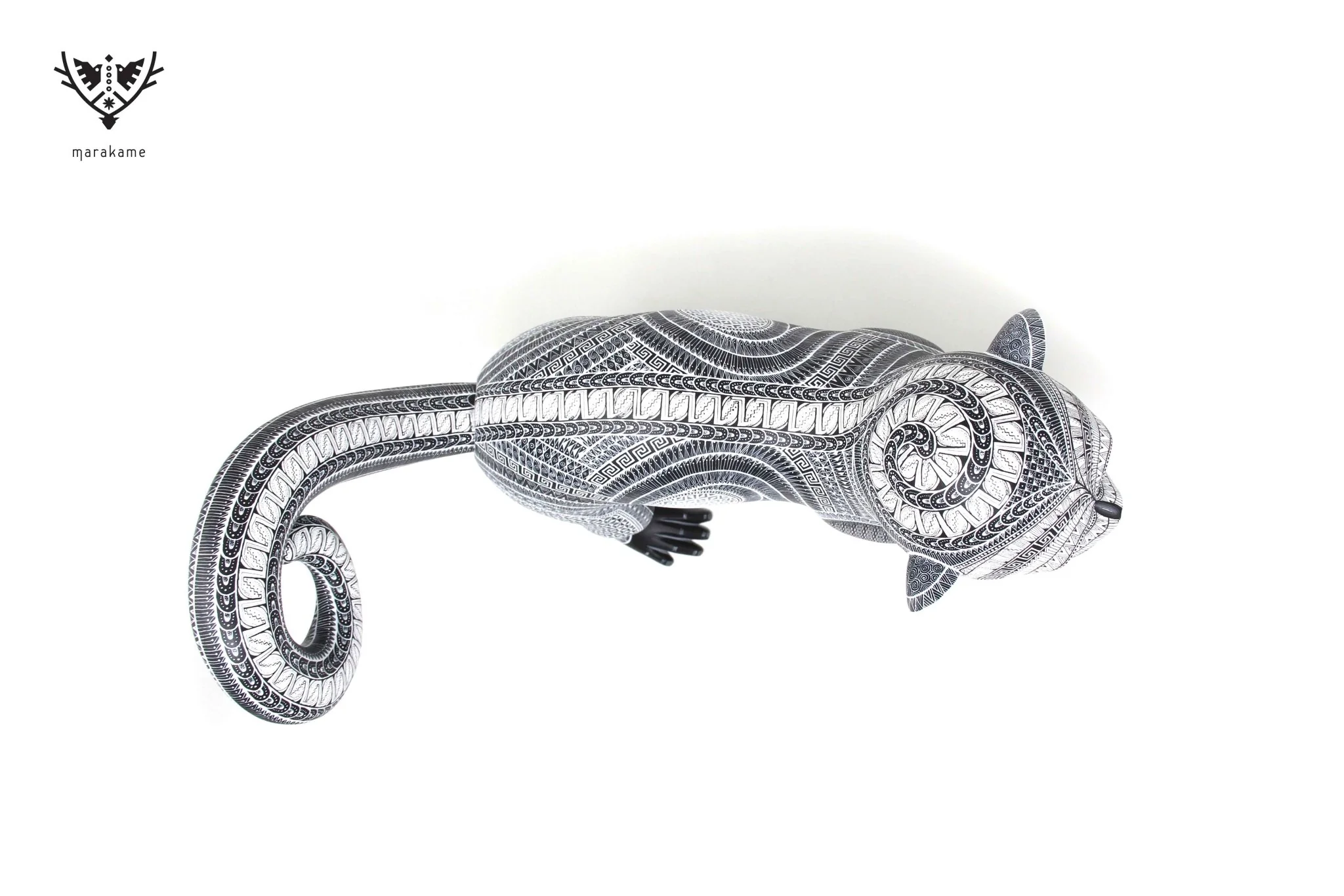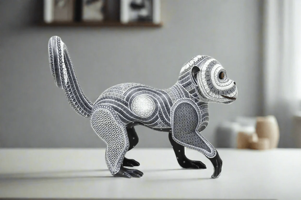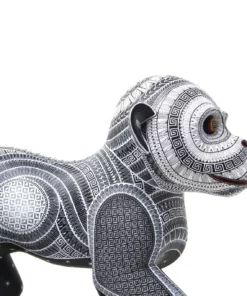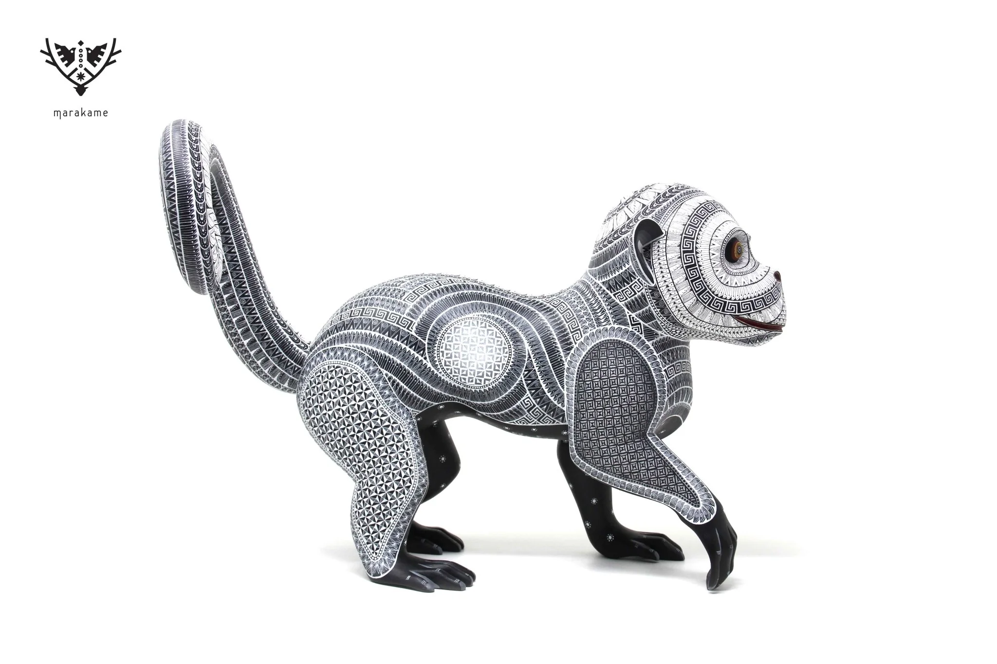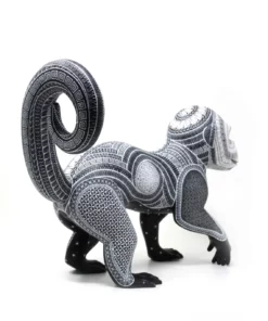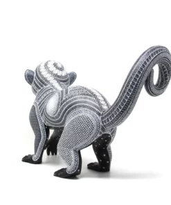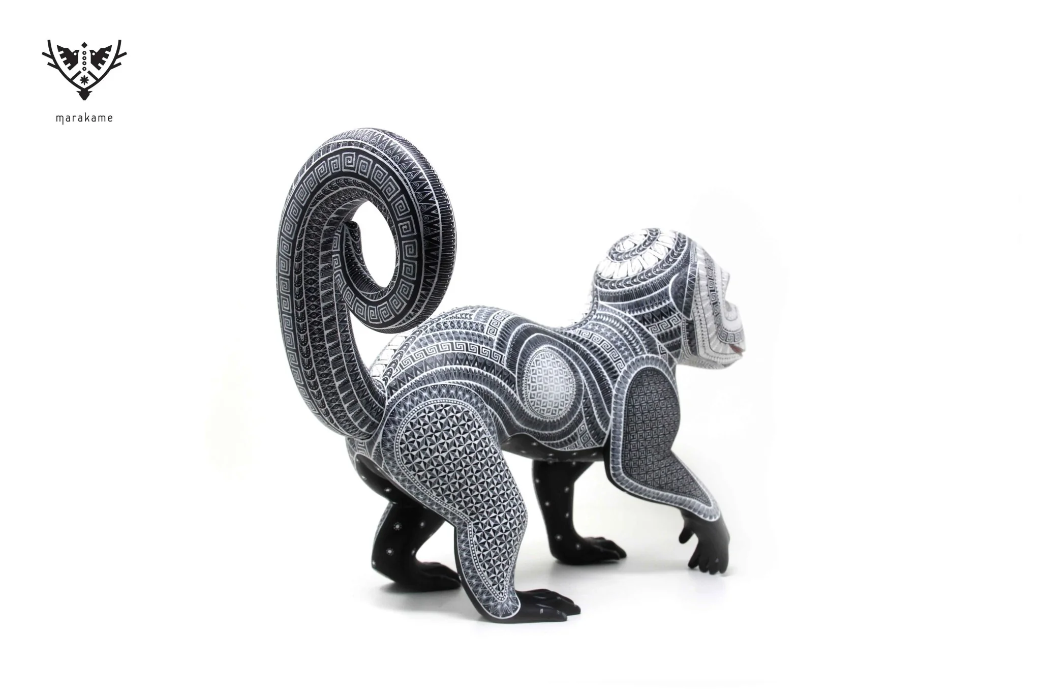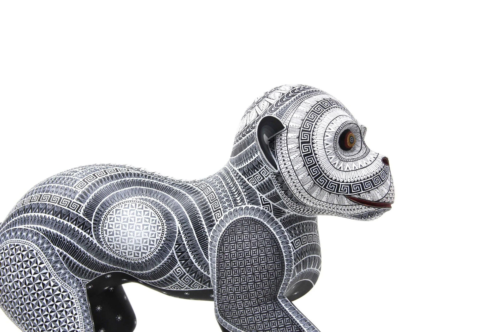 La forma relajada del mono es una combinación perfecta de colores blancos y negros, que crean un efecto visual interesante y equilibrado. El círculo blanco en el centro del alebrije es un toque de elegancia y pureza, y genera círculos que dan dinamismo a las decoraciones y símbolos que texturizan la pieza.