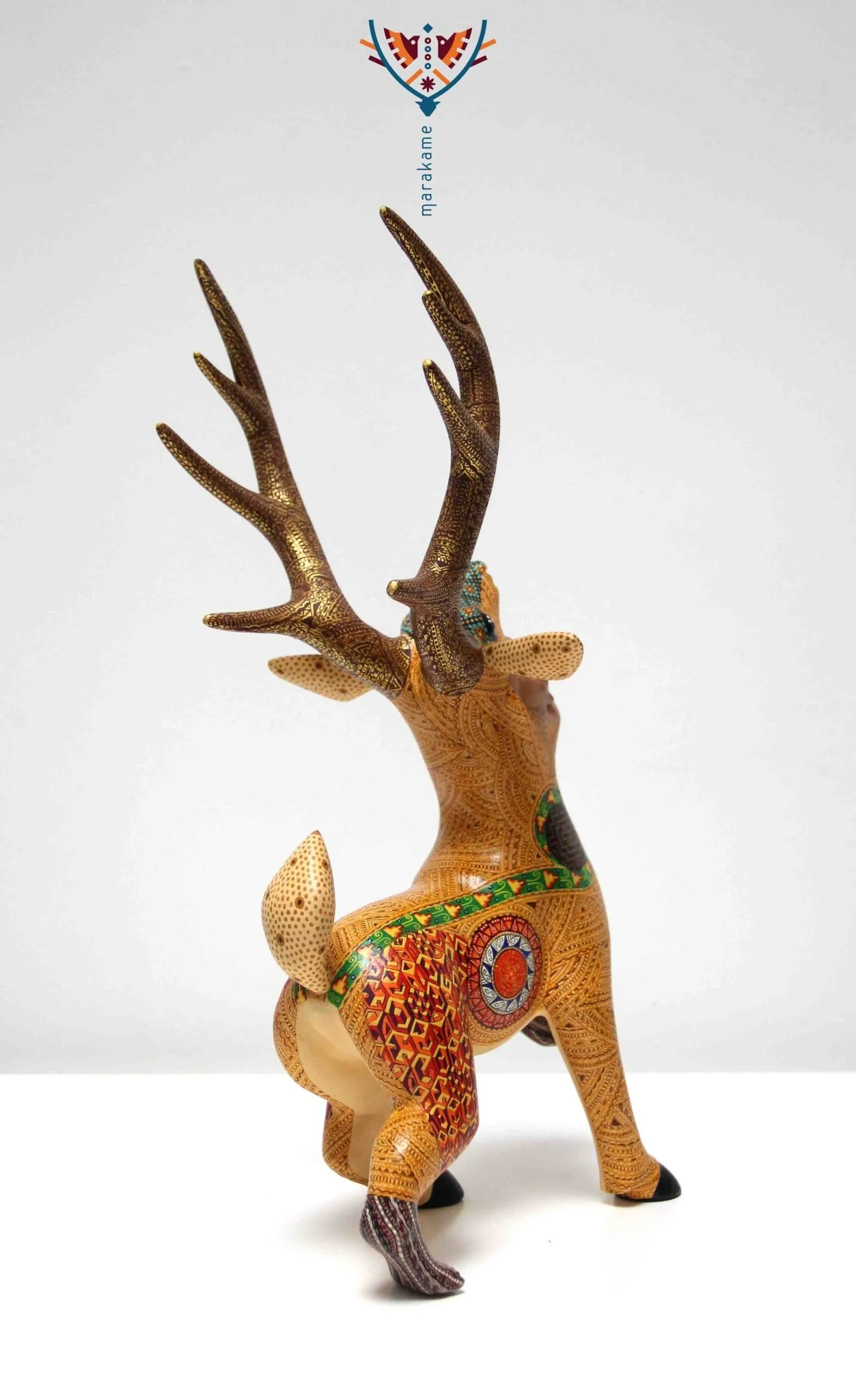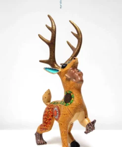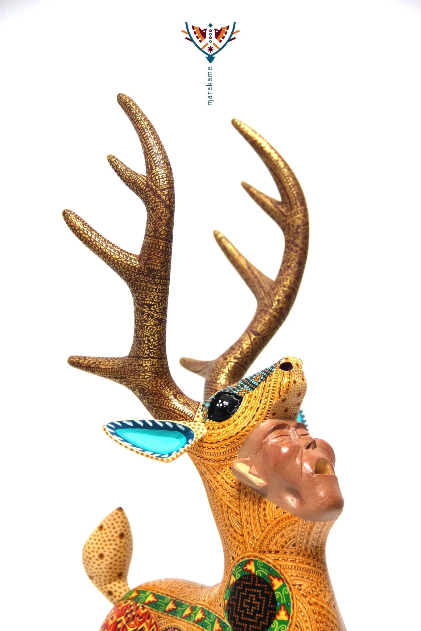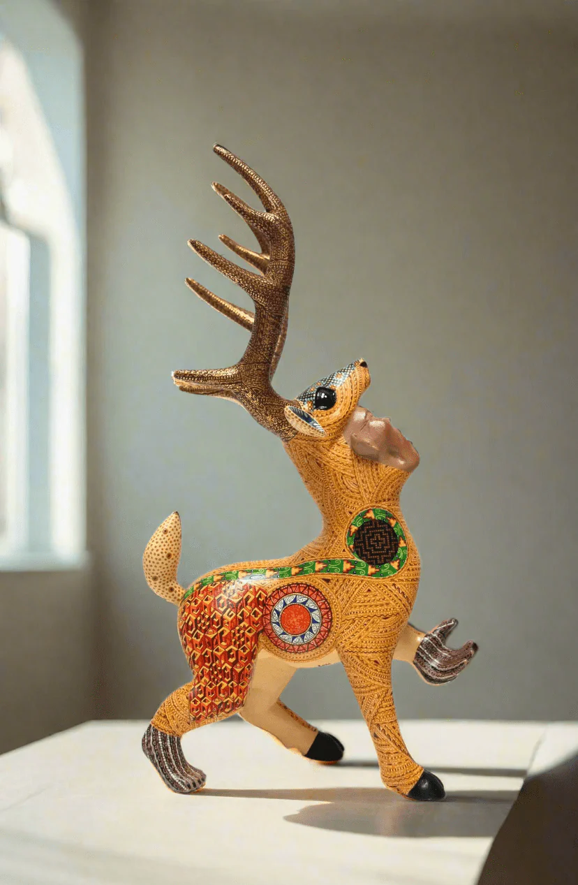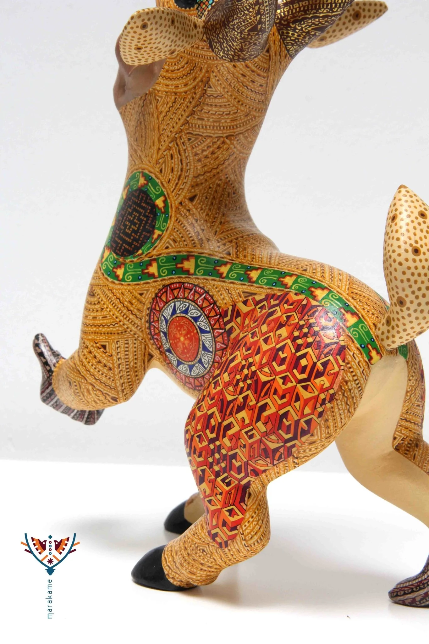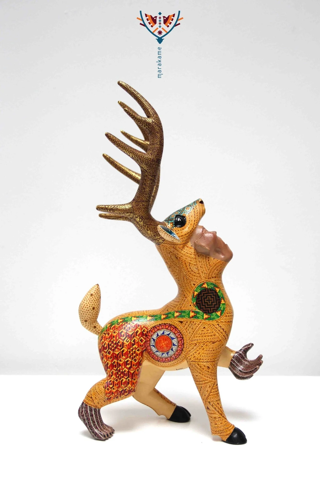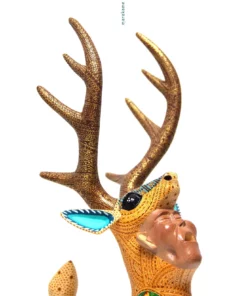 La parte más interesante de este alebrije es su rostro, que combina los rasgos del hombre con las características de un animal, en este caso el venado. La mano y el pie humanos también son un elemento interesante que propone la capacidad del nahual para caminar entre dos mundos.