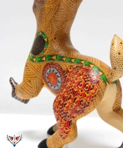 Este Alebrije, una pieza artística única que combina la tradición de los alebrijes mexicanos con el simbolismo zapoteca. El alebrije tiene un color amarillo brillante, que se destaca gracias a la presencia de los símbolos zapotecos en rojo que recorren todo el cuerpo.