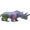 La pata trasera del alebrije está decorada con geometría roja, lo que agrega un toque de energía y vitalidad a la pieza. Un círculo blanco con perímetro rojo y centro rojo en la parte media del cuerpo es un elemento interesante que sugiere un equilibrio entre la luz y la oscuridad. La granja verde y amarilla que lleva en espiral al cuello del alebrije es un toque especial que agrega movilidad y vida a la pieza. Los cuernos amarillos dorados son una característica única y fascinante de este alebrije.