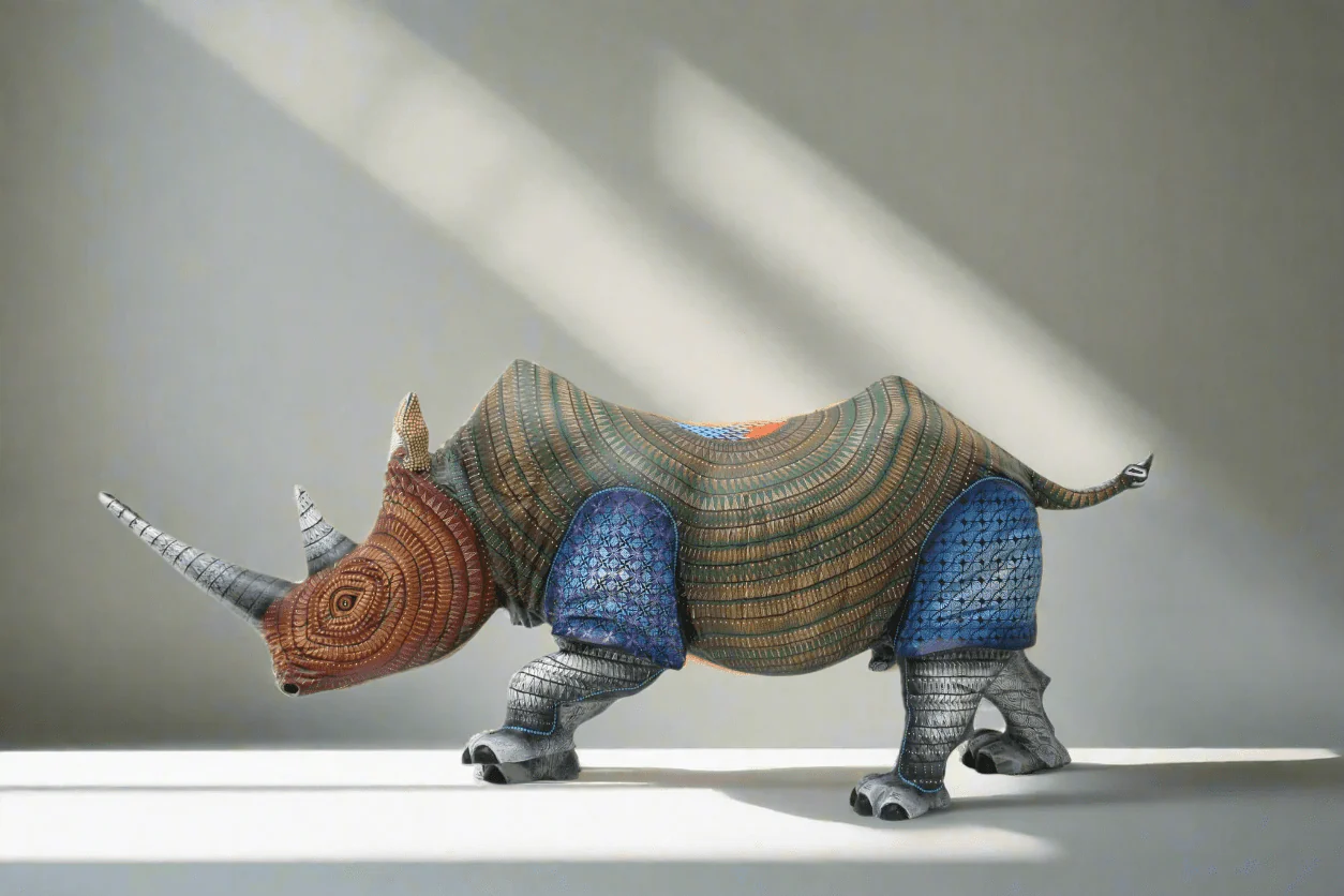 El cuerpo del rinoceronte es pintado en colores tierra, verdes y amarillos, lo que da un toque de naturalidad y serenidad a la pieza. En la parte superior del cuerpo, hay un círculo de colores rojos, acules y morados que se destaca sobre el fondo verde y amarillo. Este diseño crea un efecto visual interesante y emocionante.