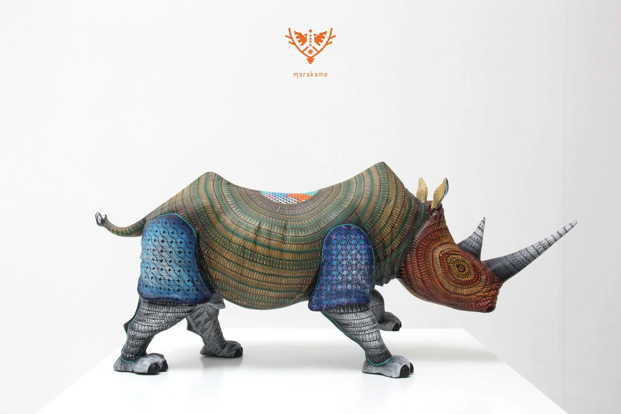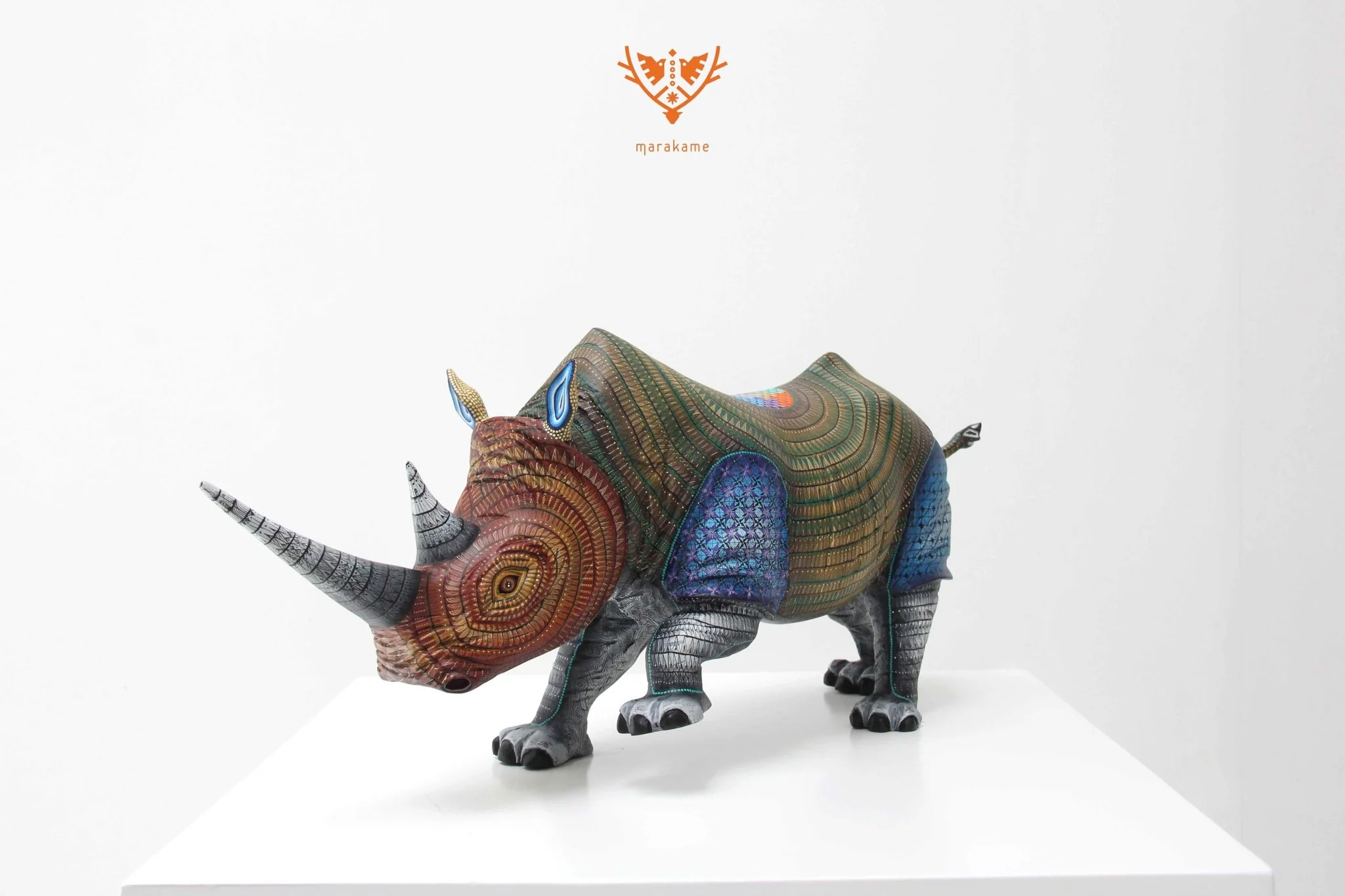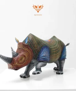 Este Alebrije Rinoceronte – Nadipa es una pieza artística impresionante que combina la figura del rinoceronte con la tradición de los alebrijes mexicanos. El alebrije está en pose de caminata, como si estuviera explorando el terreno y descubriendo nuevos horizontes.