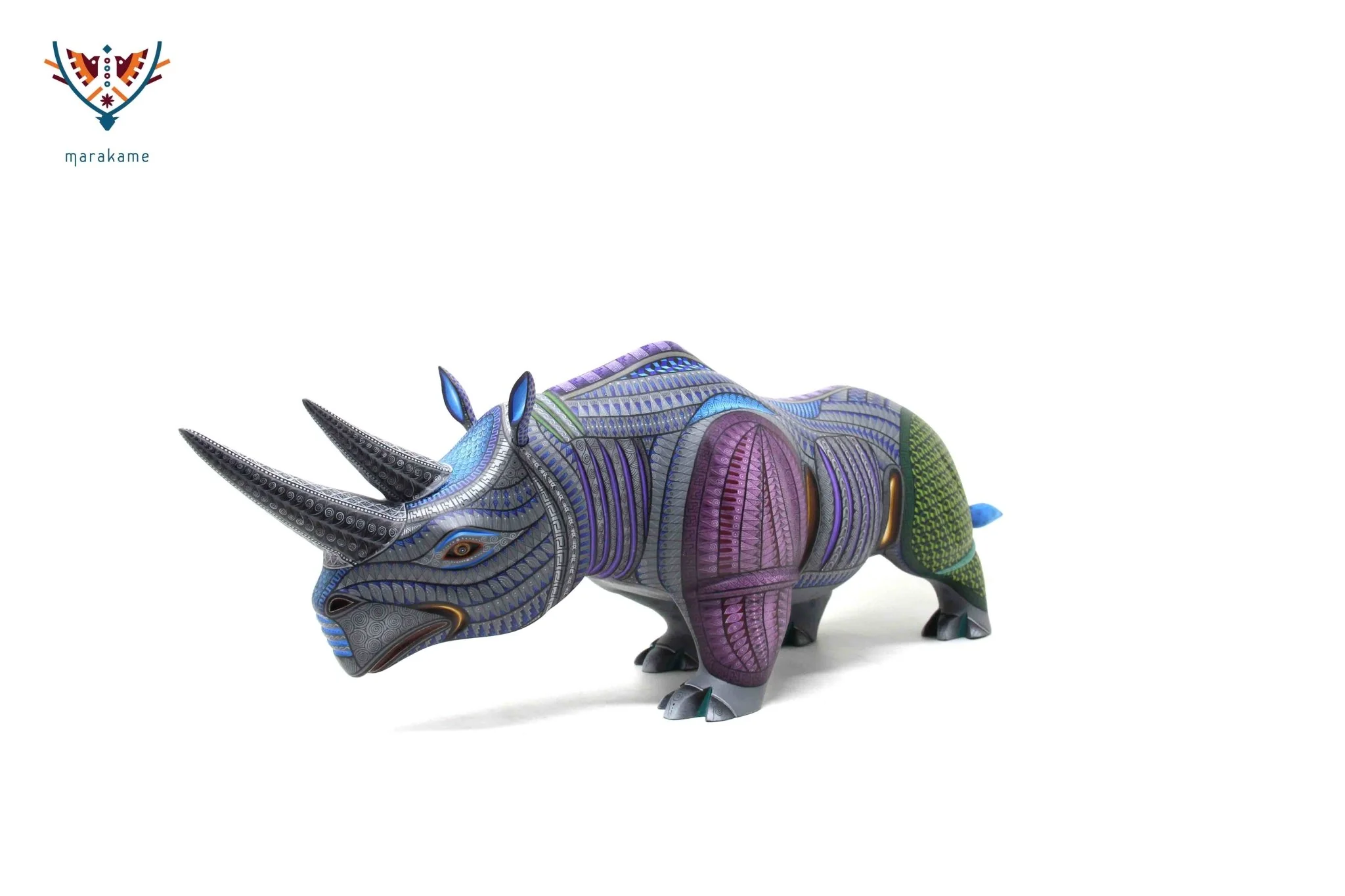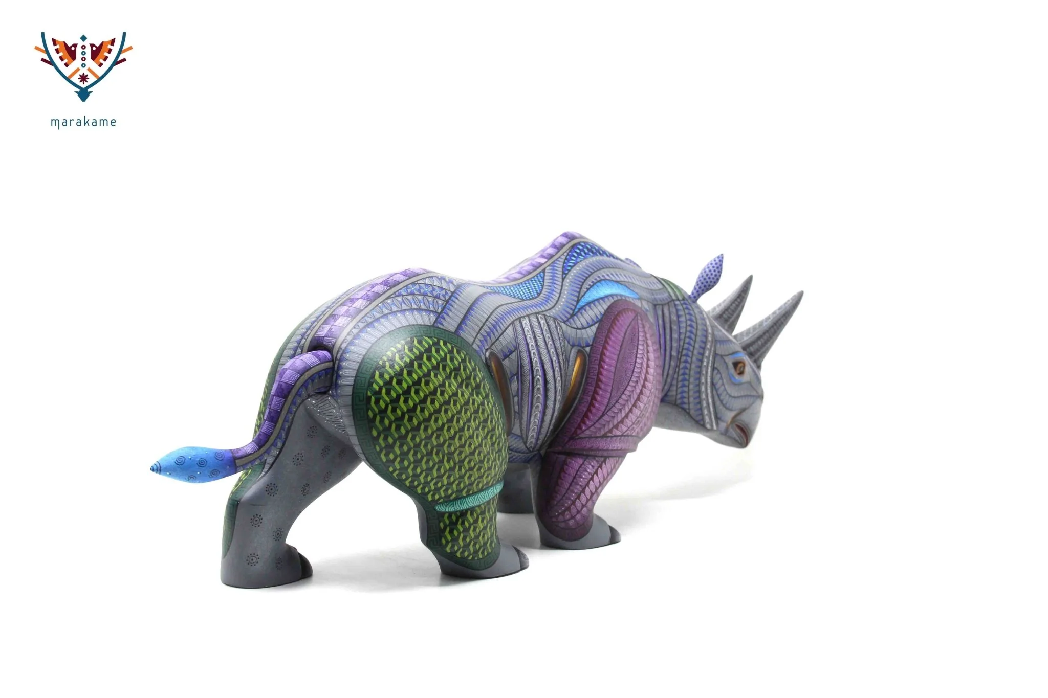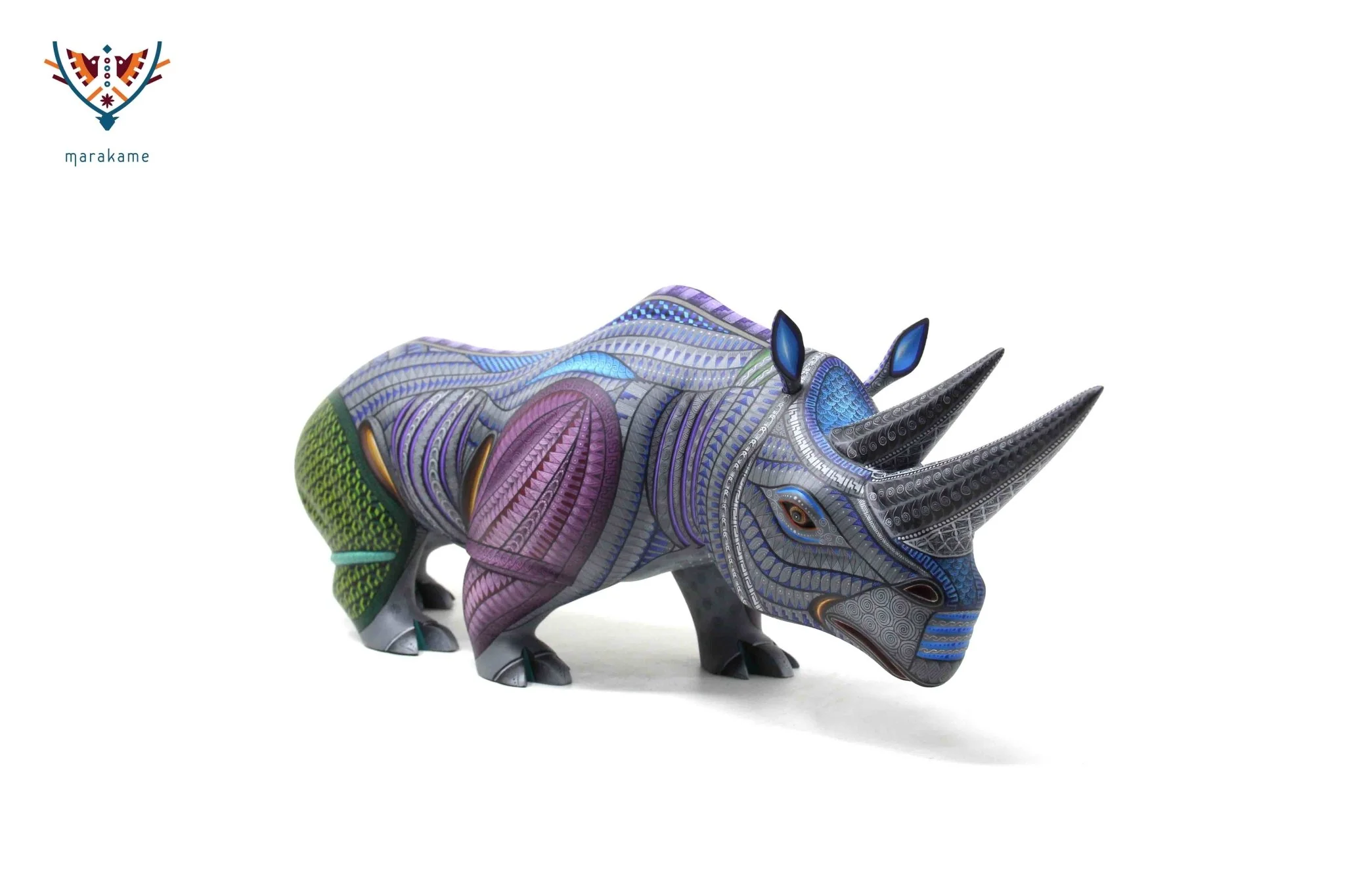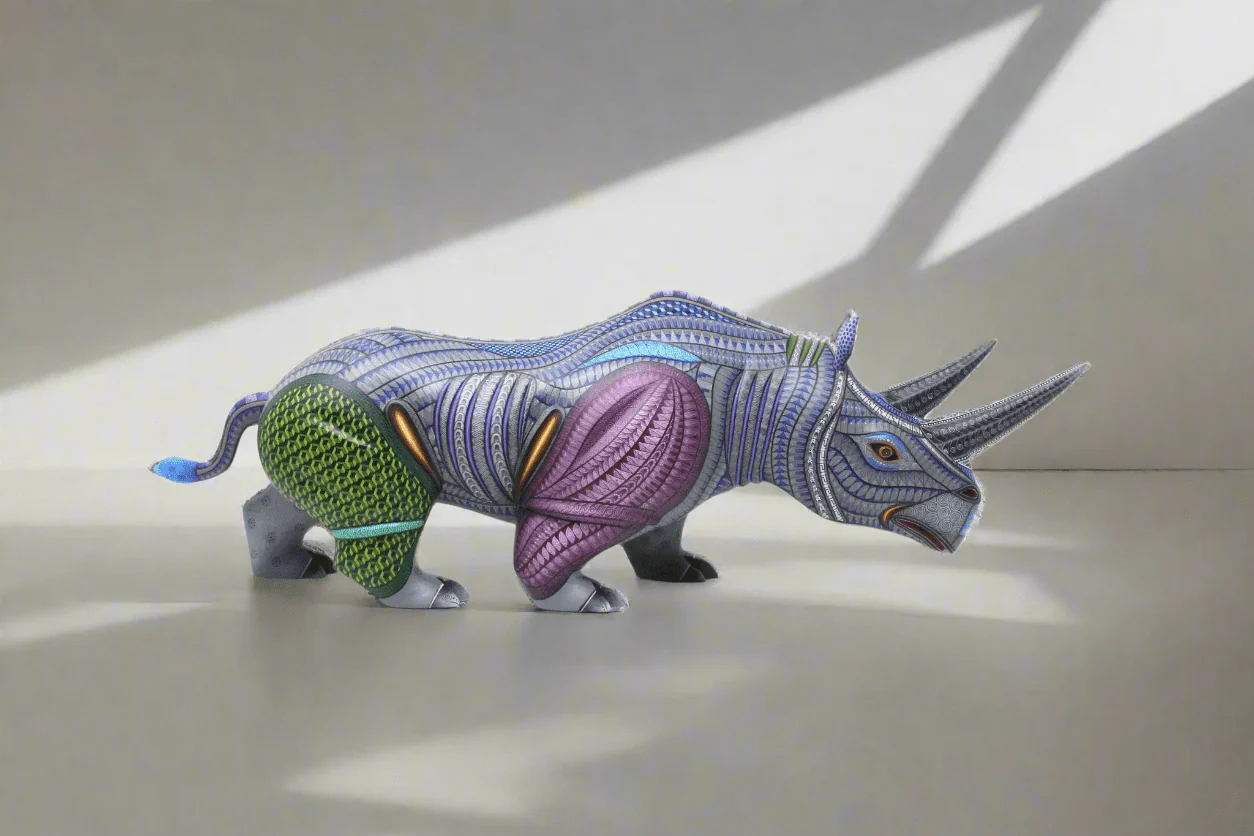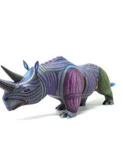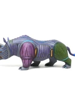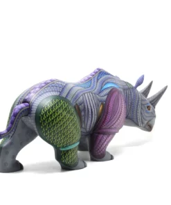 Este Alebrije Rinoceronte es una pieza artística impresionante que combina la tradición de los alebrijes mexicanos con el simbolismo y la estética. El alebrije está en pose tranquila, como si estuviera en estado de meditación o contemplación profunda.