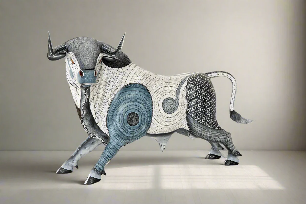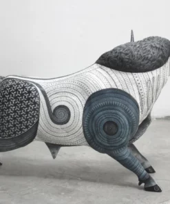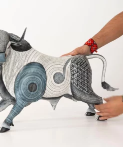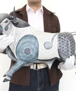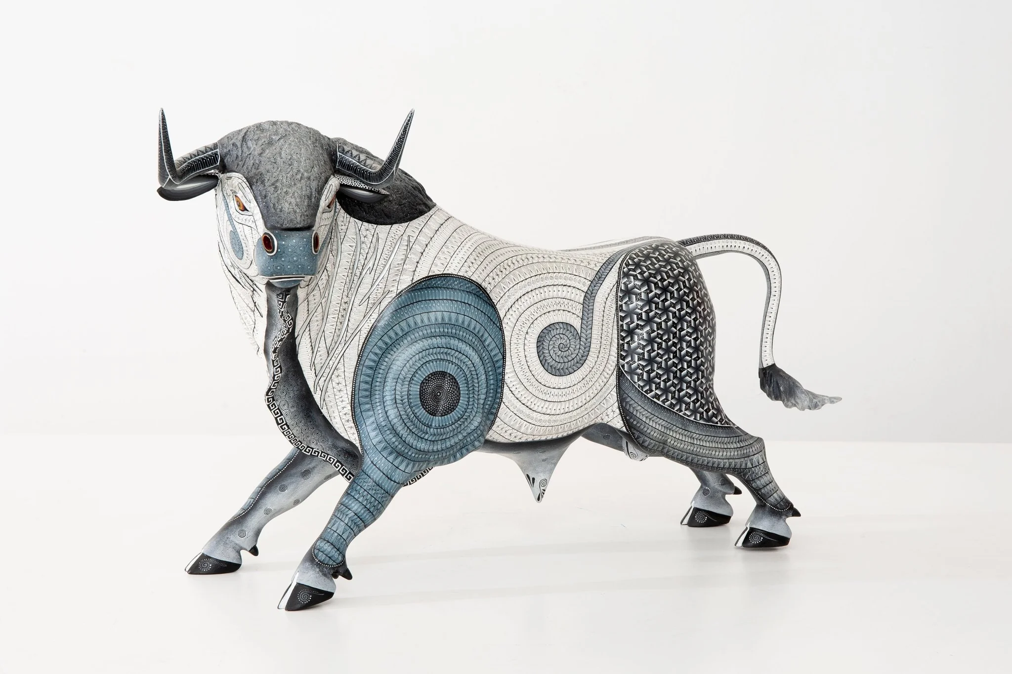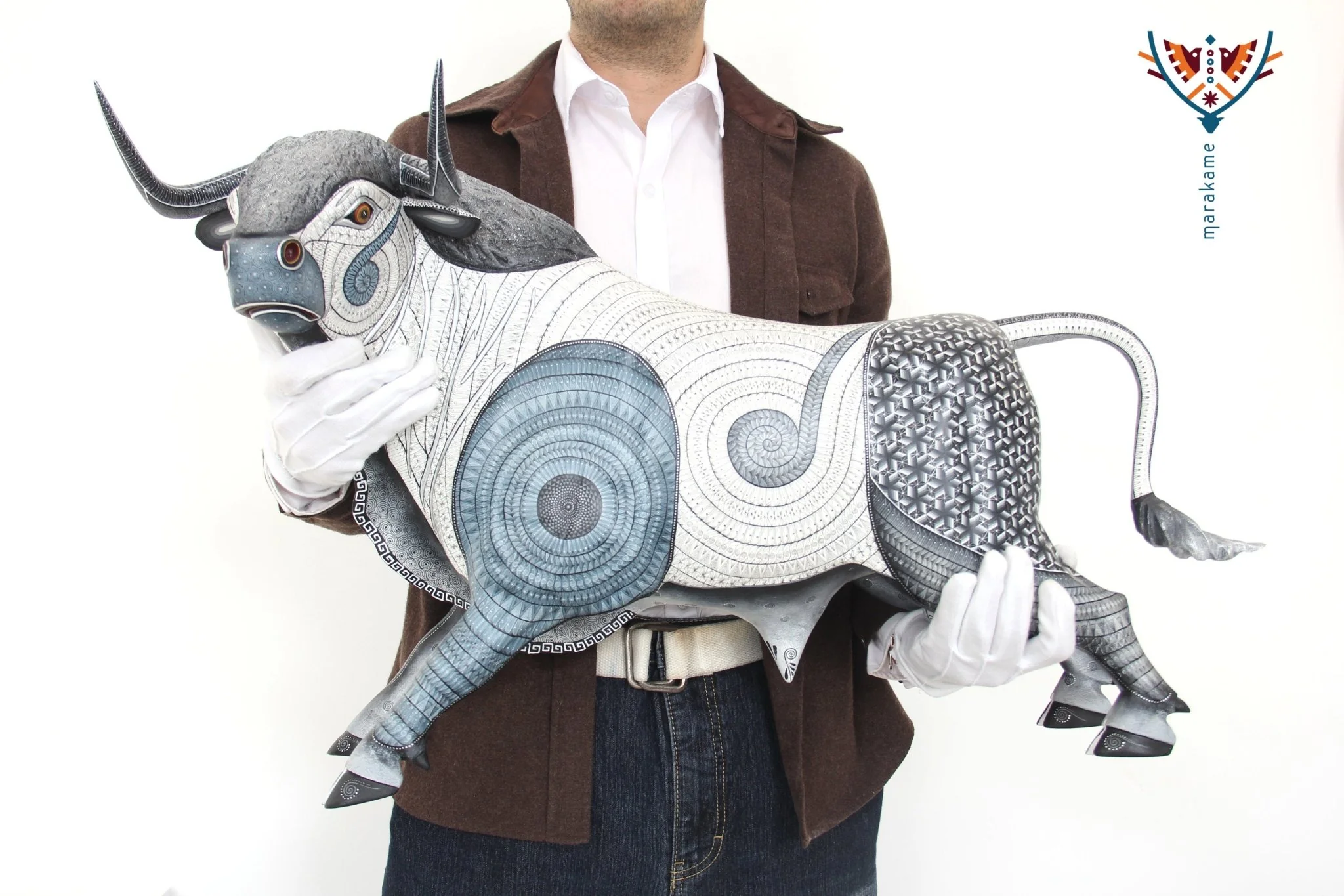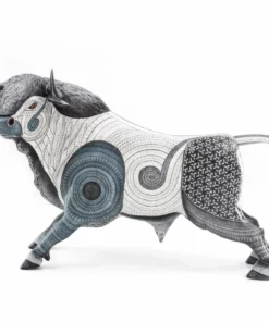 En el mundo de la mitología y la tradición, donde la fuerza y la pasión se encuentran, se encuentra este hermoso alebrije. El cuerpo del toro está pintado en blanco, con toques negros en la cabeza y los pies traseros, lo que le da un toque de seriedad y autoridad. Las patas delanteras y hocico están pintadas en azul, creando un contraste interesante con el cuerpo blanco.
