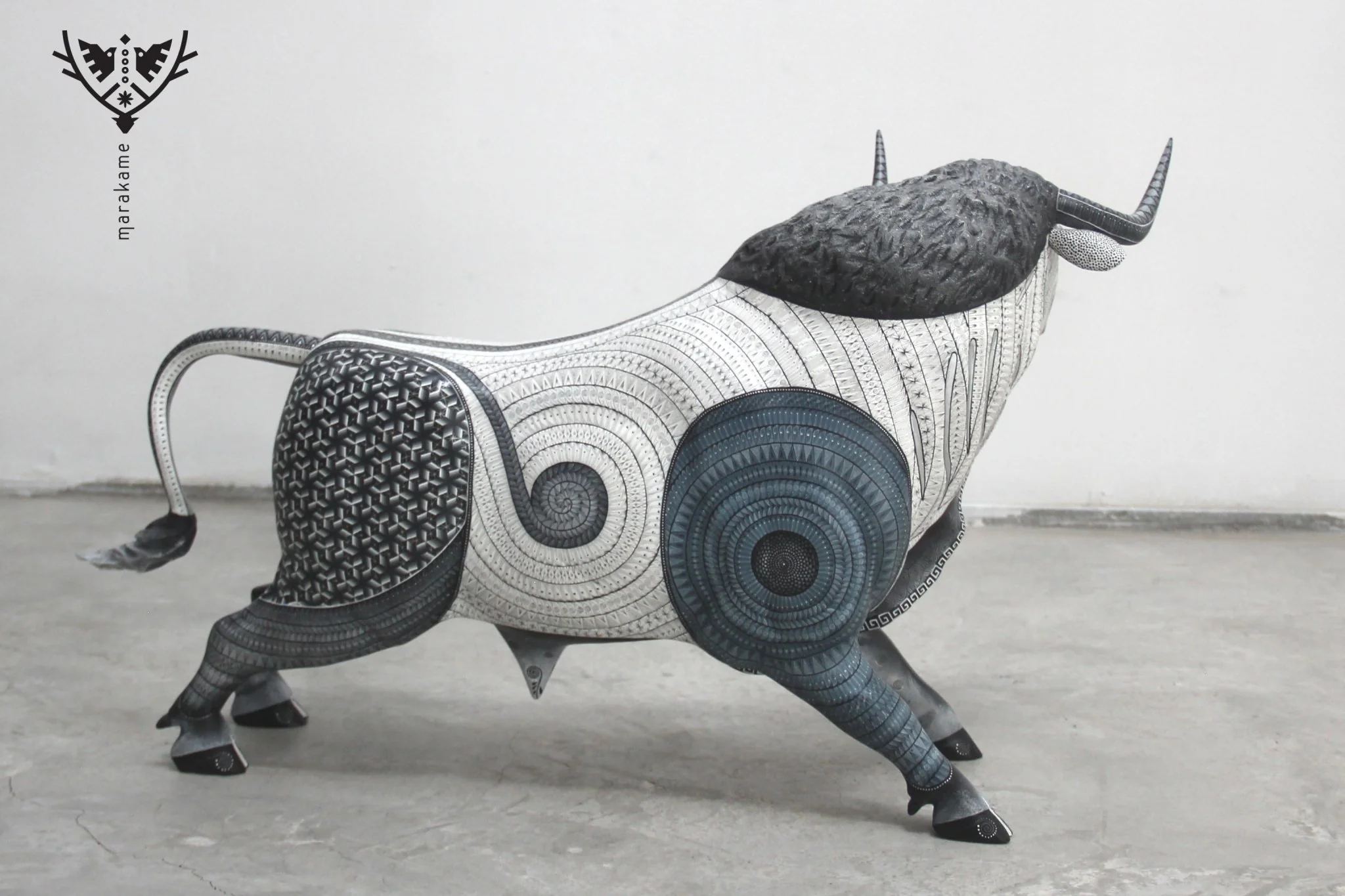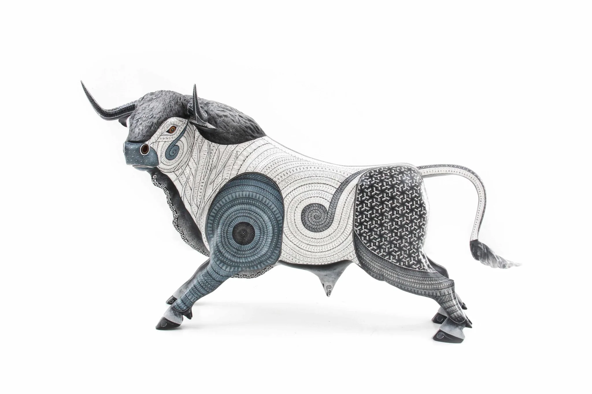 La espiral que va al centro de la barriga del toro es un elemento especial que genera un eco circular en todo el cuerpo, lo que le da una sensación de movilidad y energía. Esta espiral también refleja la conexión entre el mundo de los dioses y el mundo mortal. La pintura a mano y los detalles en madera crean un efecto visual impresionante, invitando al espectador a sentir la energía y la pasión de este hermoso alebrije.