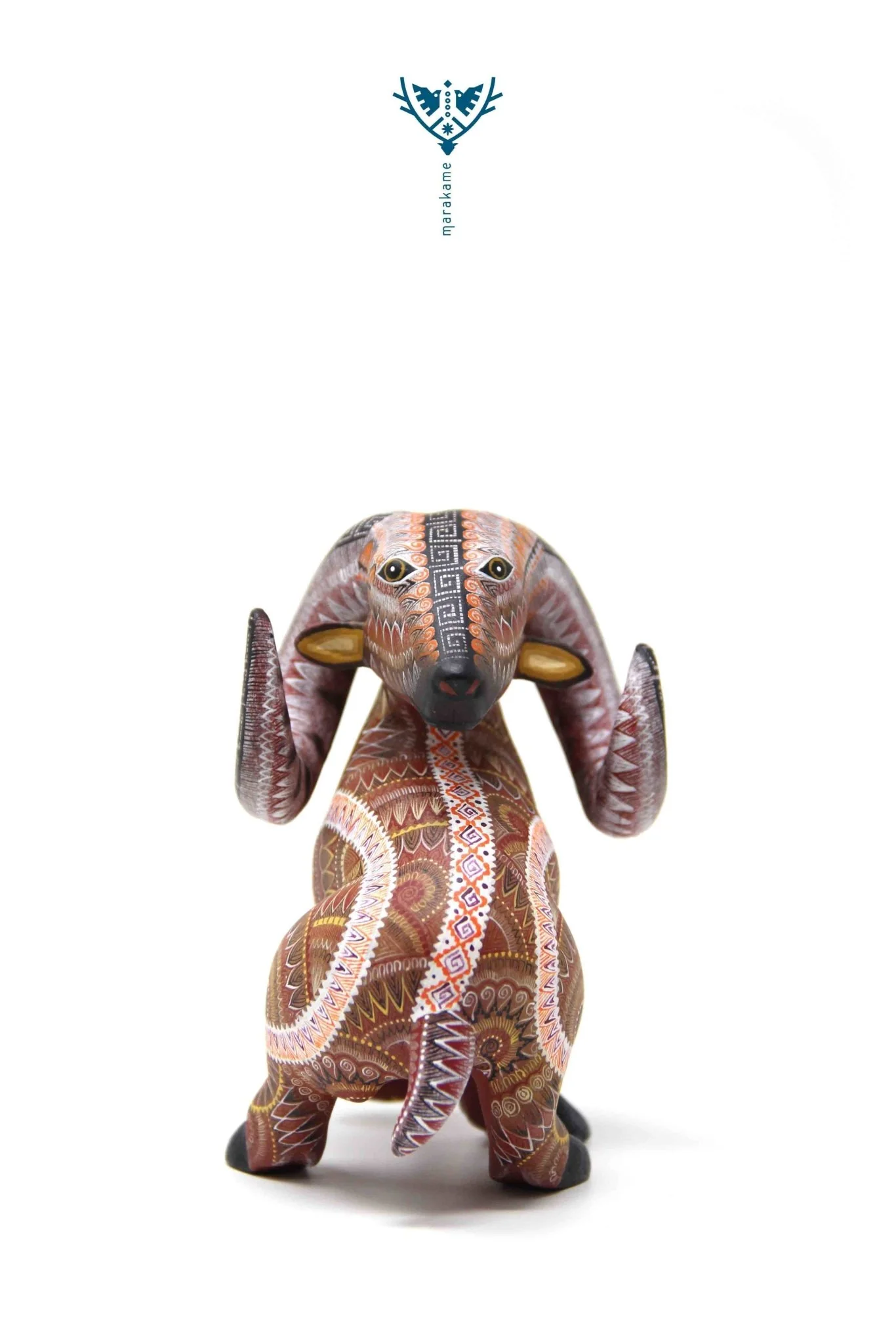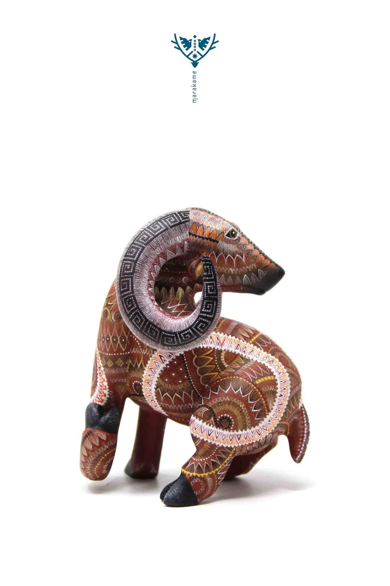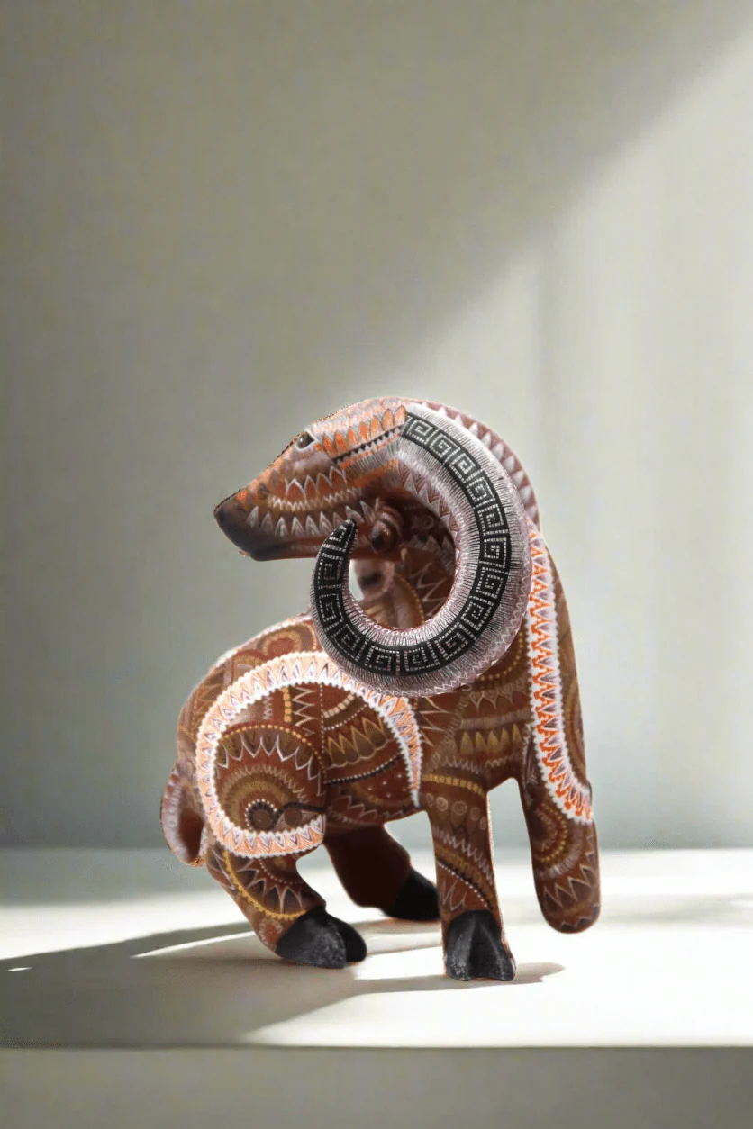 El cuerpo del Xil está decorado con detalles rojos que resaltan la textura y la forma natural de la madera. Los cuernos del alebrije están diseñados para llevar hacia abajo, lo que crea una sensación de profundidad y profundización. Los símbolos zapotecos en negro son una característica fascinante de este alebrije, ya que sugieren una conexión con la cultura y la historia de México. La presencia de estos símbolos también añade un toque de misticismo y espiritualidad a la pieza.