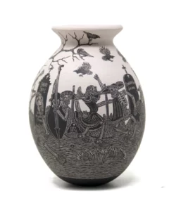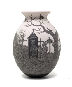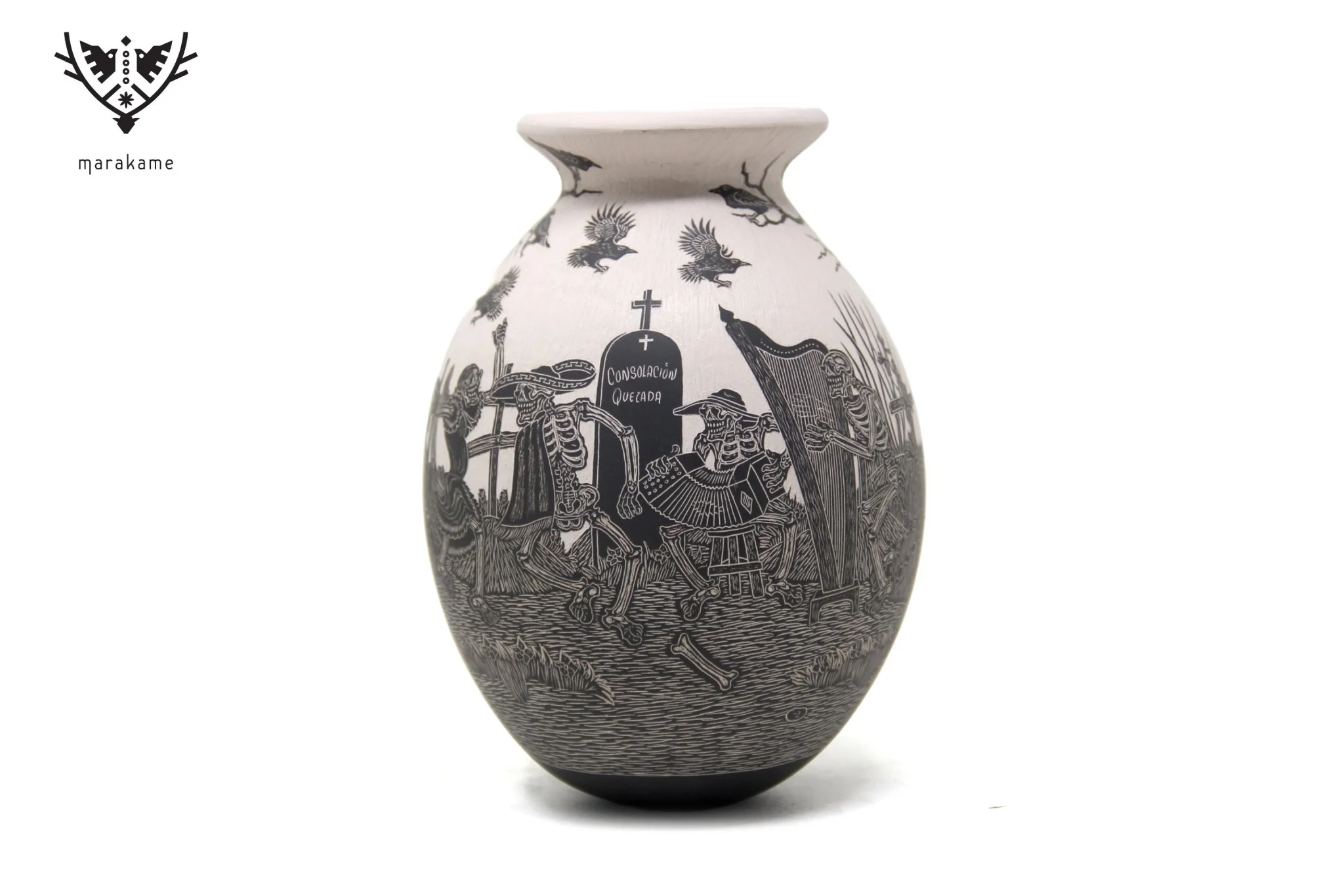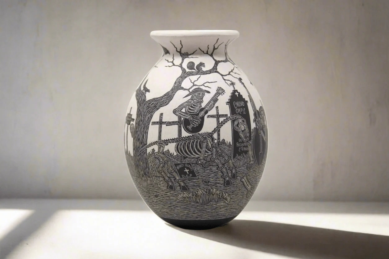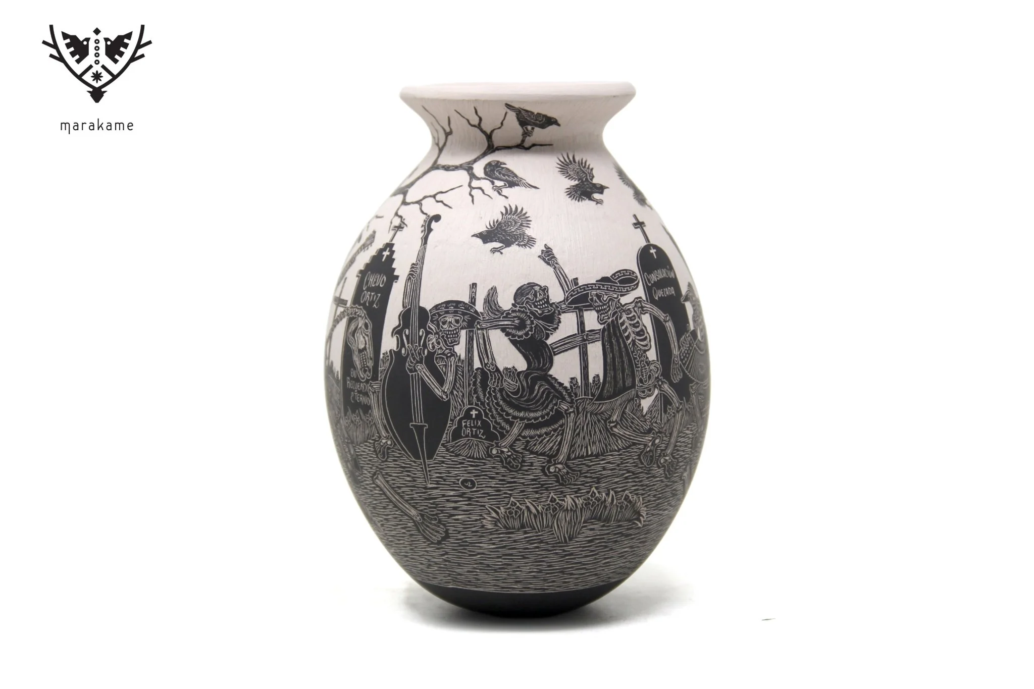 Esta hermosa pieza de cerámica es un homenaje a la tradición mexicana del Día de Muertos. Presenta una escena viva y animada, donde Catrines y Calaveras bailan y tocan música en un entorno rodeado de flores y otros símbolos tradicionales.