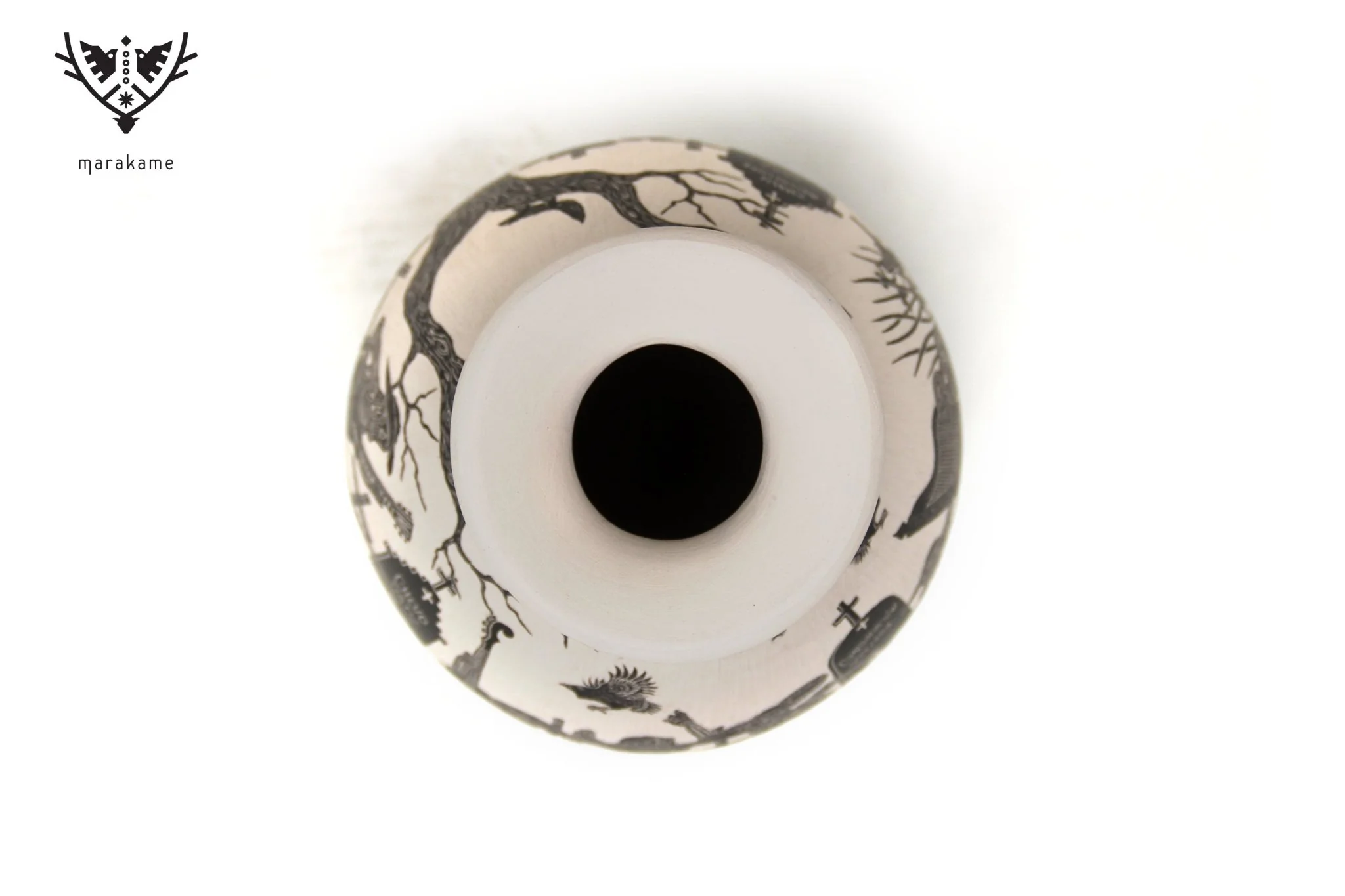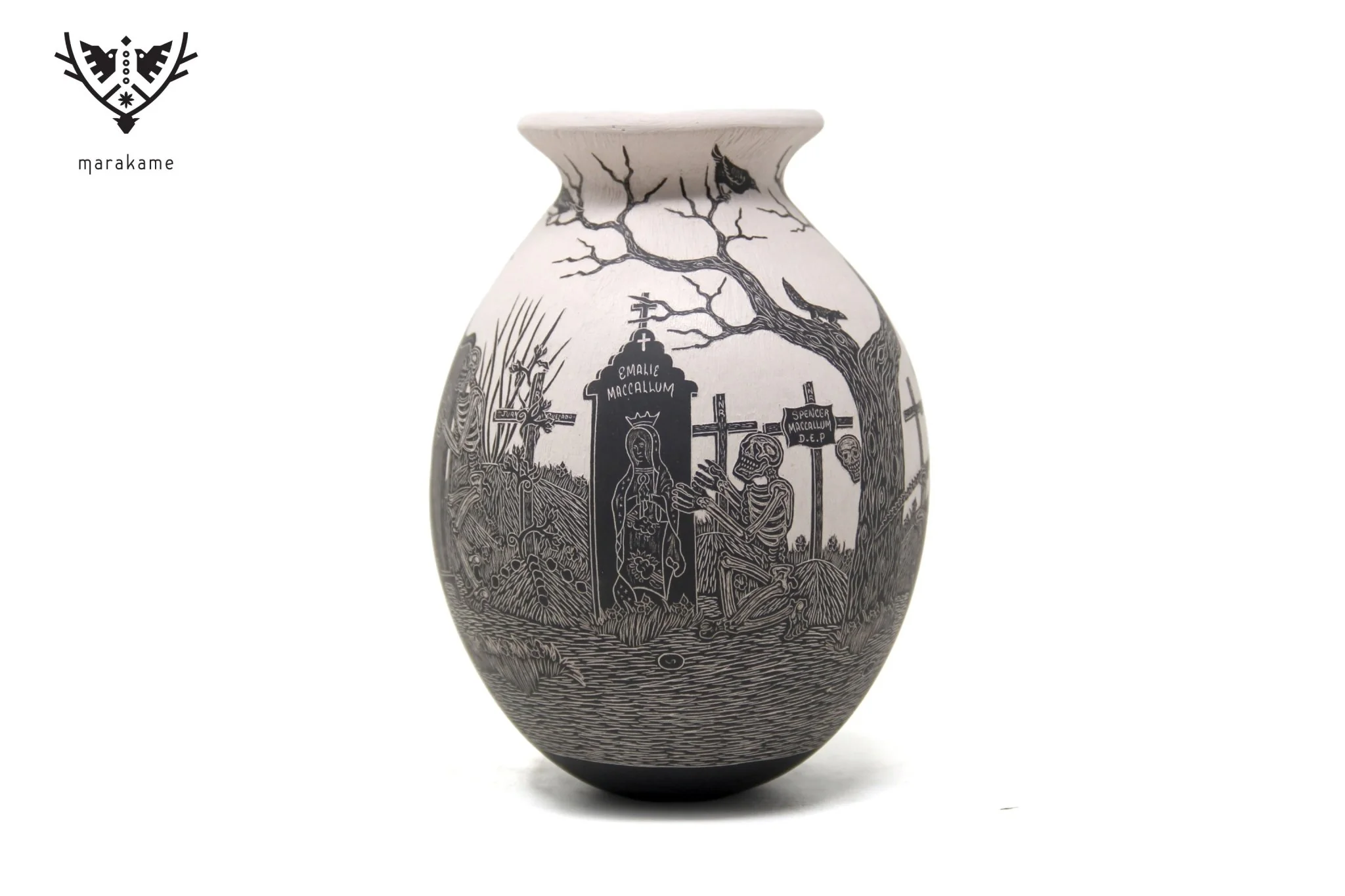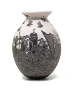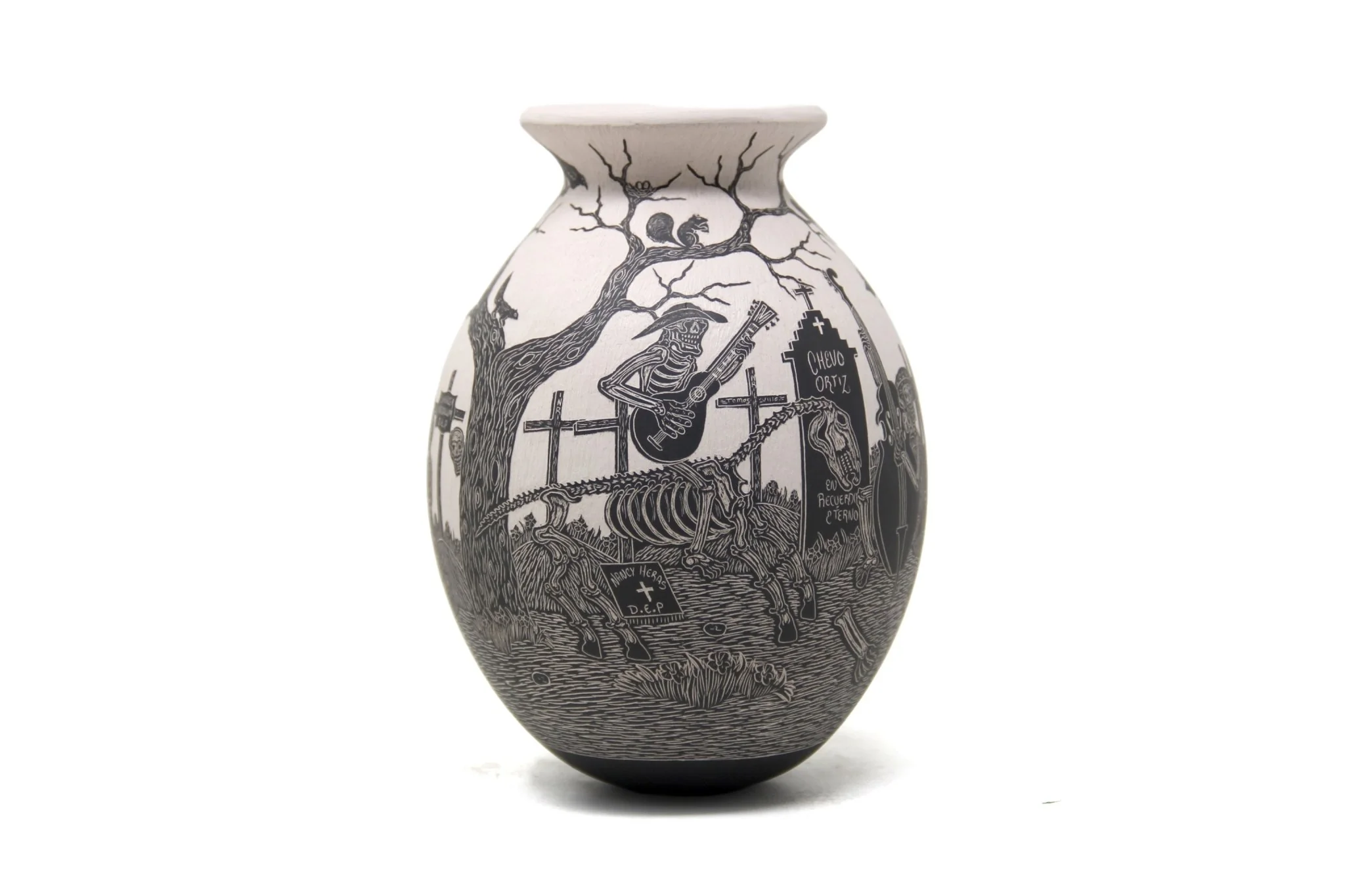 Esta hermosa pieza de cerámica es un homenaje a la tradición mexicana del Día de Muertos. Presenta una escena viva y animada, donde Catrines y Calaveras bailan y tocan música en un entorno rodeado de flores y otros símbolos tradicionales.