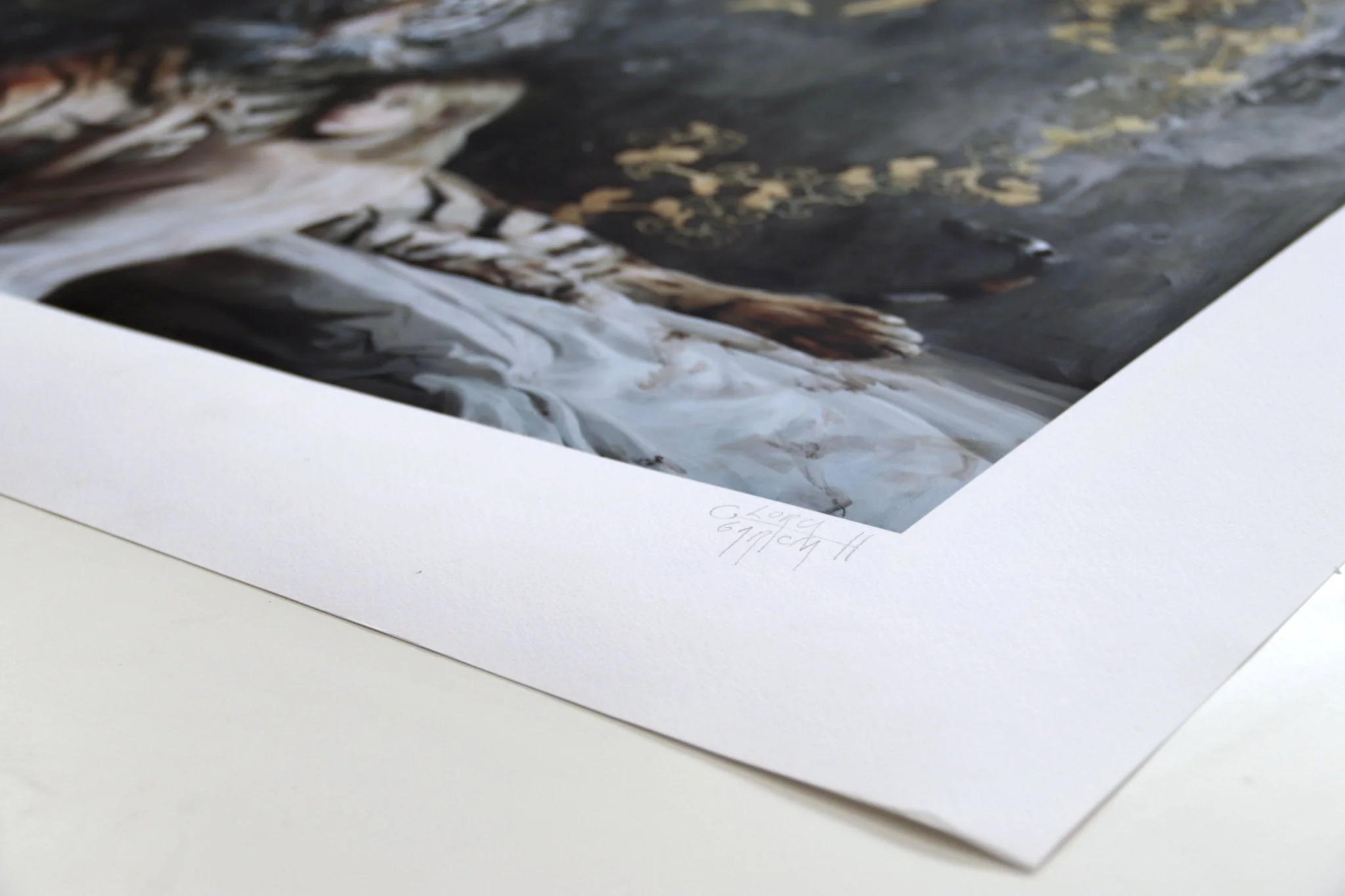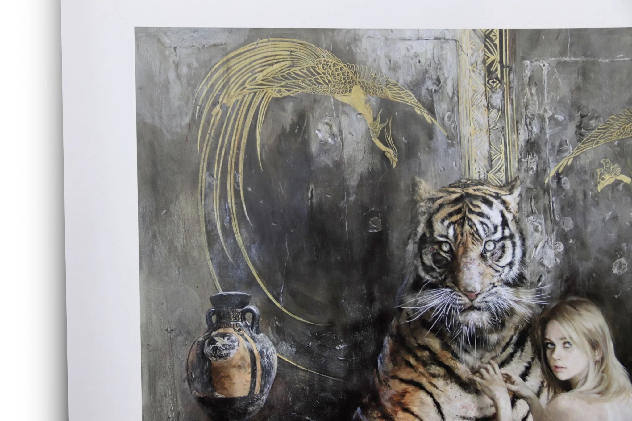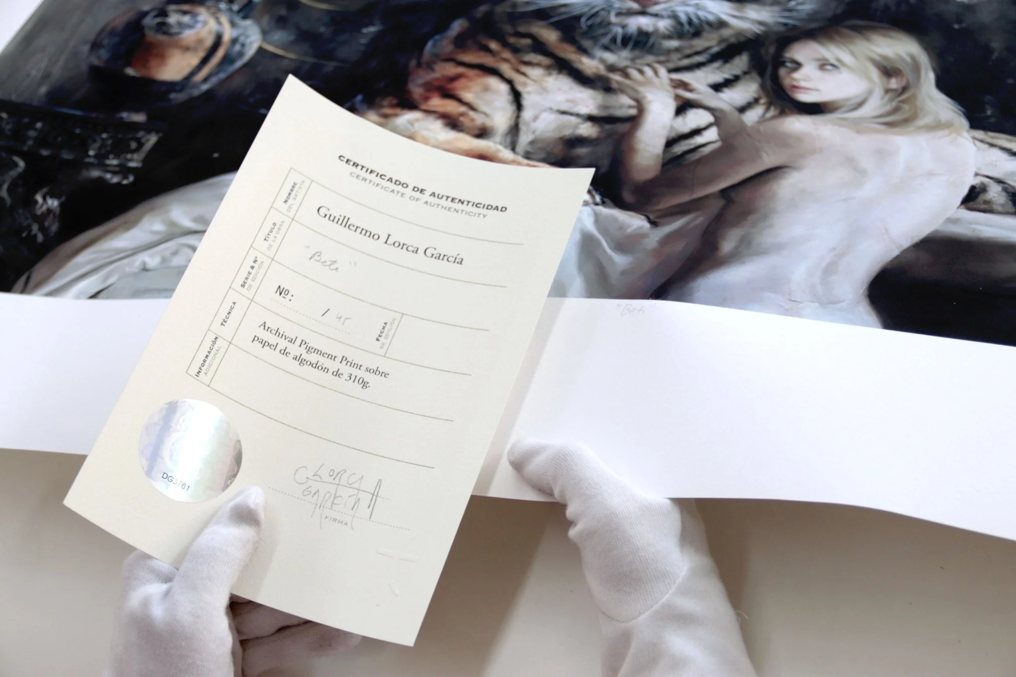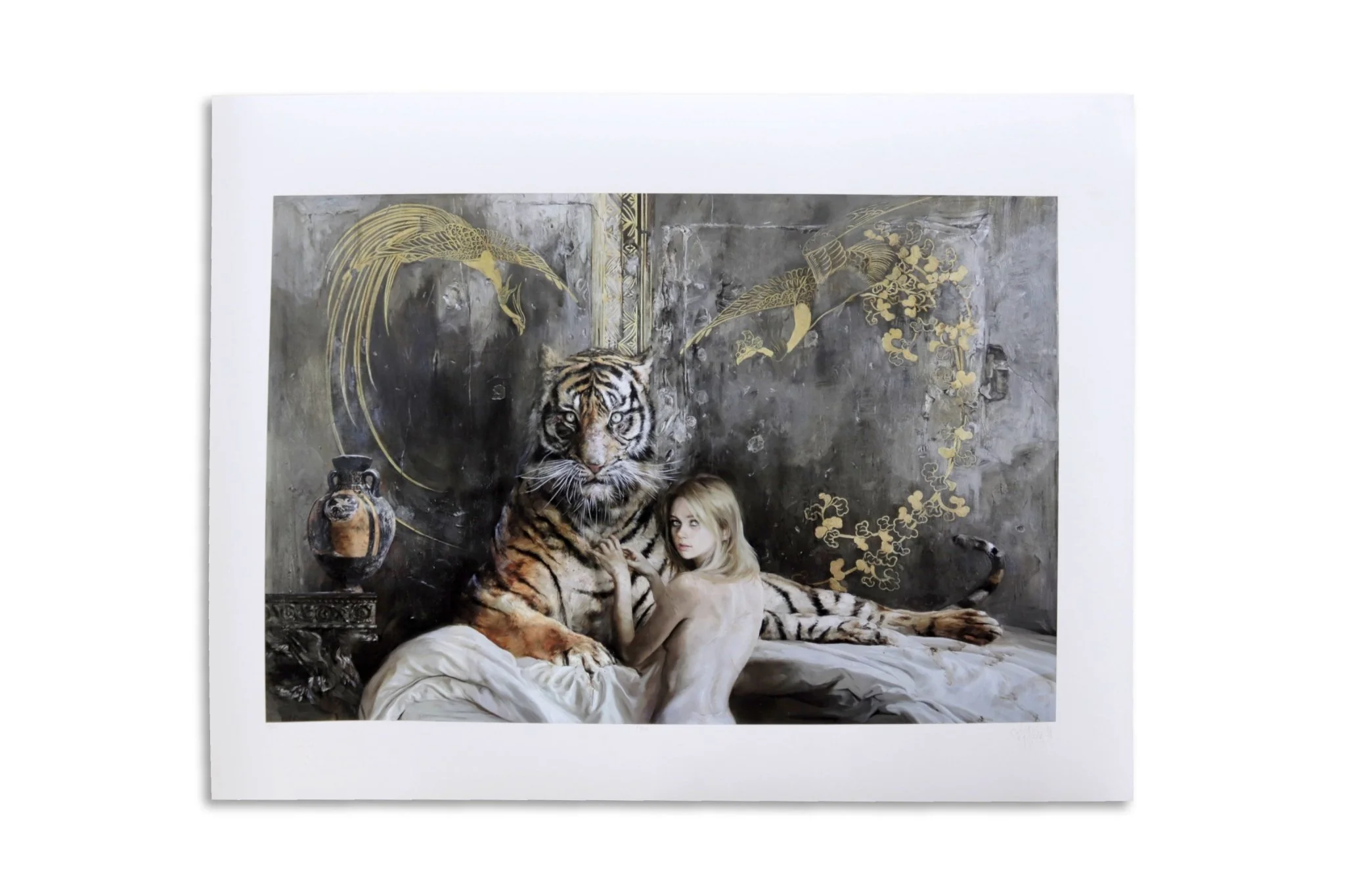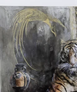 “Beti” presenta un cautivador equilibrio entre vulnerabilidad y poder. La joven, con su mirada introspectiva, contrasta con la intensidad del tigre, símbolo de fuerza y misterio. El fondo, con intrincados detalles dorados y tonos desgastados, crea un ambiente etéreo y onírico, característico del estilo de Guillermo Lorca. Esta obra es un homenaje a la conexión simbiótica entre la humanidad y la naturaleza, envuelto en la estética sublime del realismo mágico.