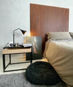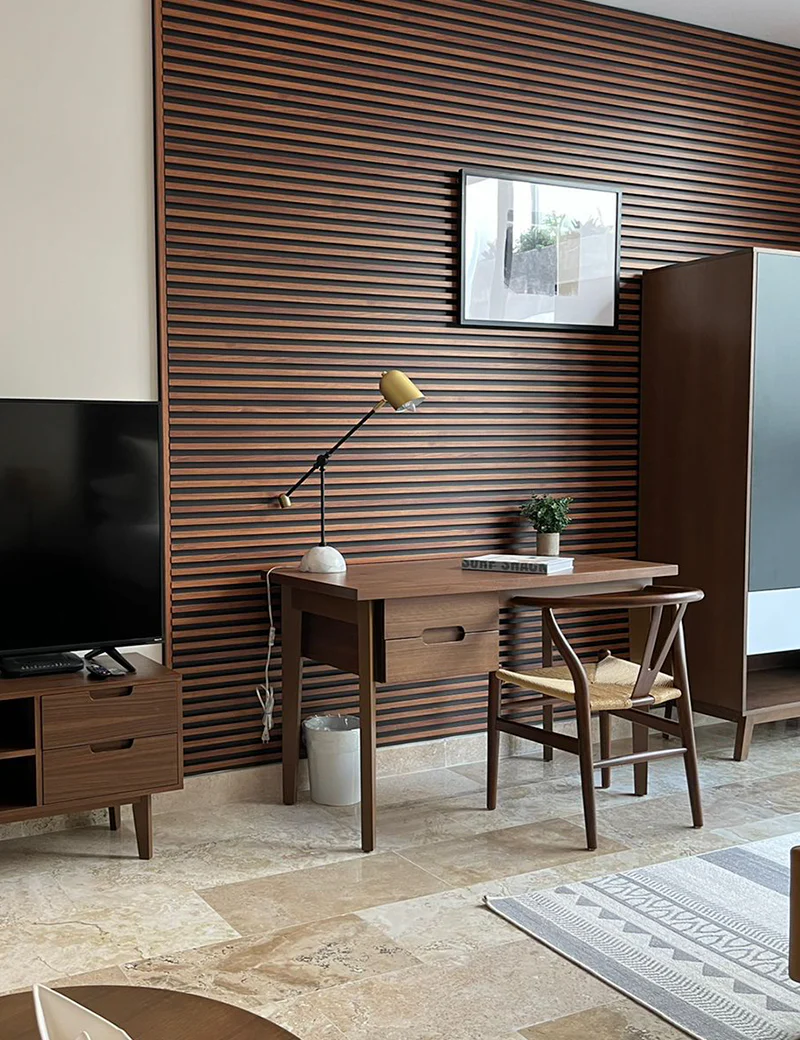 Lambrin WPC Interior Color Nogal Expreso Fondo Negro El panel WPC para interiores está compuesto por un 60% de resina de madera y un 40% de PVC, y está acabado con un revestimiento de impresión texturizado que le confiere el aspecto de la madera. La caja contiene 18 paneles, cubre un área de 2.90m x 2.90m, para un total de 8.4 m².