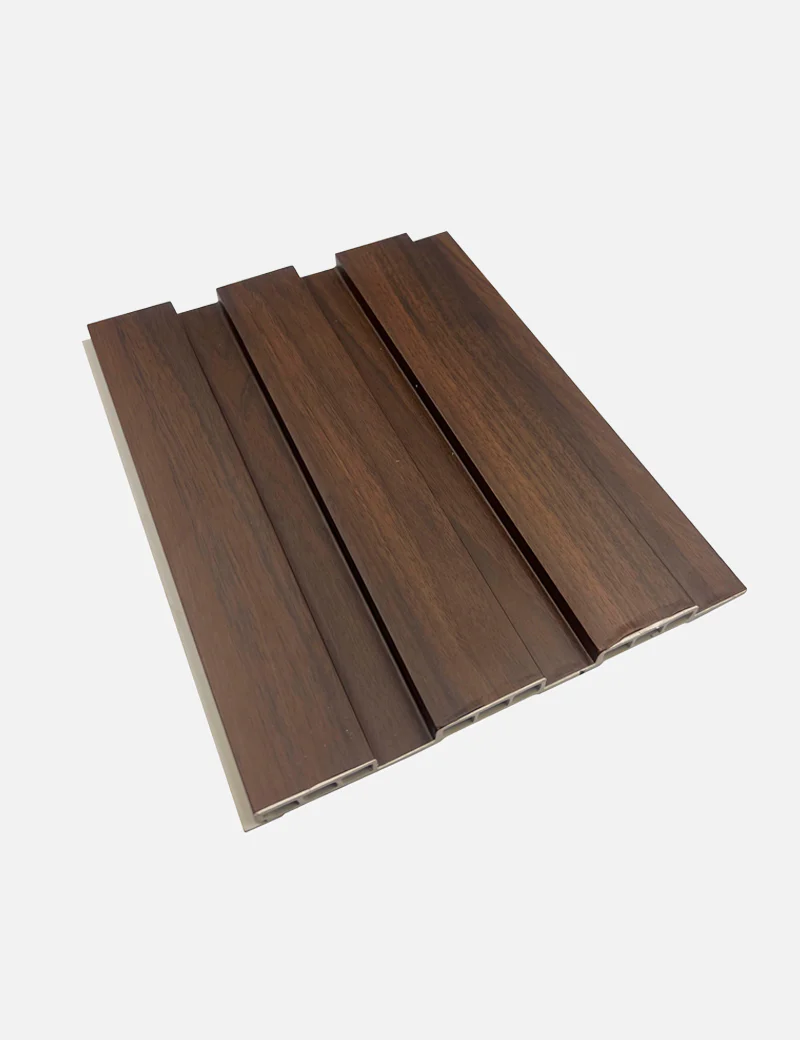 Lambrín Interior WIDE Color Nogal. El panel WPC para interiores está compuesto por un 60% de resina de madera y un 40% de PVC, y está acabado con un revestimiento de impresión texturizado que le confiere el aspecto de la madera.