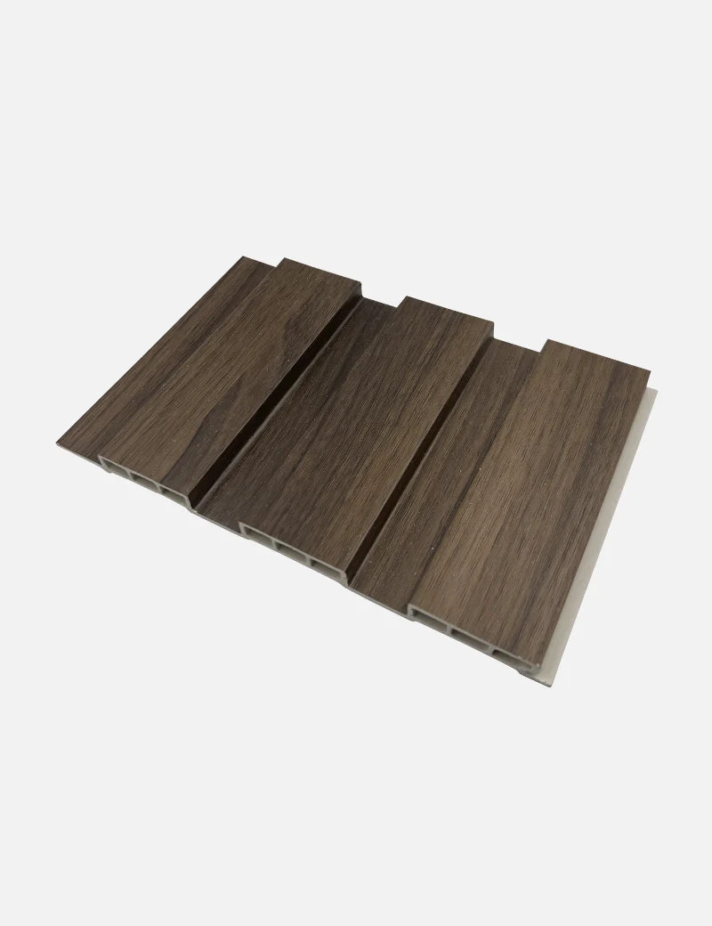 Lambrín Interior WIDE Color Nogal Expresso. El panel WPC para interiores está compuesto por un 60% de resina de madera y un 40% de PVC, y está acabado con un revestimiento de impresión texturizado que le confiere el aspecto de la madera.
