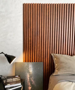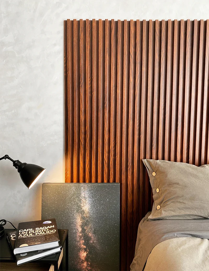Lambrín Interior WIDE Color Parota fondo negro. El panel WPC para interiores está compuesto por un 60% de resina de madera y un 40% de PVC, y está acabado con un revestimiento de impresión texturizado que le confiere el aspecto de la madera.