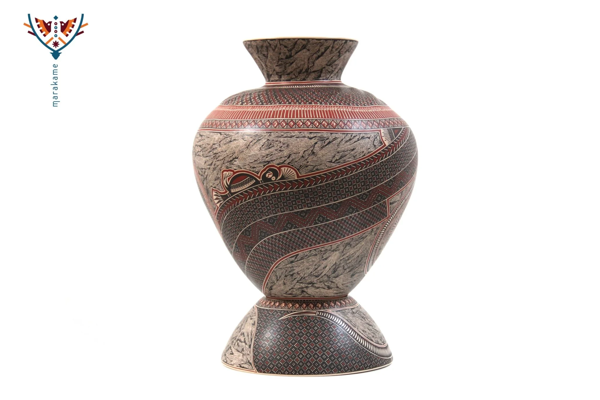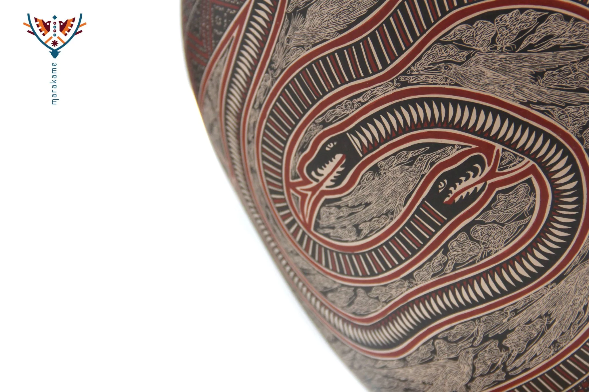 La escala grande de la pieza permite apreciar los detalles de los pajaros y la serpiente de manera aún más detallada, creando un efecto visual que es difícil de olvidar. Esta obra de arte cerámica es un verdadero tesoro para cualquier coleccionista, una pieza única y especial que puede ser disfrutada por aquellos que aprecian el arte y la cerámica.