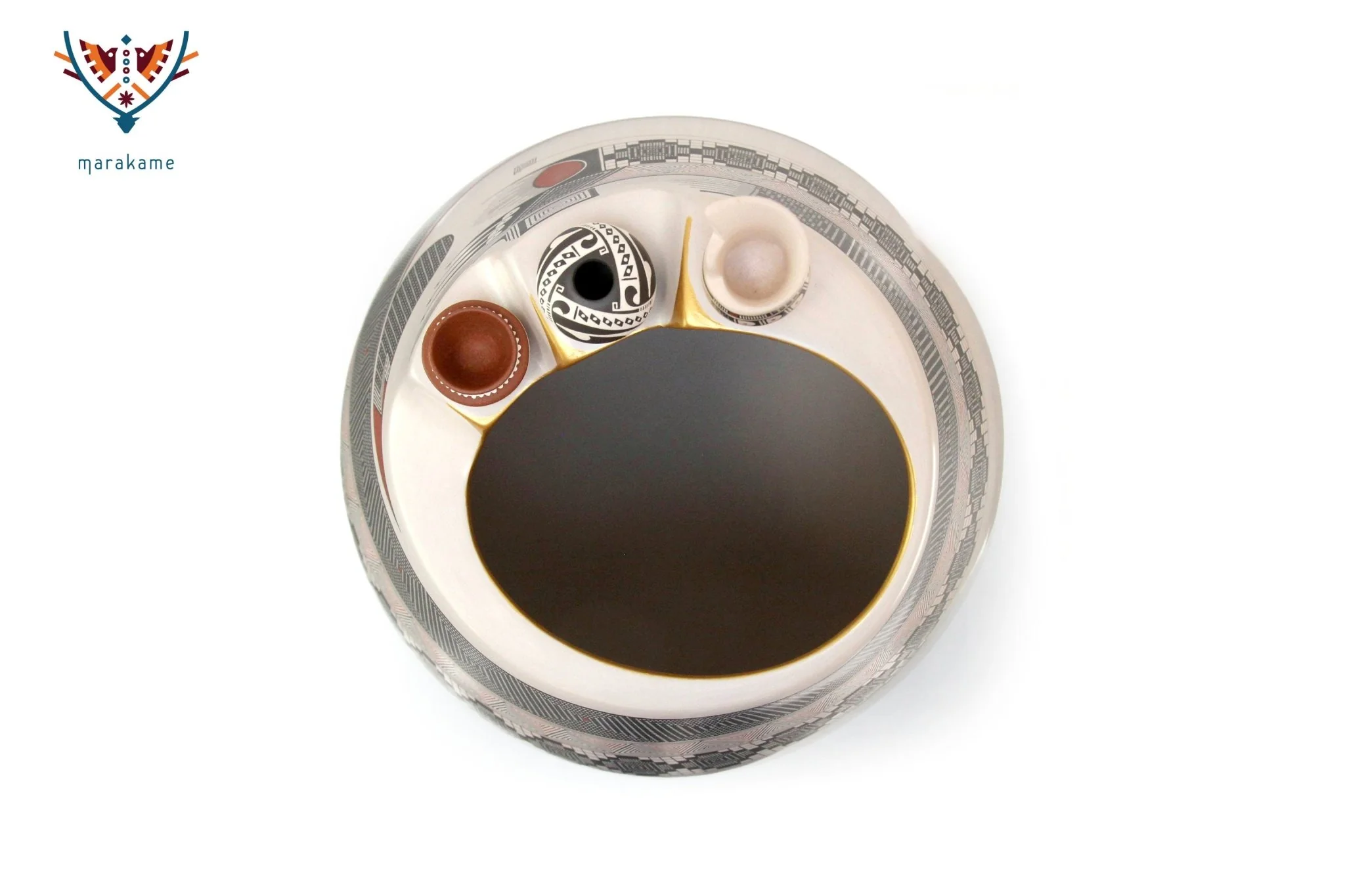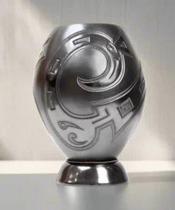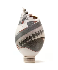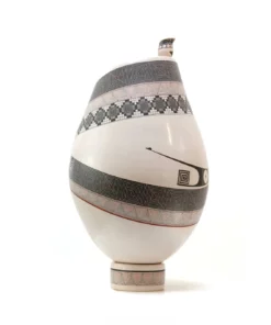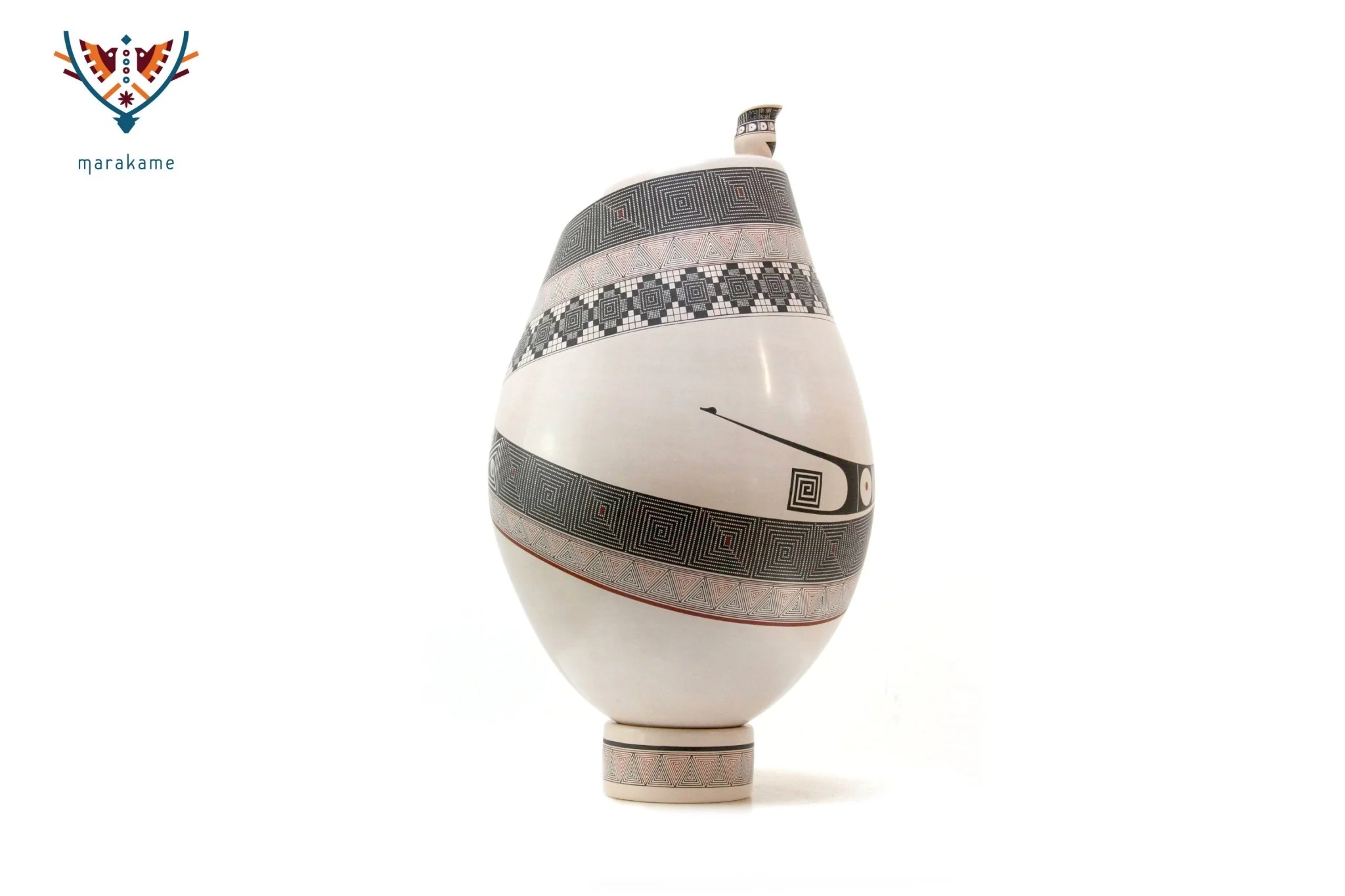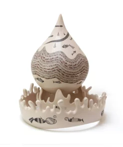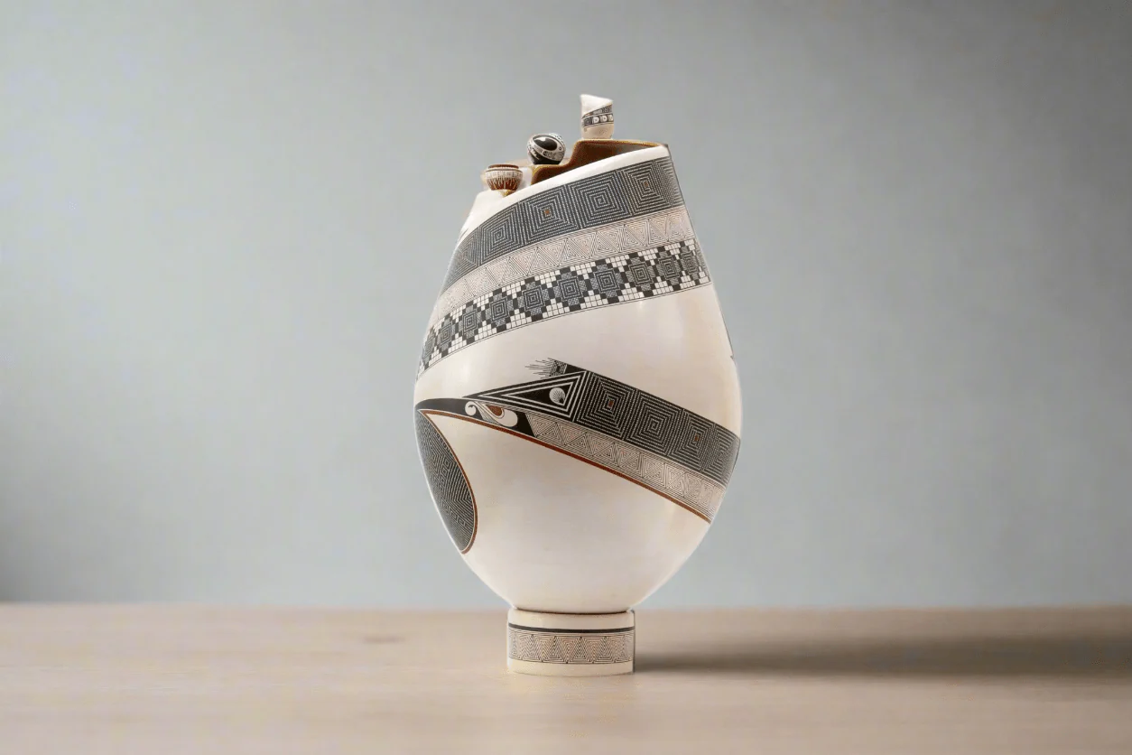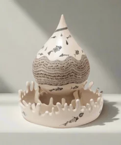 Esta impresionante pieza de cerámica es un verdadero trabajo de arte, con un diseño único y llamativo que invita a la contemplación. La parte superior de la pieza presenta una escalera elegante y delicada, con curvas suaves y rectas que se entrecruzan en un patrón interesante.