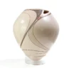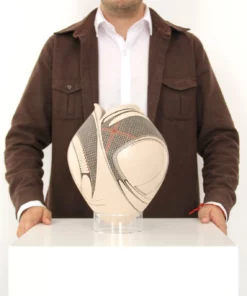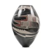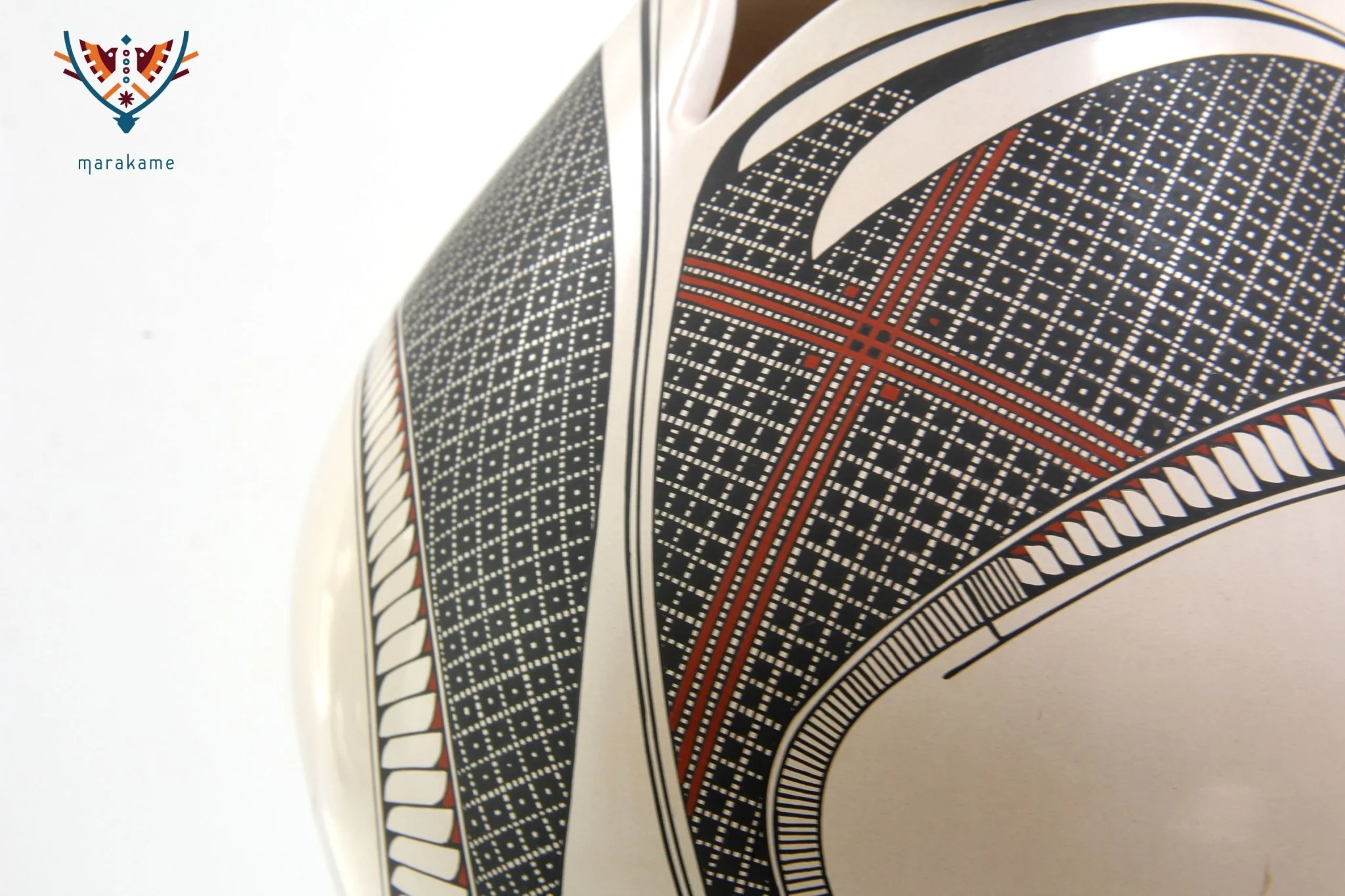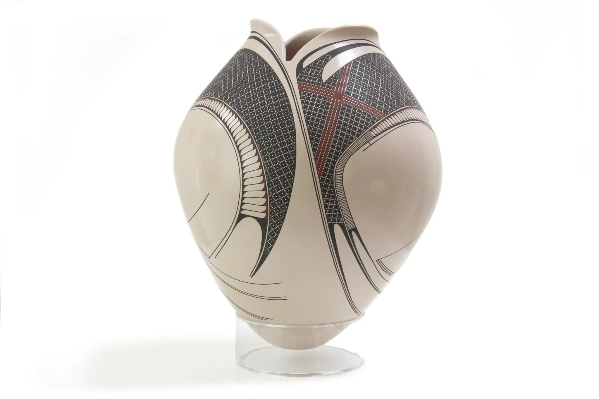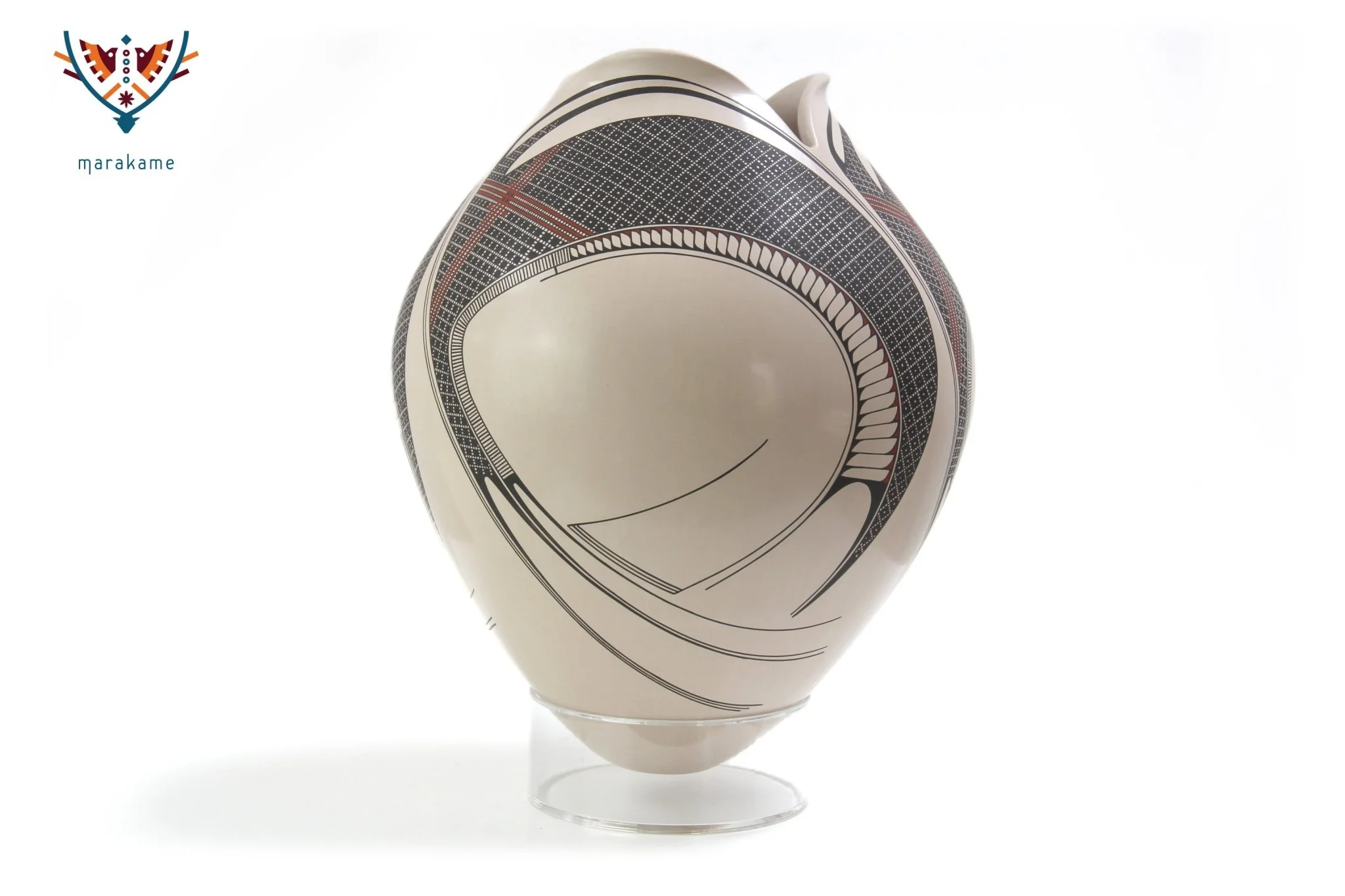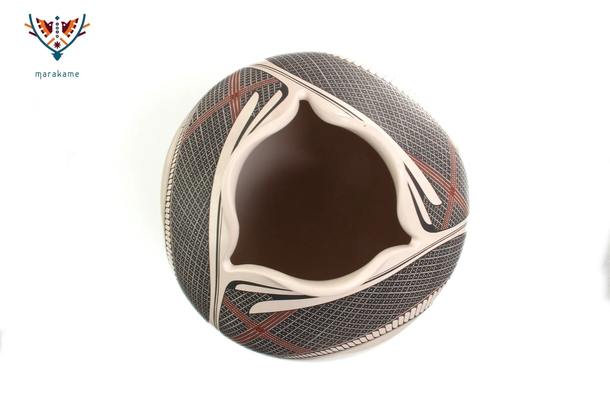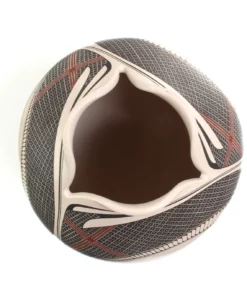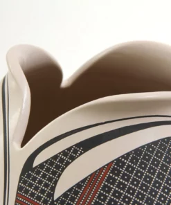 La boca de esta hermosa pieza se abre como un capullo, sus tres labios son carnosos e invitan a aproximarse. La pintura de Diego Valles enriquece los códigos conocidos de la cerámica de Casas Grandes, aportando un aire renovador de diseño, en el manejo de las líneas y el color. Una pieza extraordinaria.