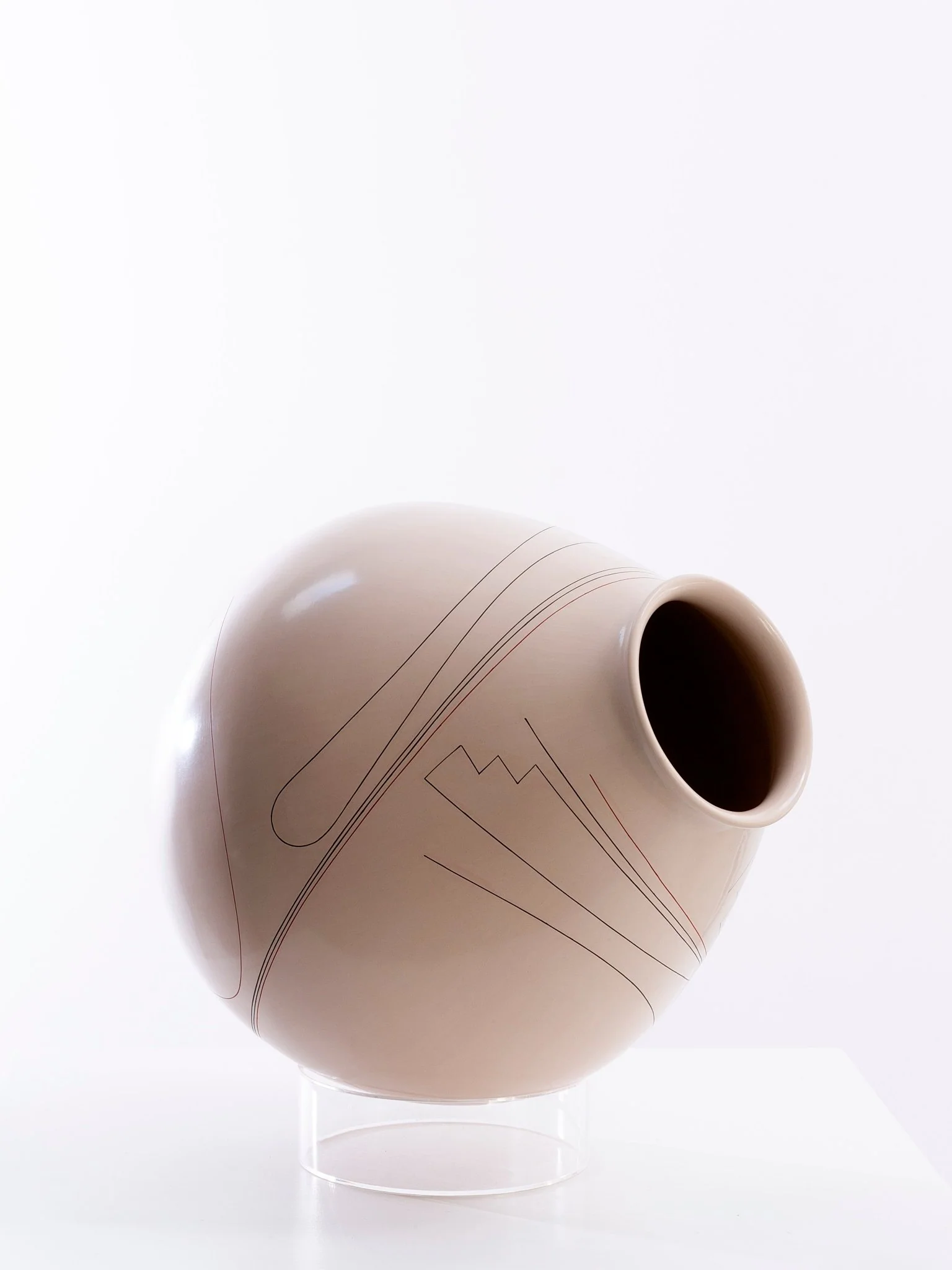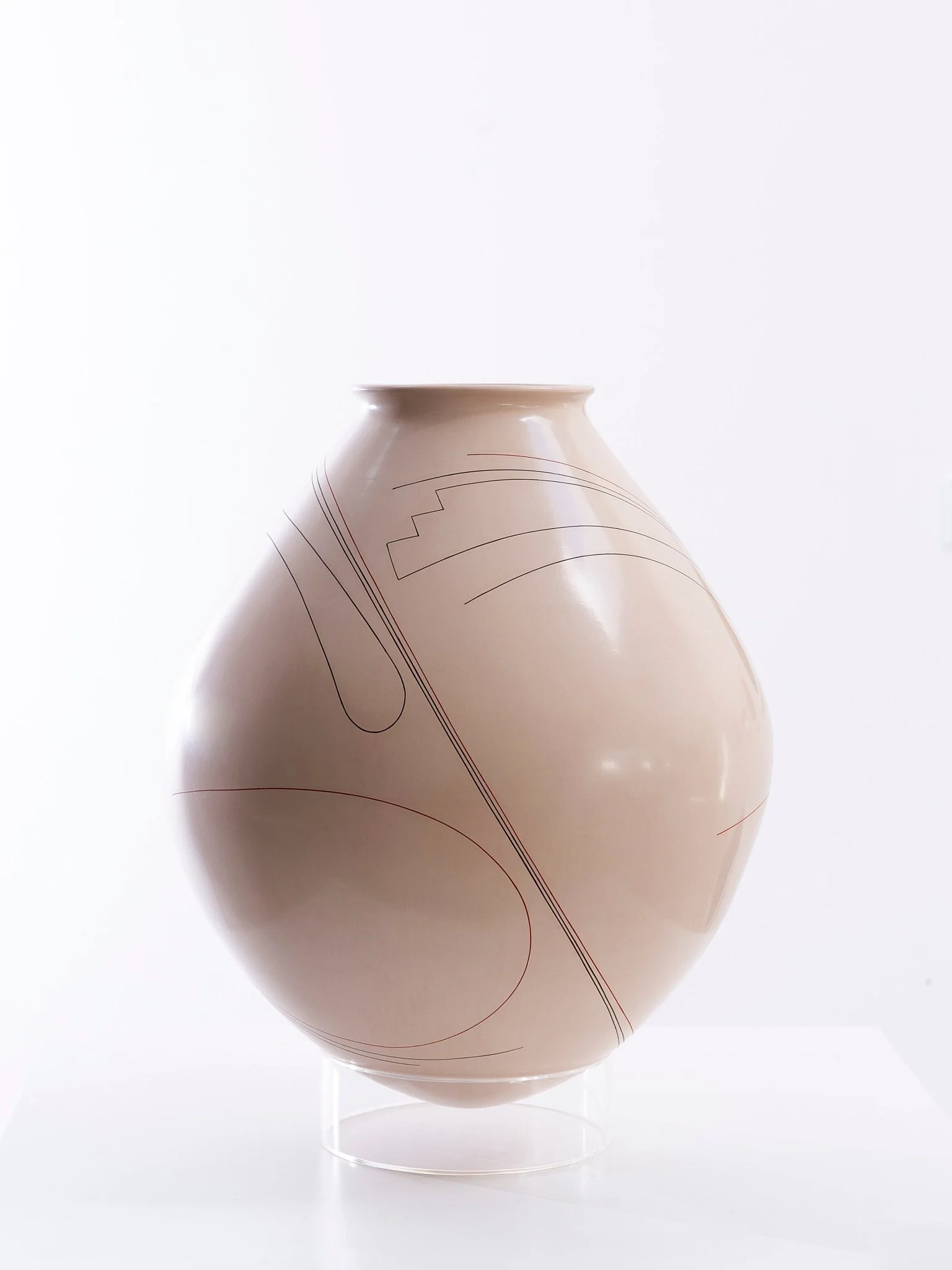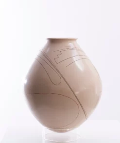 Las líneas curvas y ondulantes parecen flotar sobre la pieza, invocando el viento, el agua o la vida misma. La textura suave y las tonalidades cálidas del vidrio crean un contraste interesante con las líneas finas y negras, que se destacan como un dibujo en relieve. La cerámica es perfecta para aquellos que buscan una obra de arte contemporánea y única.