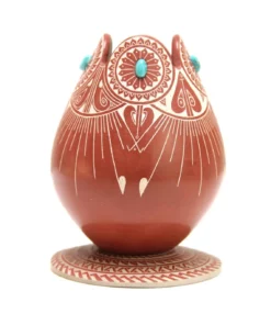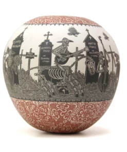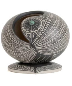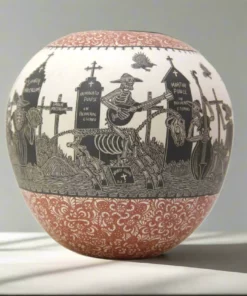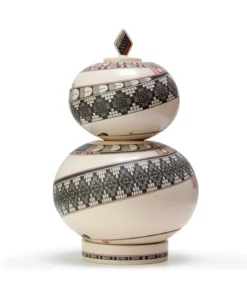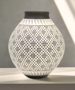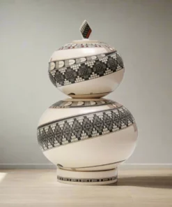 Esta hermosa pieza de cerámica presenta un diseño único y dinámico, gracias a las delicadas líneas que la cubren. Confeccionada en barro blanco vidriado, la cerámica muestra una serie de detalles finos y delgados pintados sobre la superficie, creando un efecto de movimiento y energía.