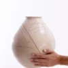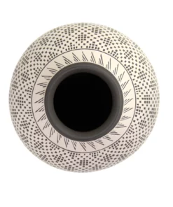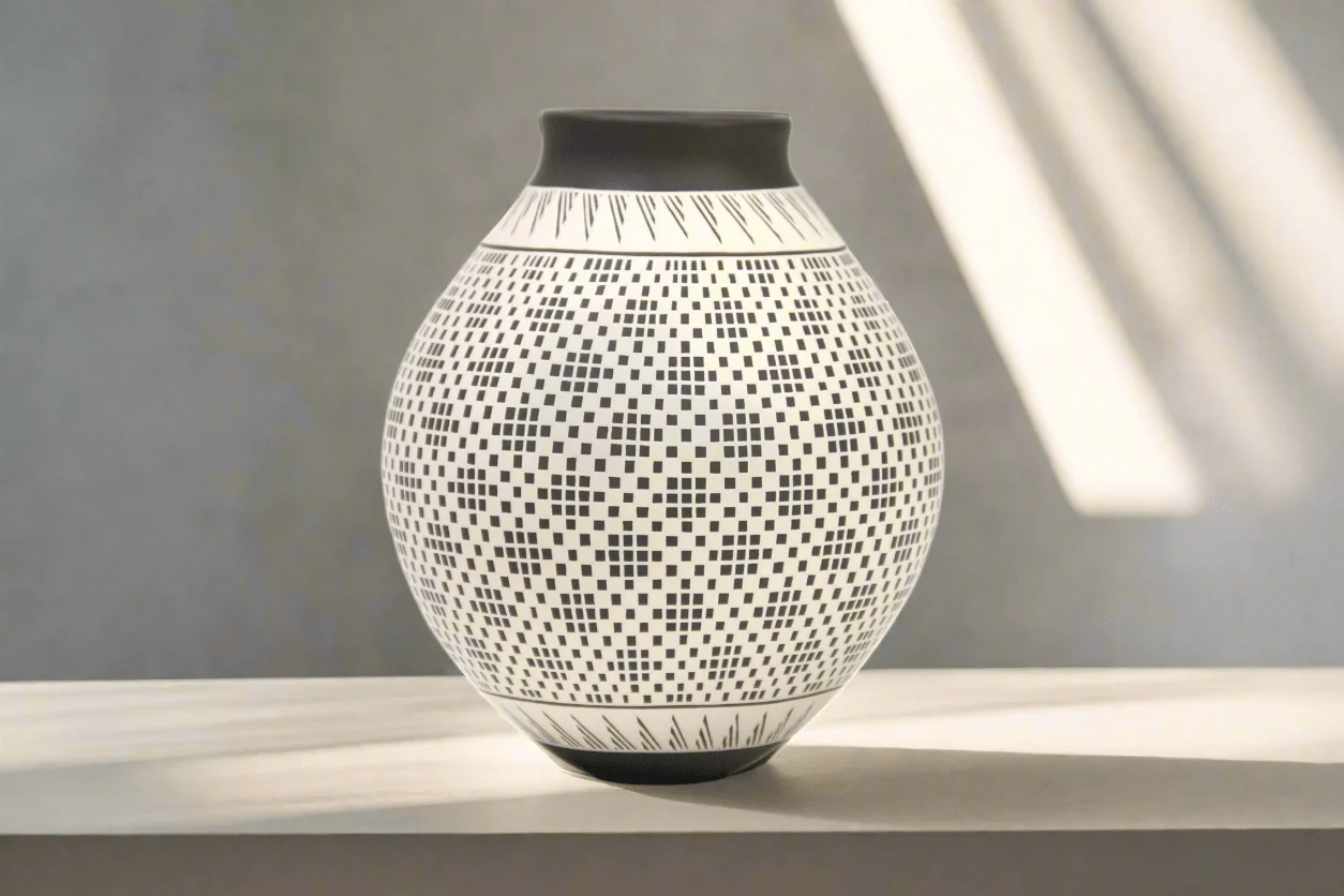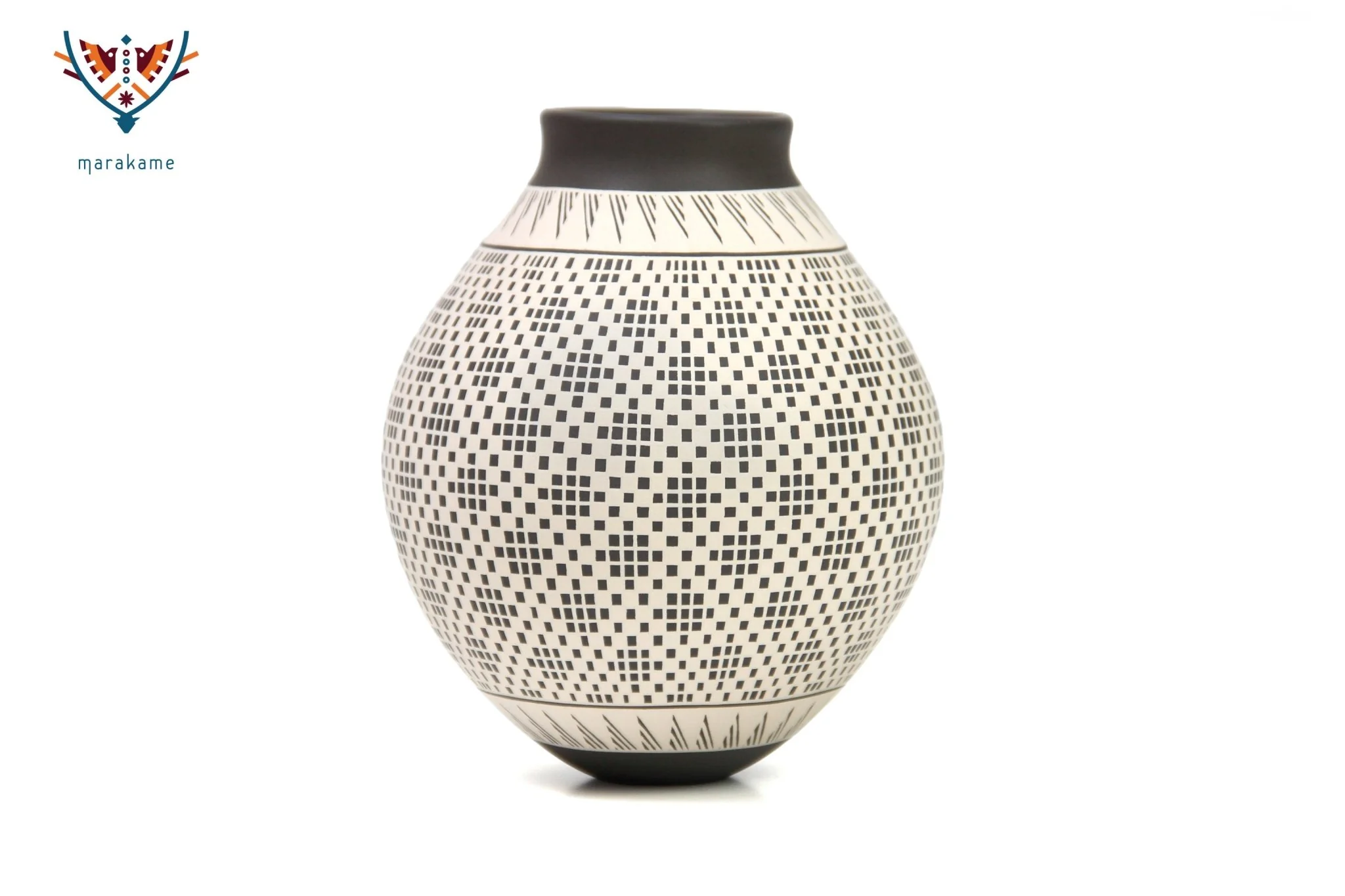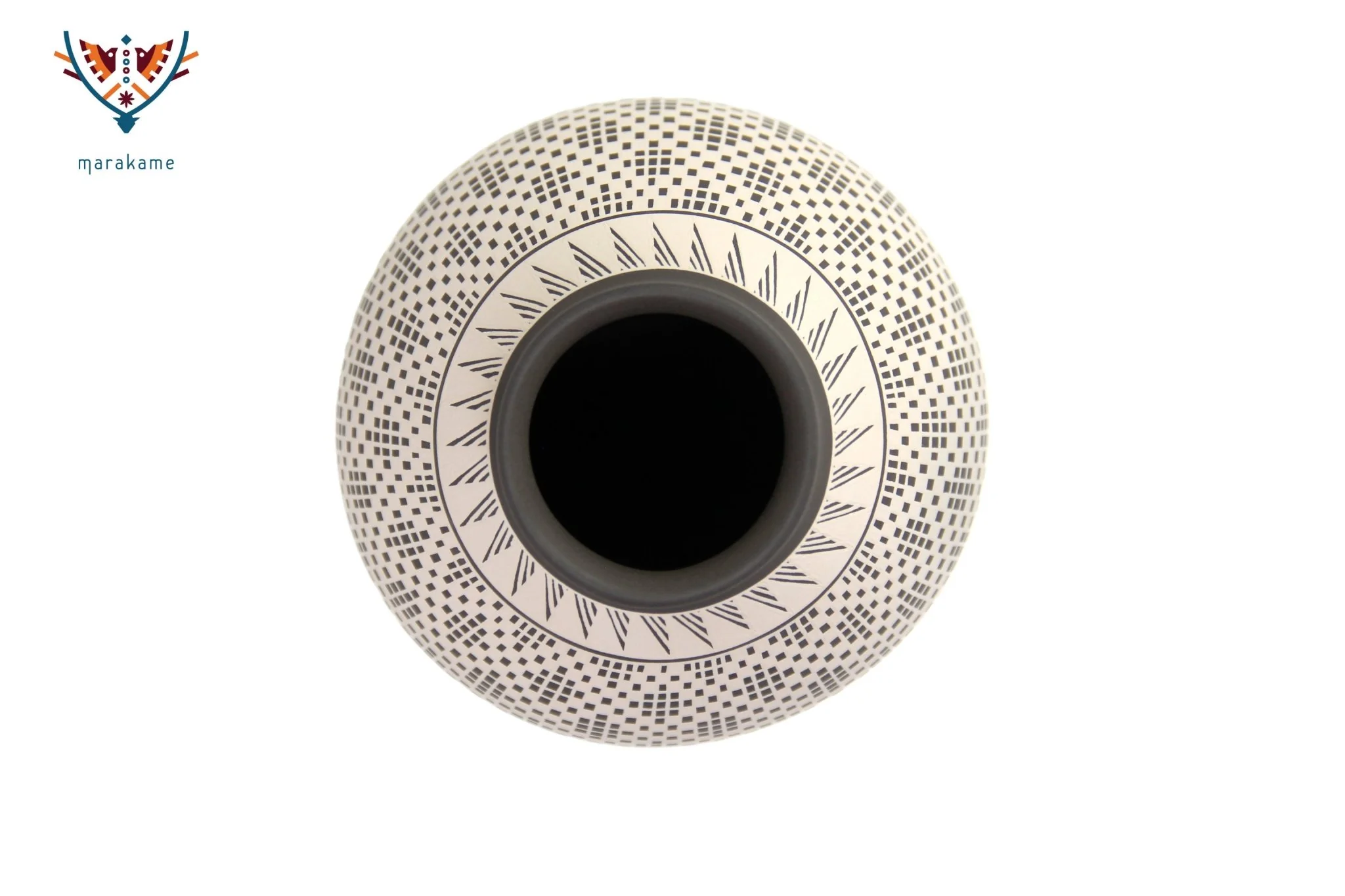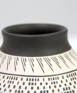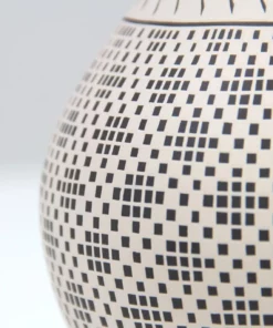 La textura suave y pulida de la cerámica resalta la belleza de los patrones geométricos. La forma pequeña y compacta hace que esta pieza sea perfecta como objeto decorativo para una estantería. Su elegancia y sobriedad hacen que sea un verdadero acierto para cualquier coleccionista de arte cerámico.