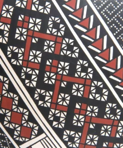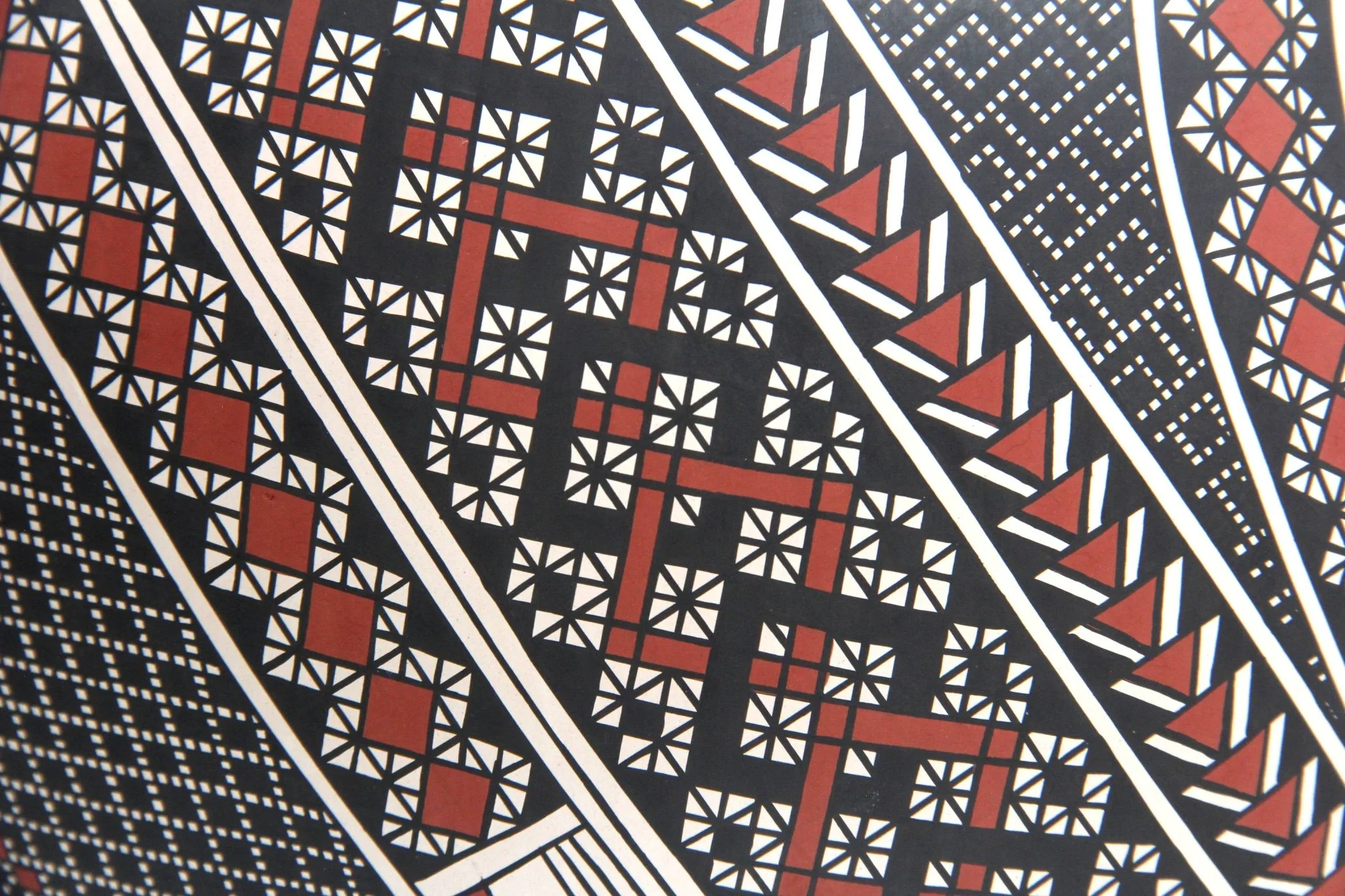 Un verdadero trabajo de arte, esta cerámica grande destaca por sus detalles geométricos en negro que se combinan con complementos rojos en un diseño que es a la vez rico y equilibrado. La cerámica grande presenta detalles geométricos en negro que cubren su superficie, creando un efecto visual rico y texturizado.