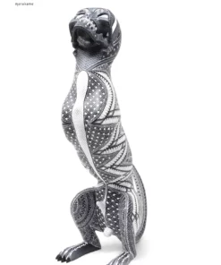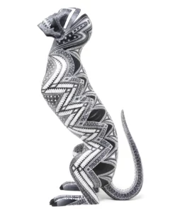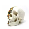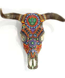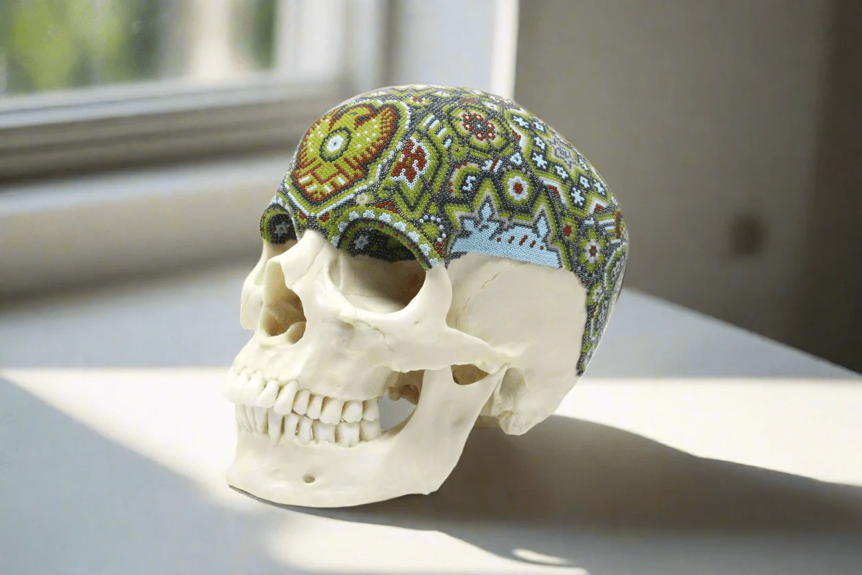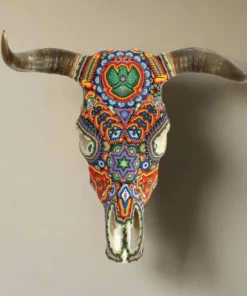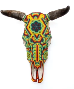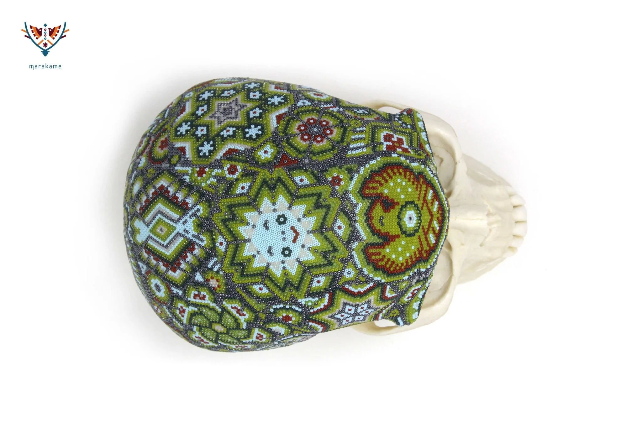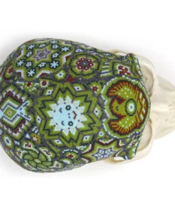 Este cráneo humano es un verdadero tesoro natural, decorado con chaquira solo en la parte superior, la chaquira se caracteriza por sus colores verdes naturales, que reflejan la conexión con la naturaleza y el equilibrio entre lo terrenal y lo celestial. En el centro de la chaquira se encuentra un relieve de una aguja, rodeada por venados azules durmiendo a los costados. Esta representación simbólica evoca la protección y la seguridad que se siente al tener un ángel vigilante cerca.