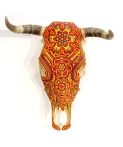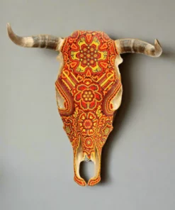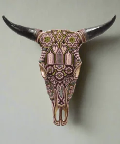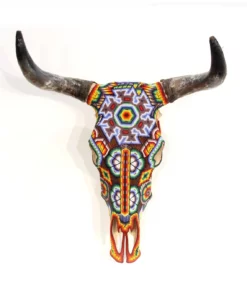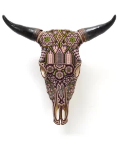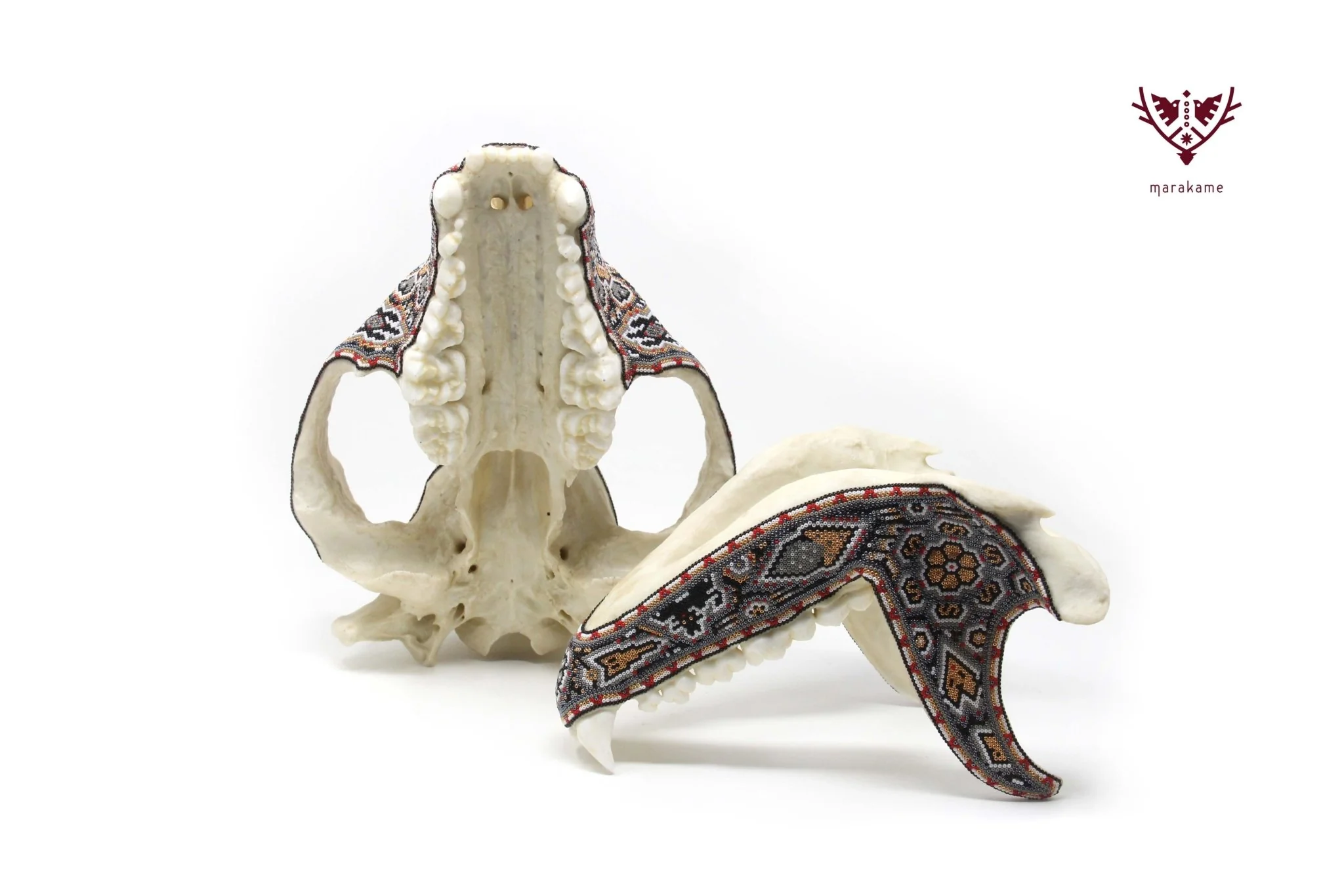 Este cráneo de oso panda es un verdadero tesoro natural, decorado con chaquiras en colores tierra que reflejan la riqueza y la sabiduría de la cultura zapoteca. El cráneo está cubierto de una serie de patrones y diseños vistosos que invitan a la contemplación y evocan el espíritu ancestral y protector de este gran animal. En el centro del cráneo, se encuentra un relieve de una aguja, rodeada por venados y otros símbolos de la cultura zapoteca, creando un efecto visual impresionante que combina la fuerza y la belleza.