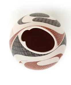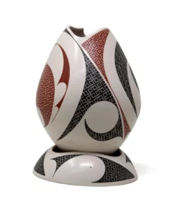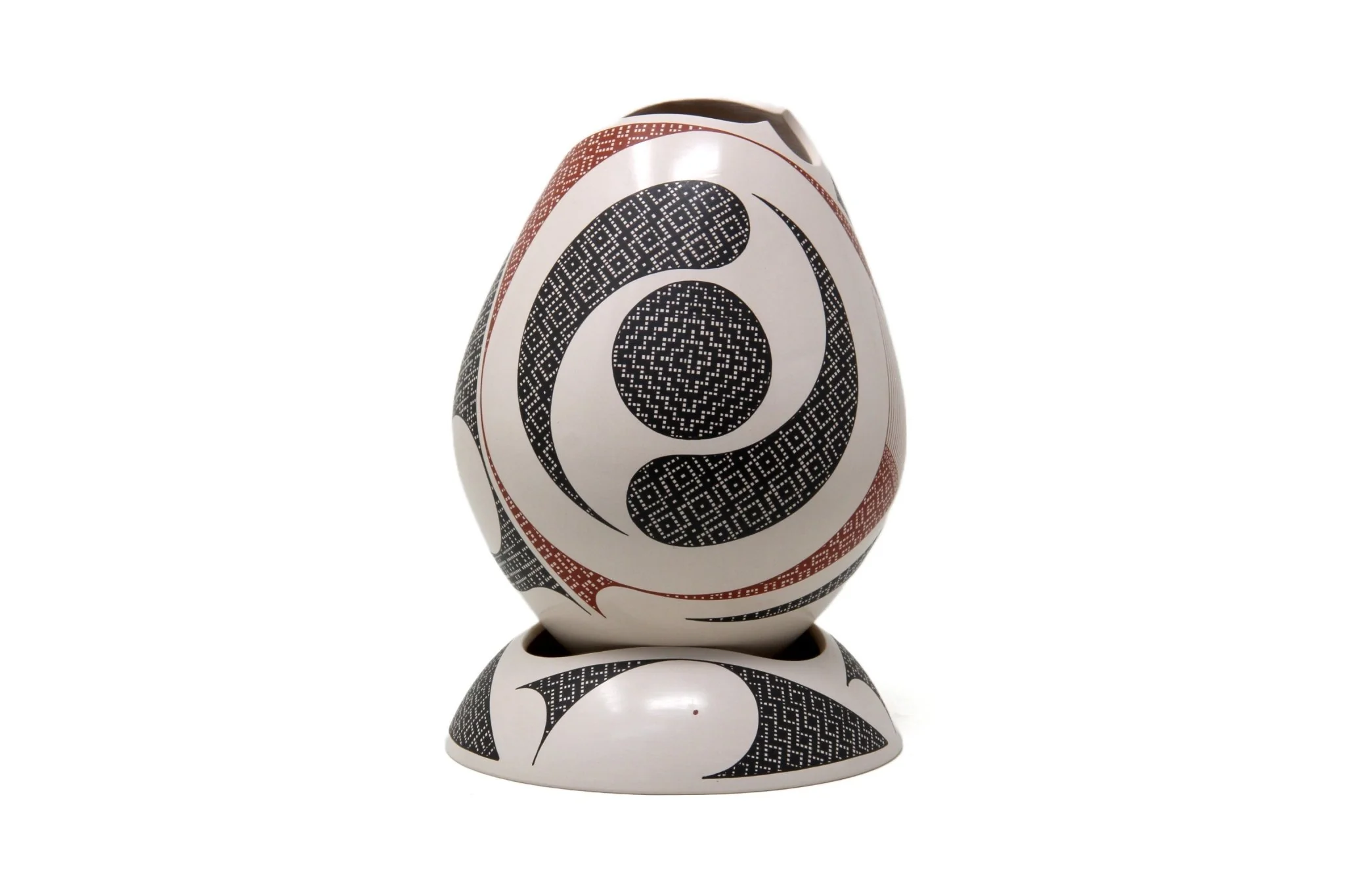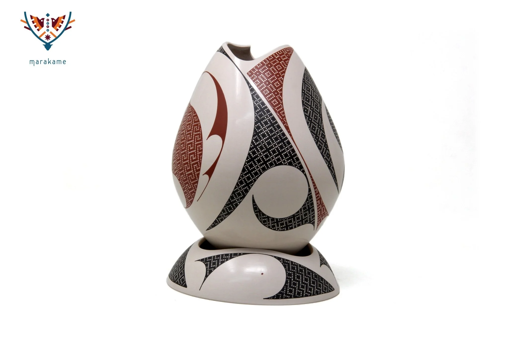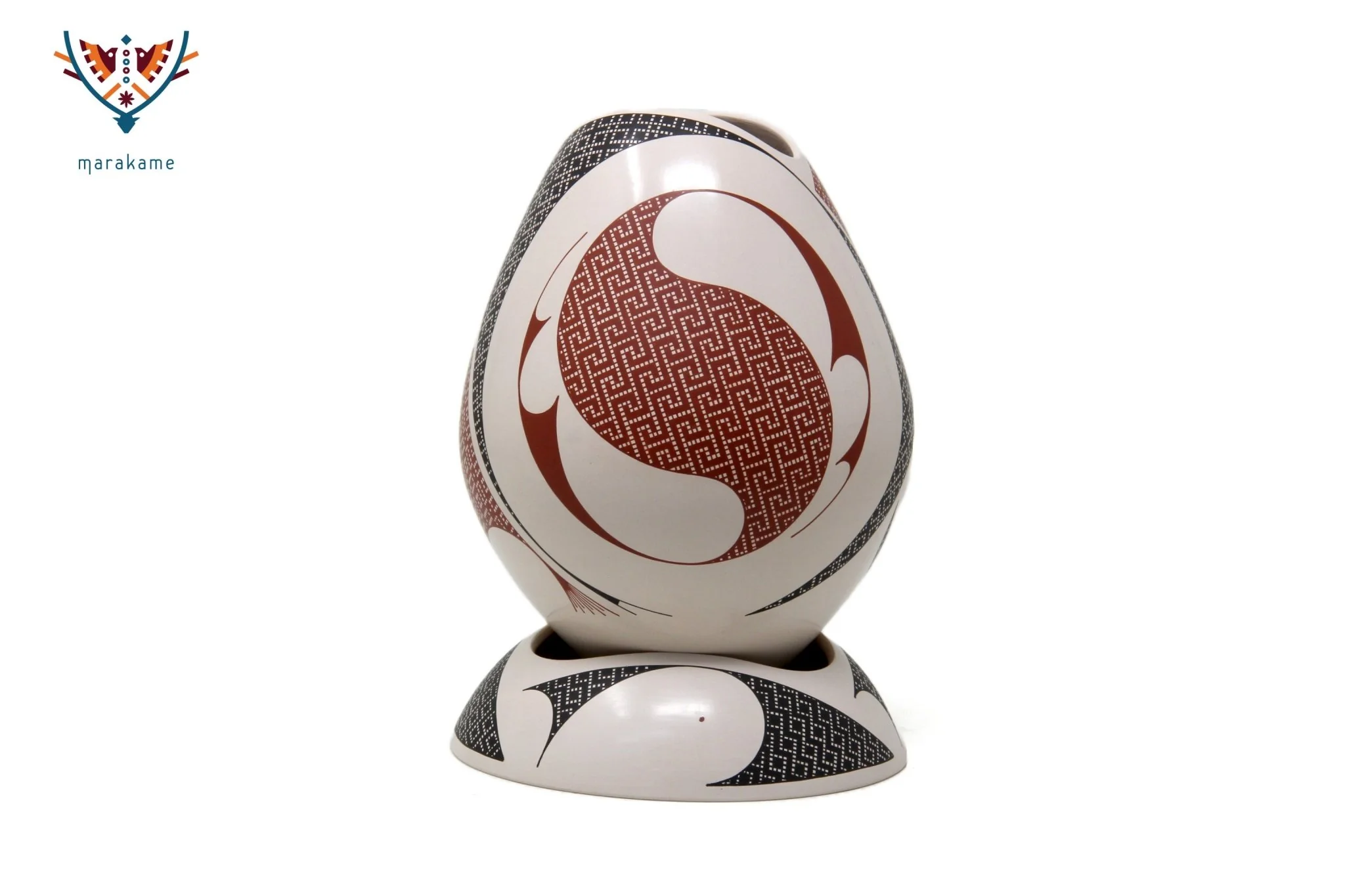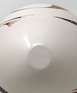 En la obra de Elías Peña, como de algunos otros ceramistas de Mata Ortiz, resulta sorprendente que lo que puede interpretarse como punteado en realidad es consecuencia de el manejo maestro de la línea. Esta pieza, compuesta de dos partes, es un ejemplo sin par del poder que el diseño puede aportar a una pieza que puede tomarse con las manos.