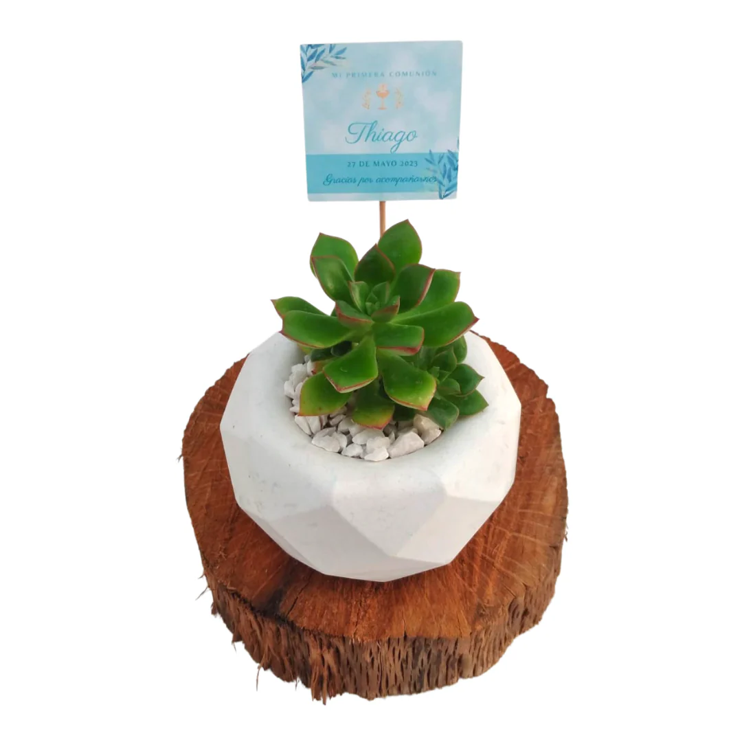 Suculenta baby de diferentes variedades en maceta mini de yeso en forma de diamante de 2.5 pulgadas de diámetro por 5 cm de alto, decorada con piedrita de mármol blanca. Incluye tarjeta personalizada por lo que nuestro equipo de diseño te contactará lo antes posible después de tu compra.
