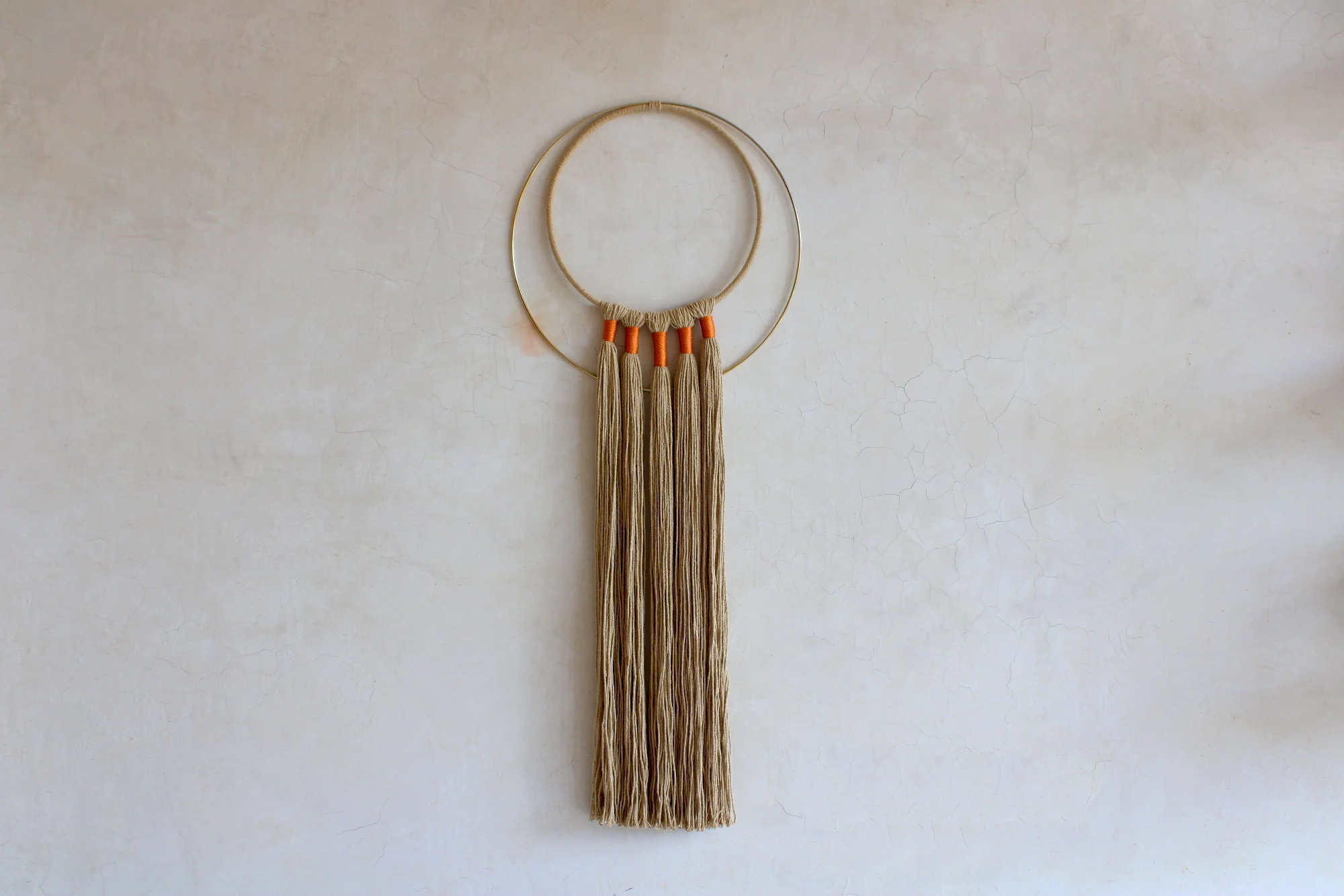 Decora con nuestro acento decorativo hecho de algodón, Nylon y aros metálicos. O su variante en Yute y henequén. Fabricado íntegramente a mano, por nuestros artesanos en Yucatán, México.