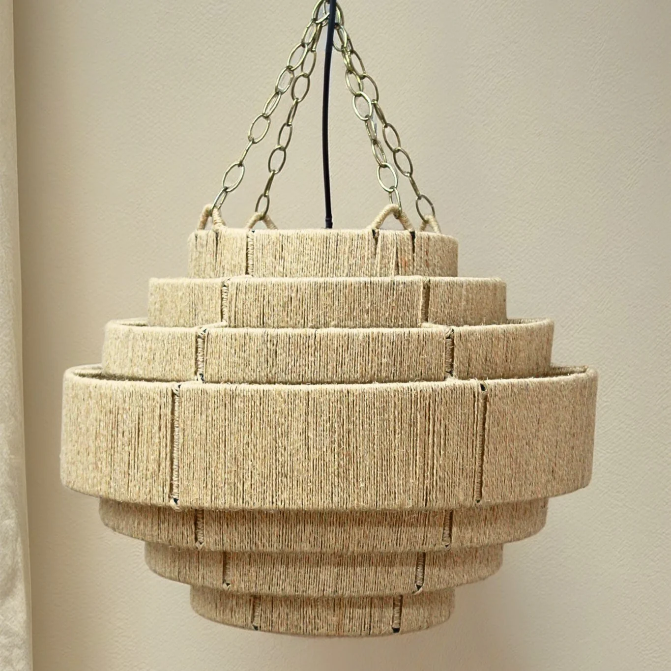 Nuestra pantalla para lámpara ESCALONADA . Está tejido a mano con hilo de henequén natural , fibra muy resistente en una estructura de herrería.