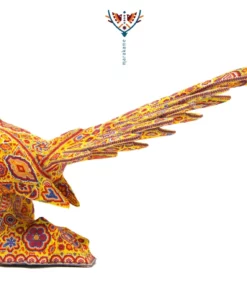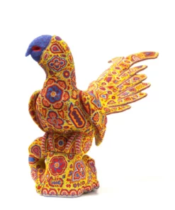 Los colores amarillos y rojos utilizados en la decoración le dan un toque de vida y energía a la pieza, mientras que los detalles en azul vibrante le agregan una profundidad y una dimensión adicional. La guacamaya sentada como apreciando la vista crea una sensación de tranquilidad y paz, como si estuviera disfrutando del momento y la belleza de su entorno.