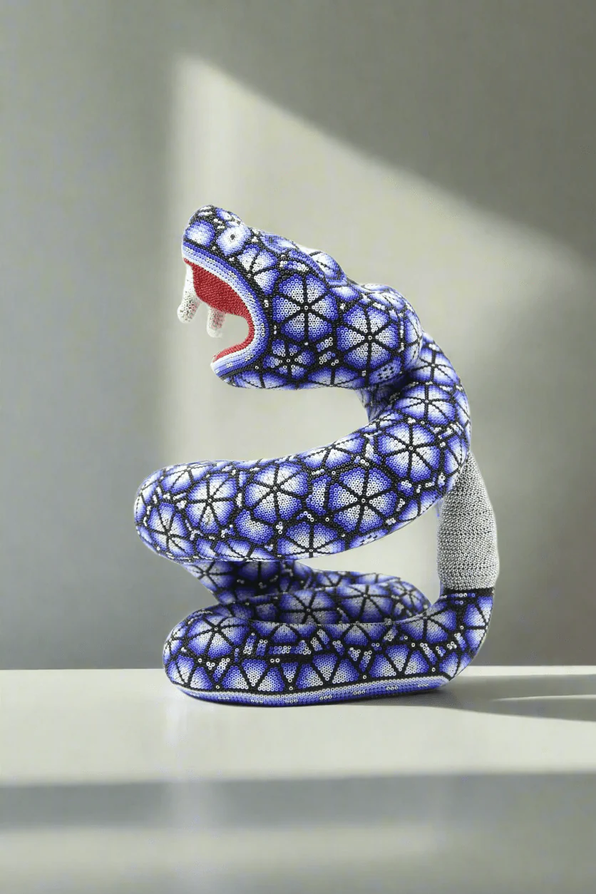 ◇ Técnica: Micro chaquira de cristal calibrado 13/0 prensada con cera de campeche mejorada sobre talla de madera de copal.