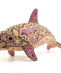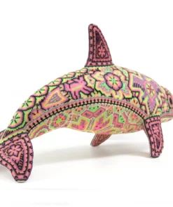 La Vaquita Marina es una obra maestra de arte ceremonial zapoteco, que destaca por su belleza y brillo. La pieza está tallada en madera y adornada con cristales de chaquira de neón que brillan en la oscuridad, creando un efecto visual impresionante.