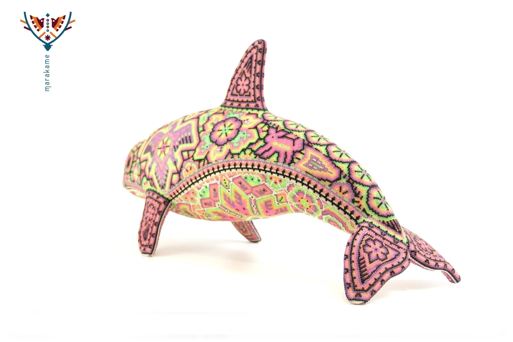 Los colores morados, rosas, verdes y amarillos de los cristales de chaquira se combinan con símbolos como el venado, las figuras felinas y otros símbolos zapotecos, creando una pieza única y exclusiva. La Vaquita Marina es un ejemplo perfecto del arte ceremonial zapoteco, que combina la belleza y la espiritualidad.