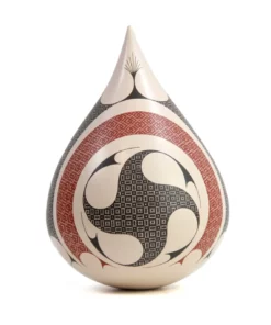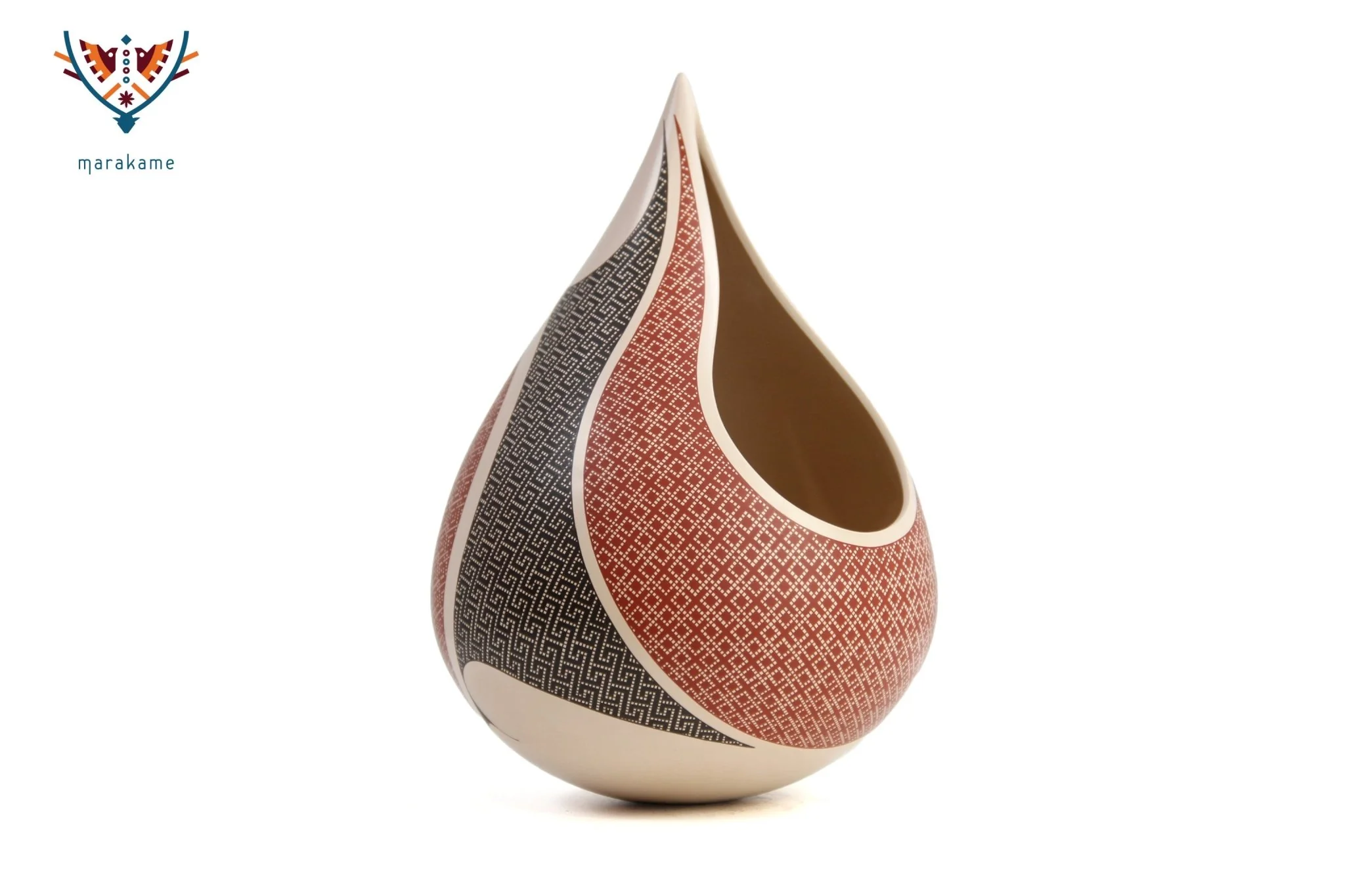 La composición vertical de esta pieza genera su movimiento y su equilibrio. La forma exterior es replicada en la boca de la olla, manteniendo un diseño a la vez regular y dinámico. La lluvia es una bendición, cada gota permite el desarrollo de la vida, su crecimiento. El agua también es esencial para el trabajo alfarero. Esta gota trae consigo maravillas.