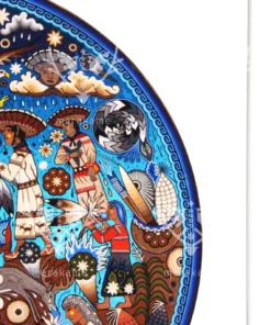 Esta tabla de hilo con cera, técnica de expresión plástica original del pueblo wixárika, muestra una escena muy ilustrativa de una ceremonia de ofrenda llevada a cabo en la Isla del Rey, en San Blas, Nayarit. En este lugar se encuentra la “roca blanca”, una formación rocosa a unos quinientos metros de la costa, que es considerada el hogar de Tatei Haramaara, Nuestra madre del Mar.