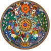 Ambos Mara’akate son presumiblemente los ayudantes o segunderos del central, con quienes éste se comunica mediante los cantos chamánicos. En medio de ellos, en la parte superior de la tabla, se encuentra el sol, con su propio rostro, flanqueado por dos águilas, y presentado con tonos también albiazules. Esto podría indicar que se trata de un sol prototípico, anterior a su nacimiento. Por ello, uno de los motivos de las ofrendas a entregar podría ser una petición para que el sol nazca en el amanecer.