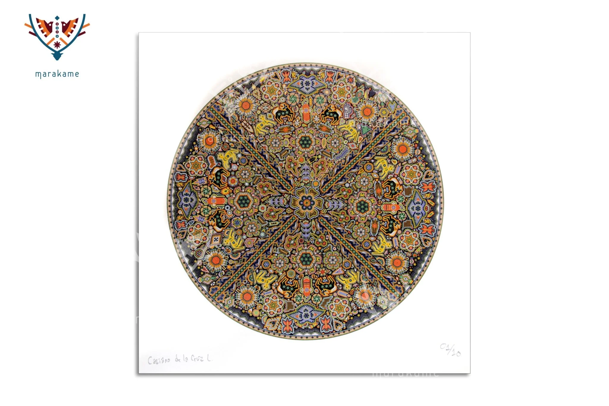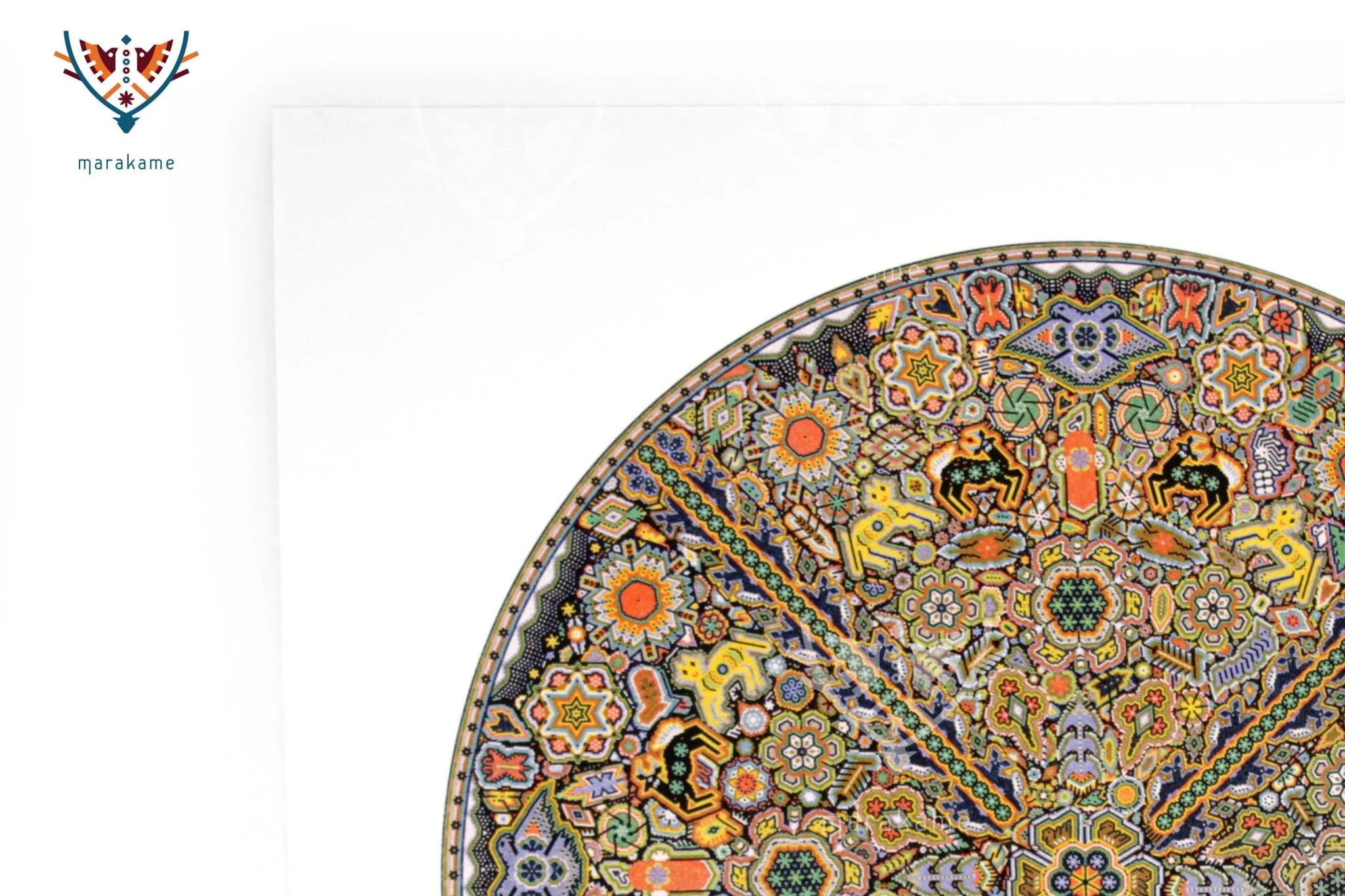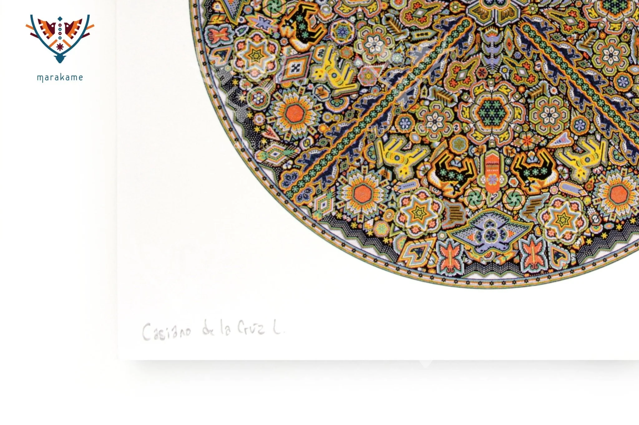 En Marakame trabajamos con artistas Wixárika innovadores que en esta ocasión han realizado un círculo intervenido con la técnica de chaquira. En cualquier caso abordando la narrativa de su costumbre tradicional mediante la simbología más representativa de su cosmovisión. Tiene más de 280,000 chaquiras de cristal colocadas una por una la obra original.