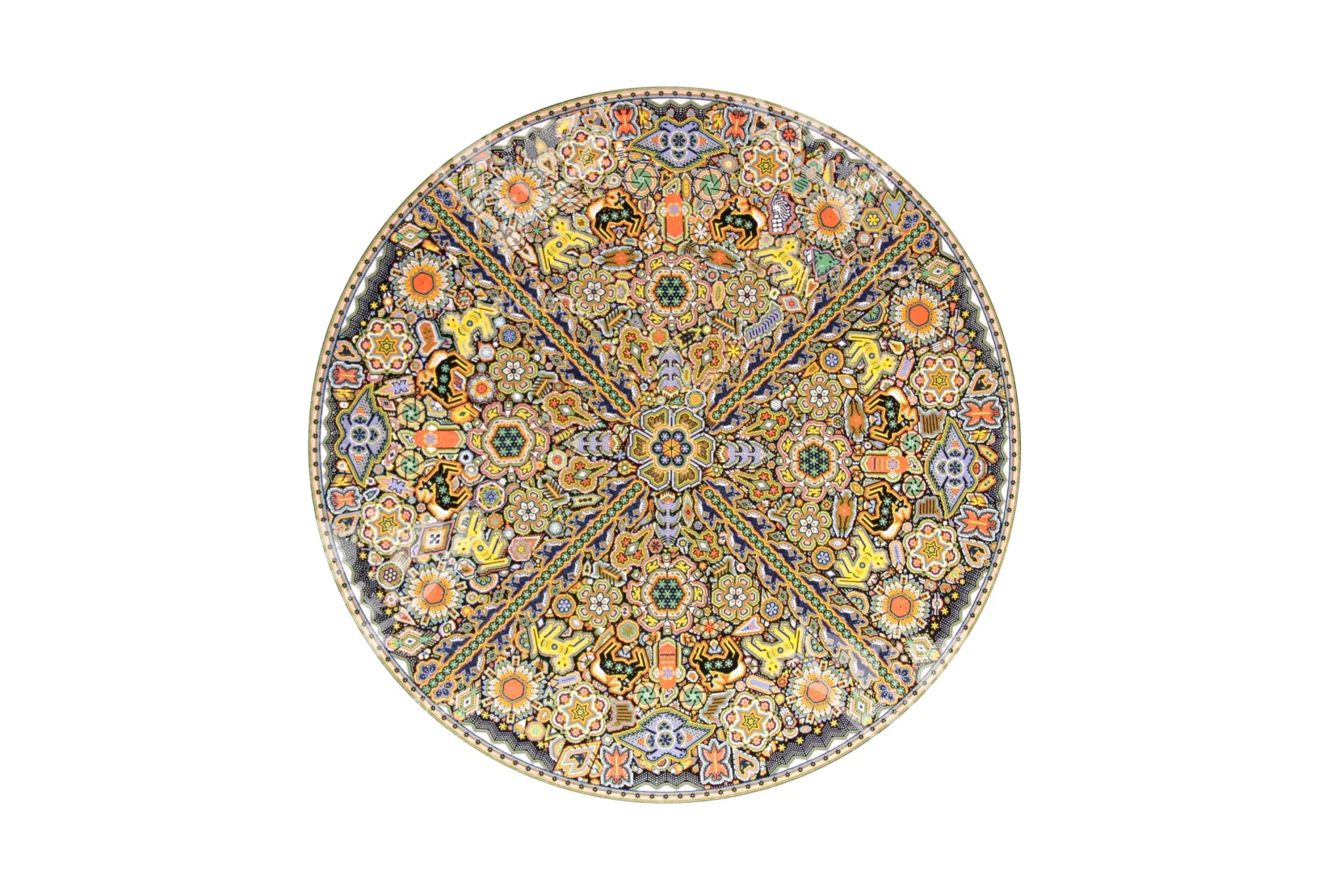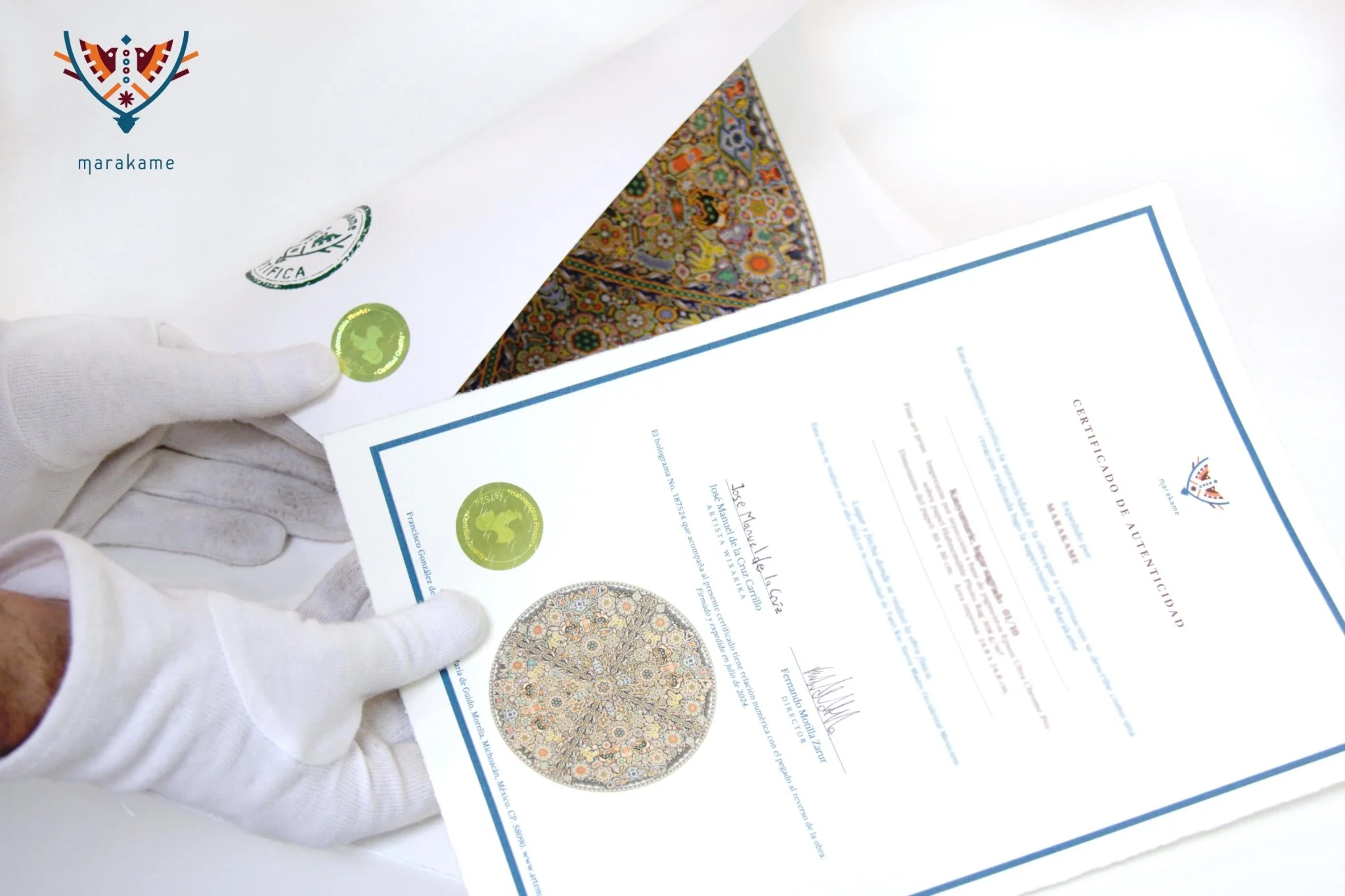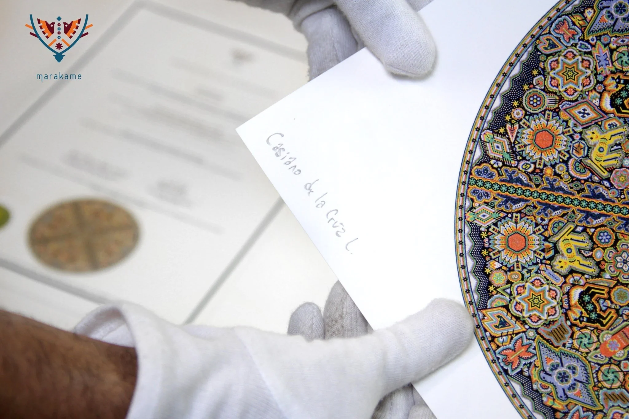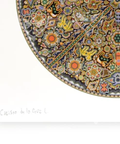 En Marakame trabajamos con artistas Wixárika innovadores que en esta ocasión han realizado un círculo intervenido con la técnica de chaquira. En cualquier caso abordando la narrativa de su costumbre tradicional mediante la simbología más representativa de su cosmovisión. Tiene más de 280,000 chaquiras de cristal colocadas una por una la obra original.