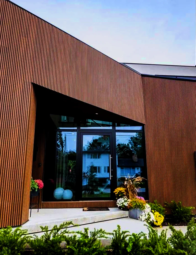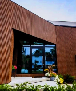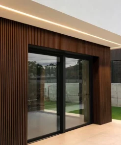 Lambrín Exterior Color Teca SIN-22 El lambrín CO-ESTRUXIÓN WPC para exterior está compuesto por 60% de resina de madera y 40% HDPE Polímero de alta densidad. Resistente a cambios extremos ambientales, ideal para lugares con altas temperaturas y exposición al sol prolongada así como lugares fríos, con lluvia y nieve. Lo vendemos por pieza. Cada pieza mide: 2.9 m de alto x 21.9 cm de ancho x 26mm de grosor.