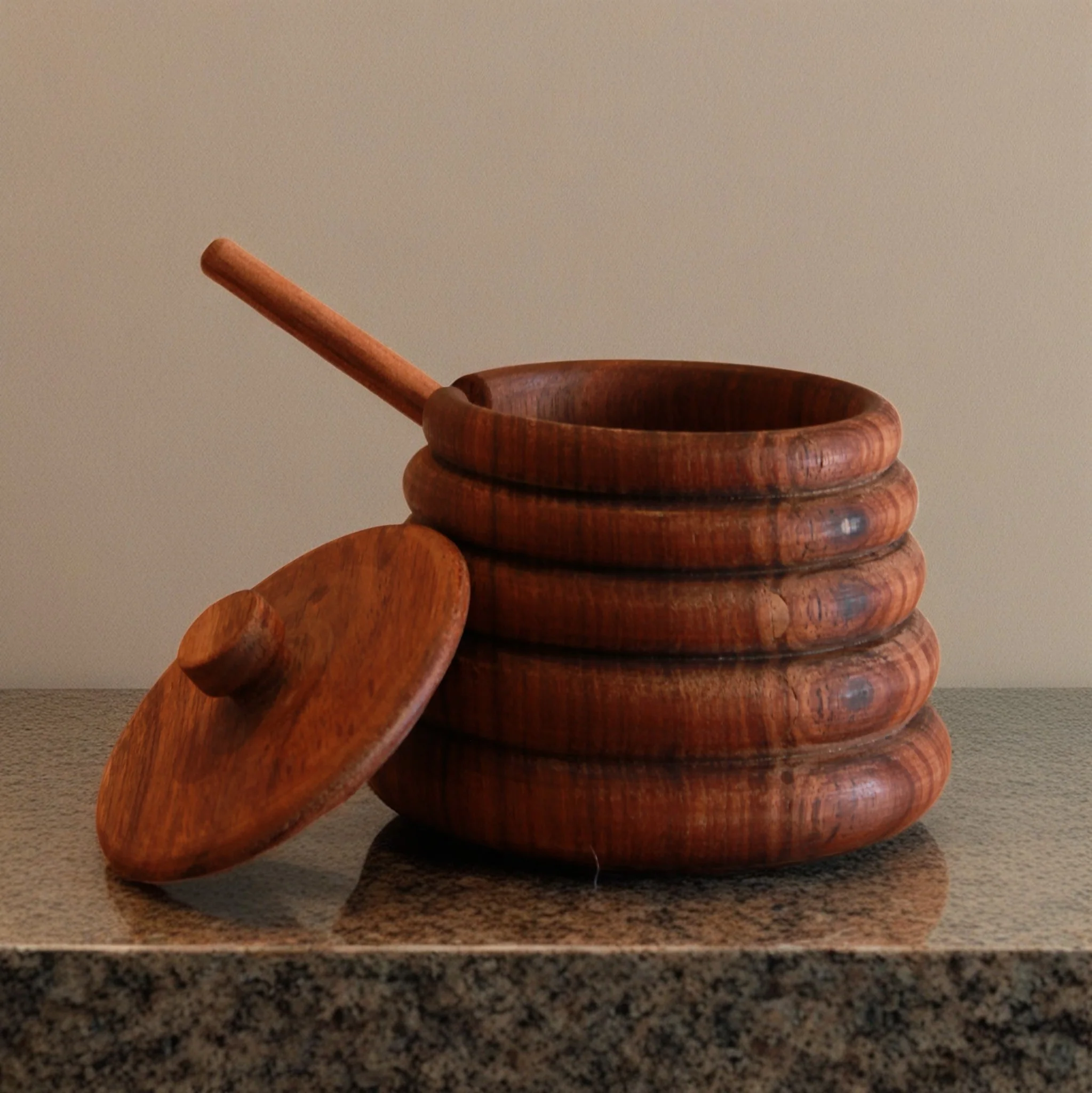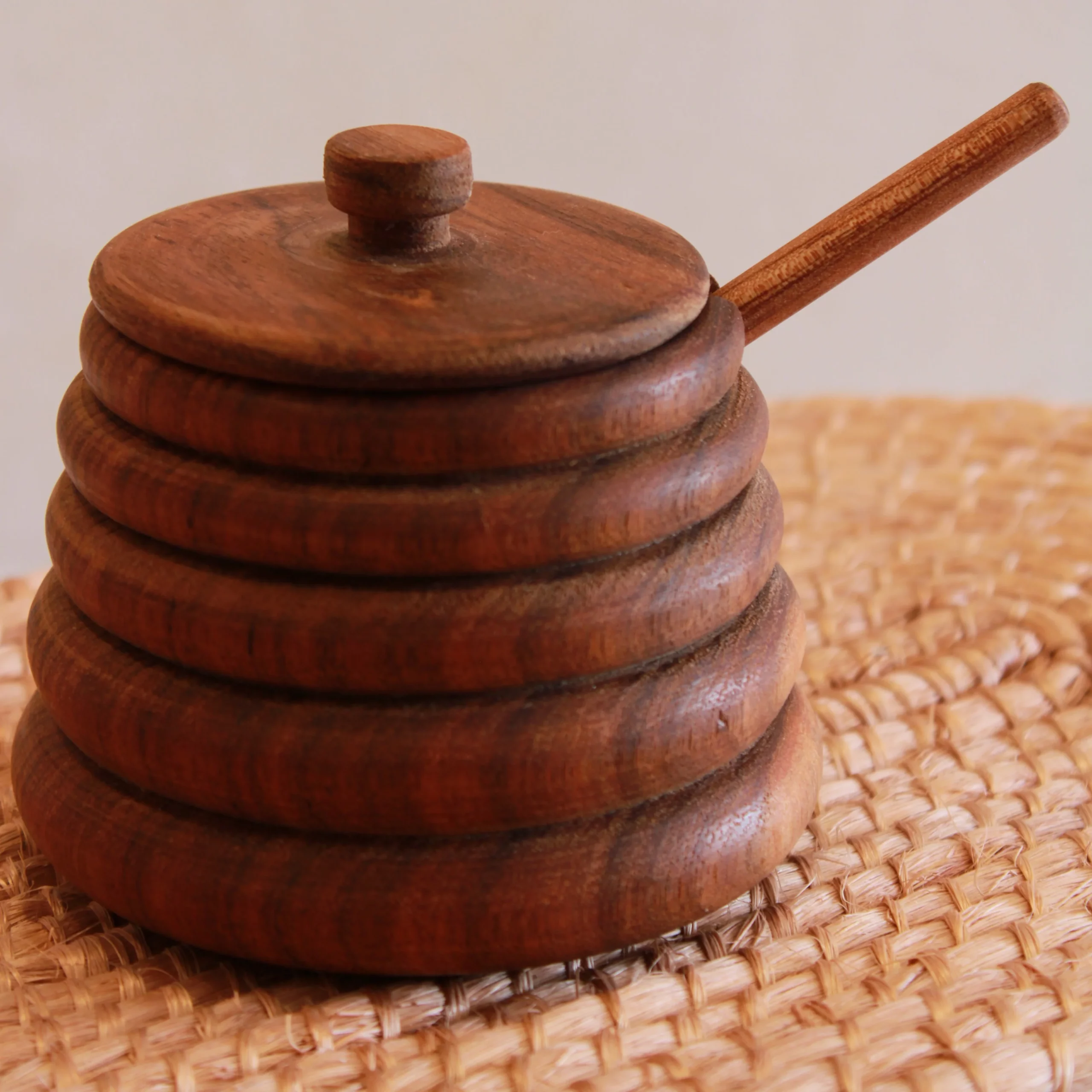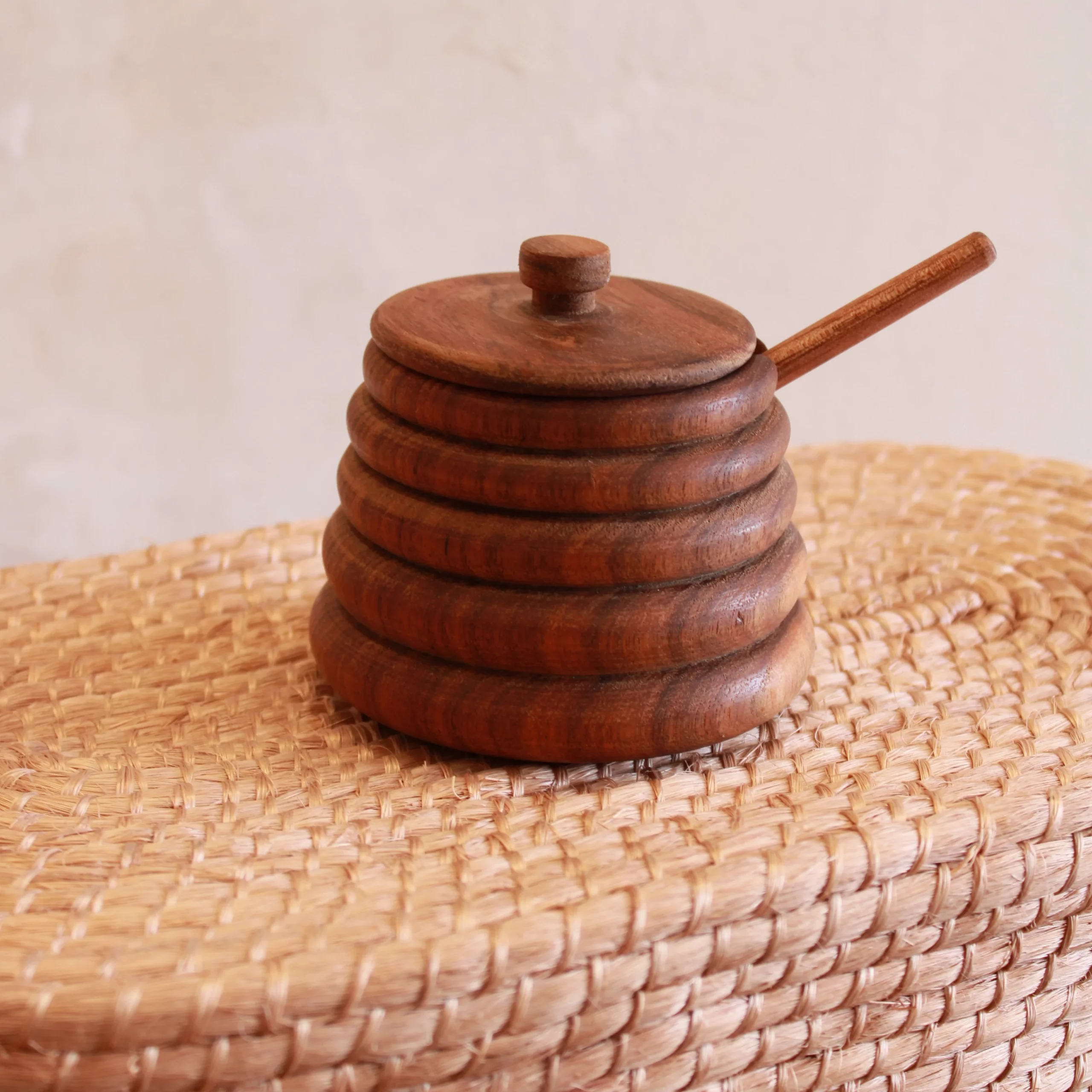 Recipiente para miel de madera de Tzalam, capacidad de 150 ml, perfecto para tus reuniones, de manera muy original. Diseño moderno y elegante ideal para cualquier regalo, decoración y uso.