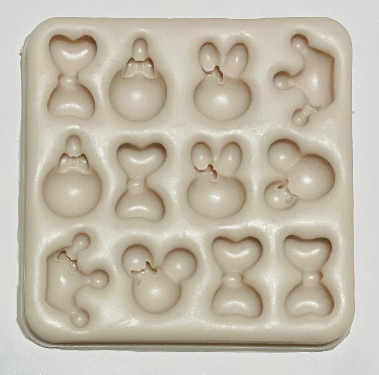 Molde de 12 cavidades con diferentes figuras, Moño, Minie, Corona y esfera.