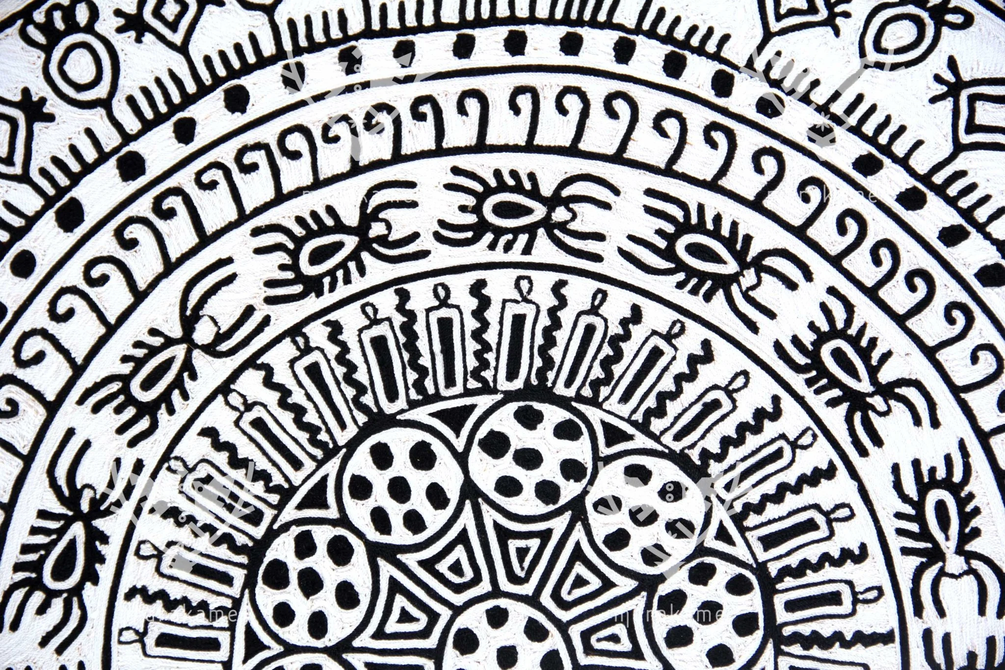 “En este cuadro vemos el nacimiento del mundo del peyote llamado la chuparrosa enpeyotada, adornado con ofrendas de velas y rayos mágicos, decorado que son animalitos, madre de la lluvia, ofrendados con pintura de peyoteros alrededor, así como maracas y ojo de Dios, el buen camino de los dioses. También vemos las serpientes como el camino del peyotero. En las serpientes vemos dibujos huella de los dioses saliendo de Tatei Aramara hasta el cerro quemado, Wirikuta. También vemos muvieris curanderas del marakame como símbolo descanso de los dioses. Así también vemos danzando los peyotes a un solo lado como señal del deraviso del mundo del peyote. La corona que vemos en la última rueda significa cada muwieri y rayos. La corona de los dioses más importantes hacia los cuatro puntos cardinales como son Aramara, Wirikuta, Cerro Gordo, Auxamanaka, Lago de Chapala, Rapa Wiyeme y todo conforma como el mundo del peyote.”
