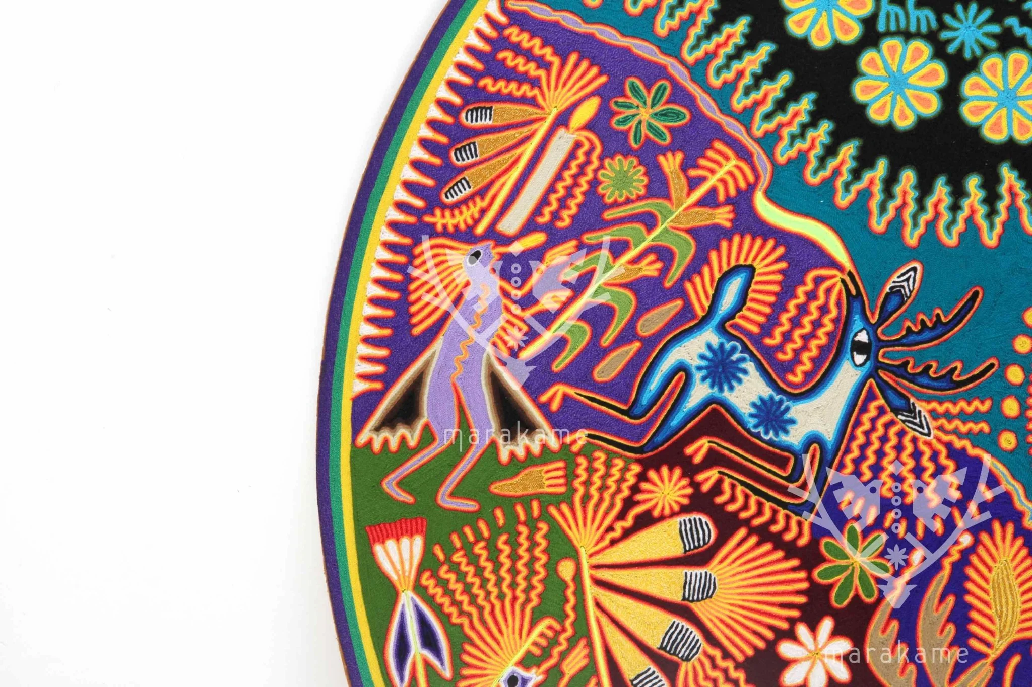 En Marakame trabajamos con cinco artistas Wixaritari -huicholes- que elaboran piezas especialmente de gran formato con la antigua técnica de “Pintado con Estambre”, decidimos comisionar a los artistas obras de hasta 6 m2 de superficie -siendo estas las más grandes en el mundo en su estilo y técnica-, desde el estilo antiguo hasta representaciones más realistas, según el estilo pictórico de cada creador, en cualquier caso abordando la narrativa de su costumbre tradicional mediante la simbología más representativa de su cosmovisión.