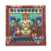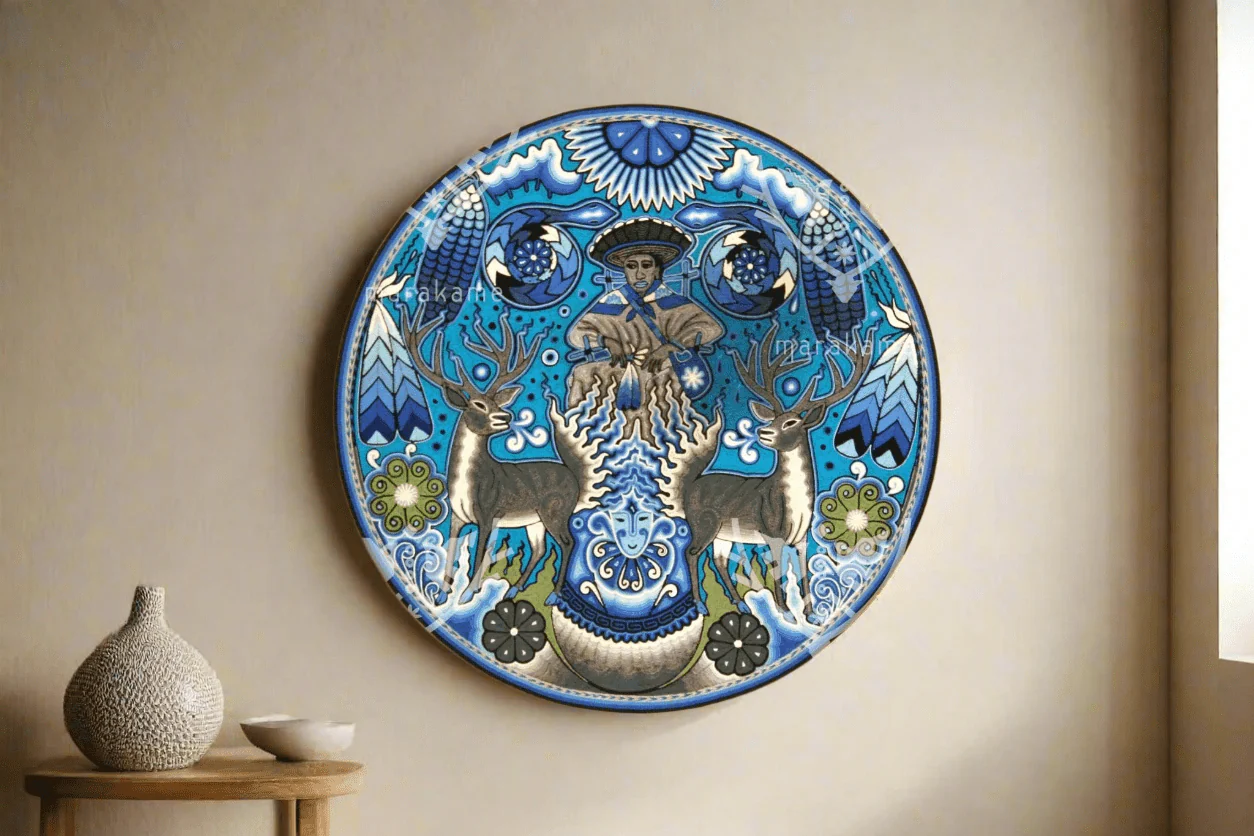 Este cuadro hecho a mano es una obra maestra del arte huichol, reconocido por su riqueza simbólica. En el centro del cuadro, un huchol sentado nos invita a entrar en su mundo espiritual. Debajo de él, un caldero de fuego arde, simbolizando la energía y la sabiduría. A los lados del caldero, dos venados majestuosos se encuentran en quietud, representando la conexión con la naturaleza.
