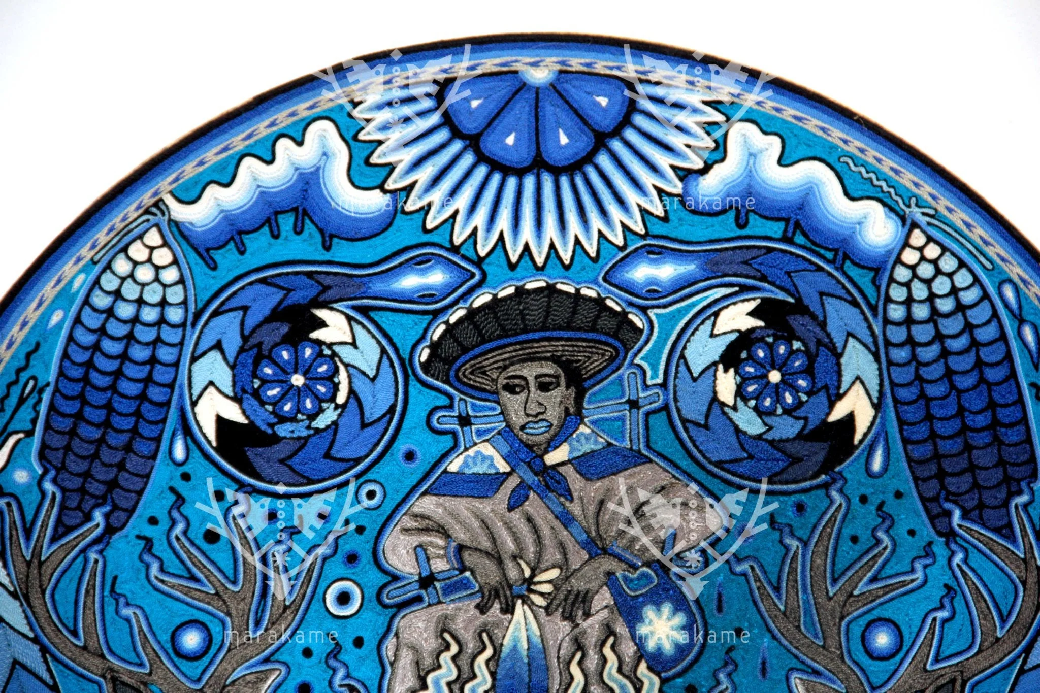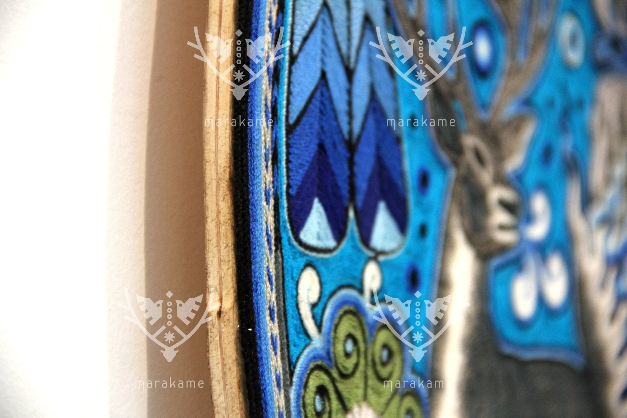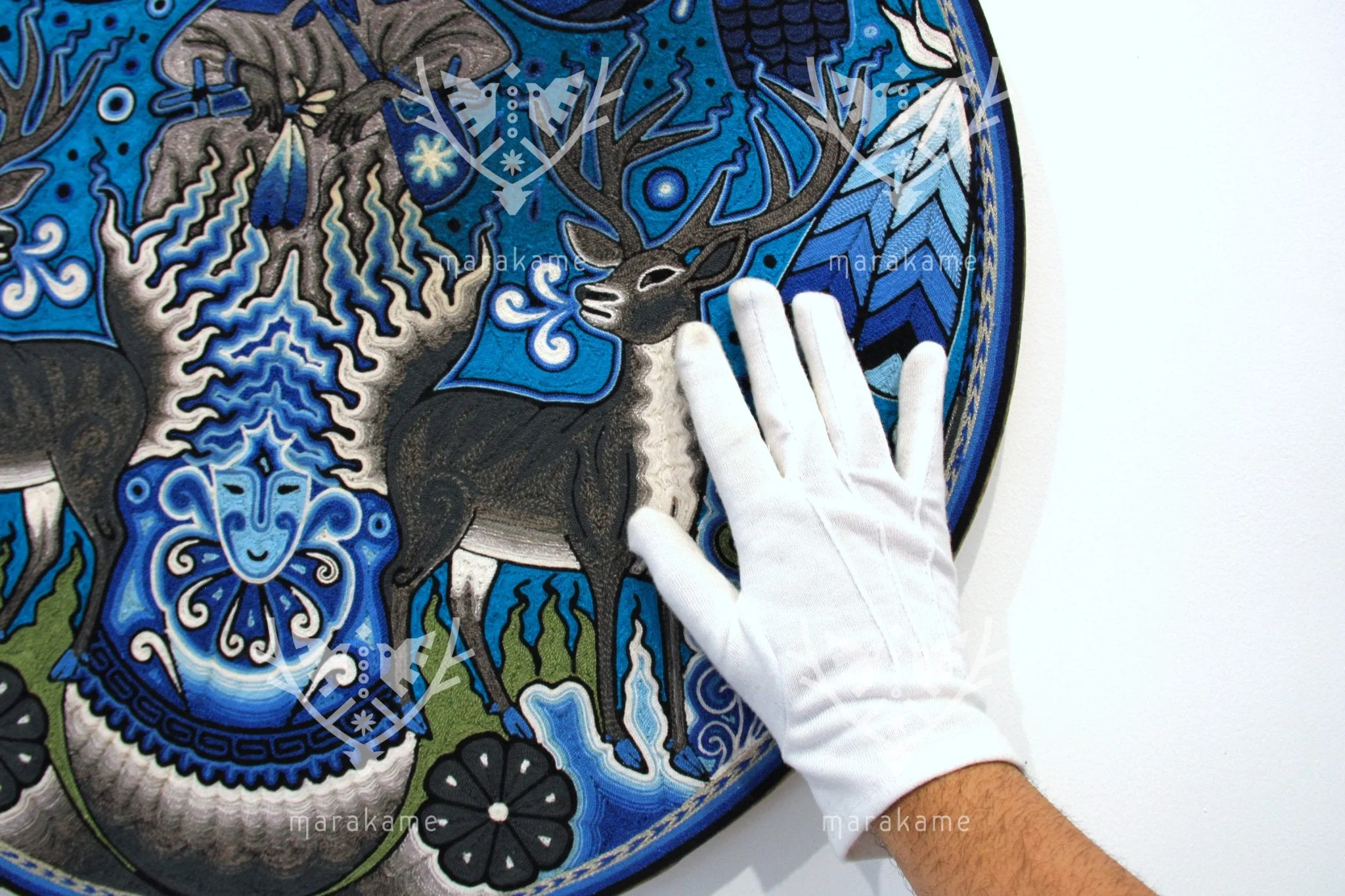 Todo el cuadro está pintado en una escala de azules, blancos, negros y grises, lo que le da un toque mágico y espiritual. Este cuadro es una obra auténtica y única, hecha con amor y dedicación por artesanos wixárika. Cada hilo de estambre es un pincelado de vida que converge en un patrón abstracto y detallado que invita al espectador a explorar sus profundidades.