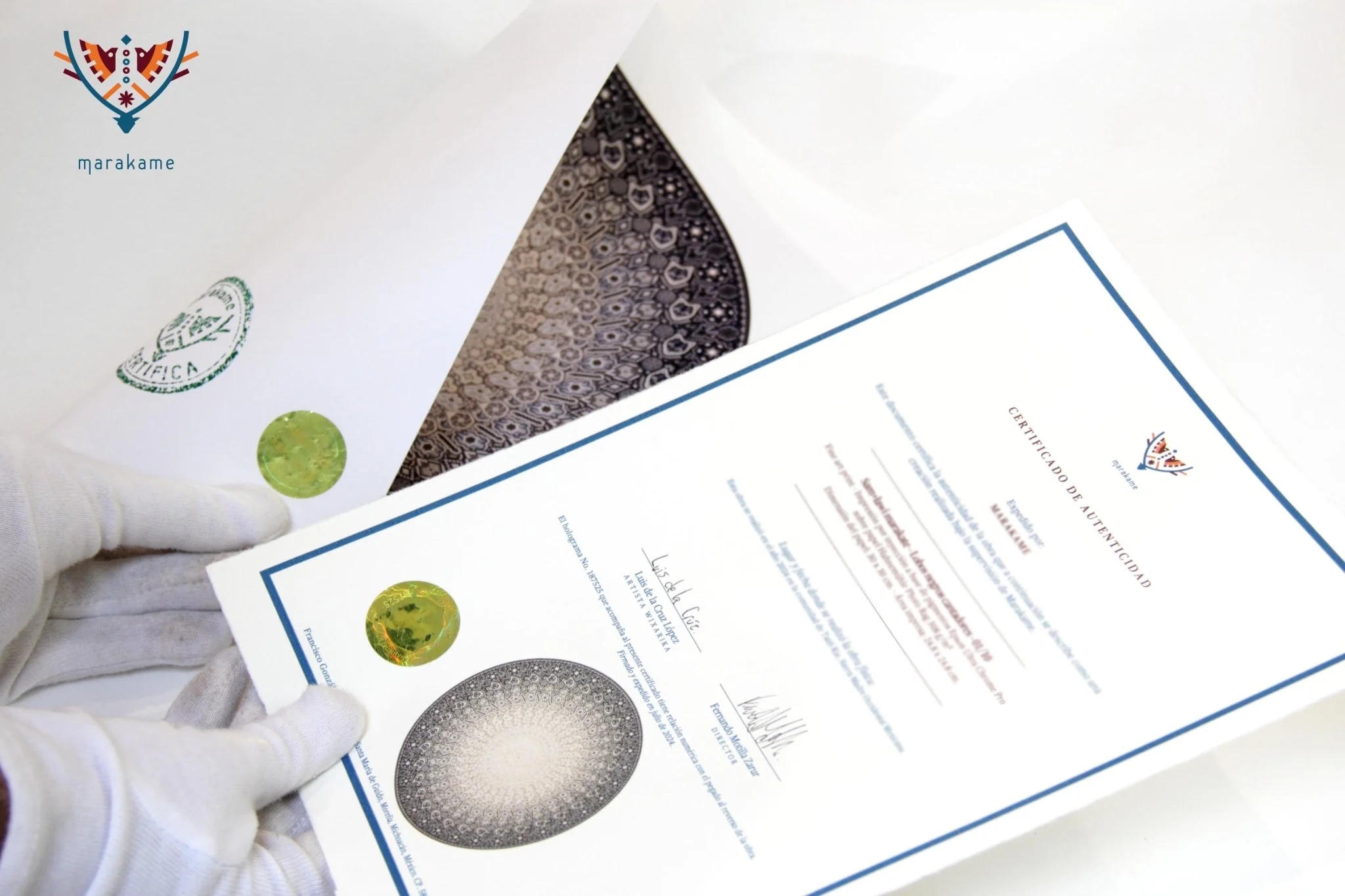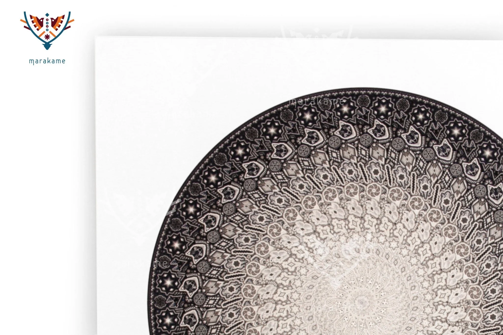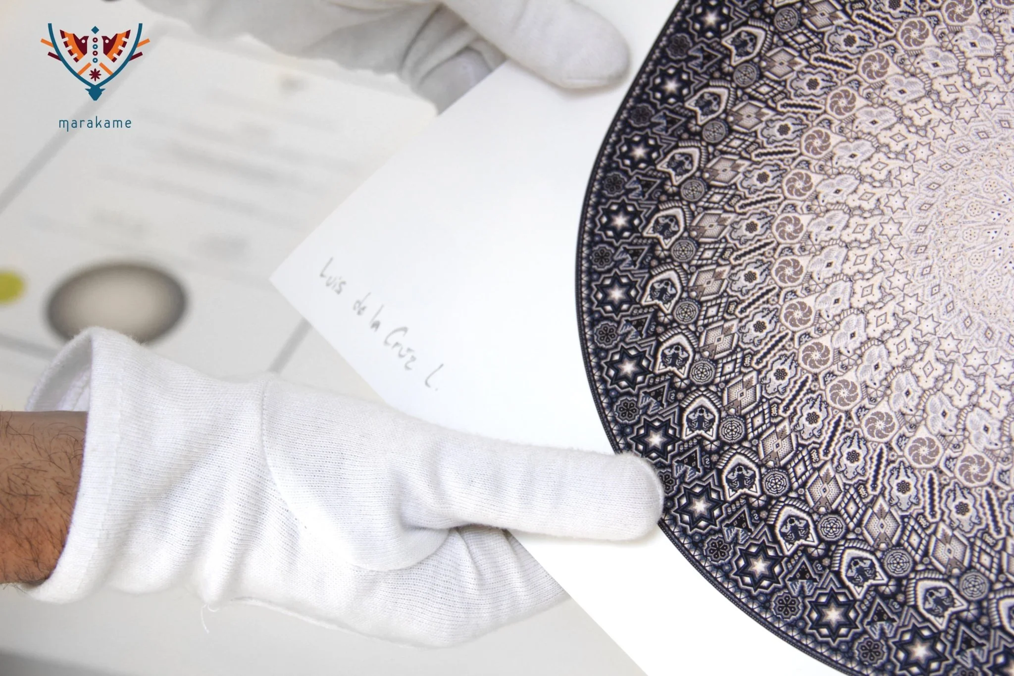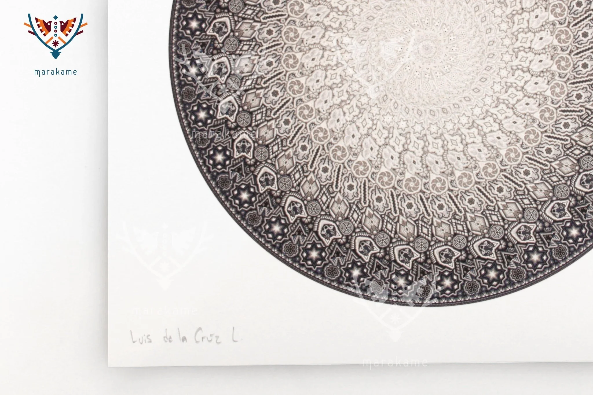 En Marakame trabajamos con artistas Wixárika innovadores que en esta ocasión han realizado un círculo intervenido con la técnica de chaquira. En cualquier caso abordando la narrativa de su costumbre tradicional mediante la simbología más representativa de su cosmovisión. Tiene más de 550,000 chaquiras de cristal colocadas una por una la obra original.