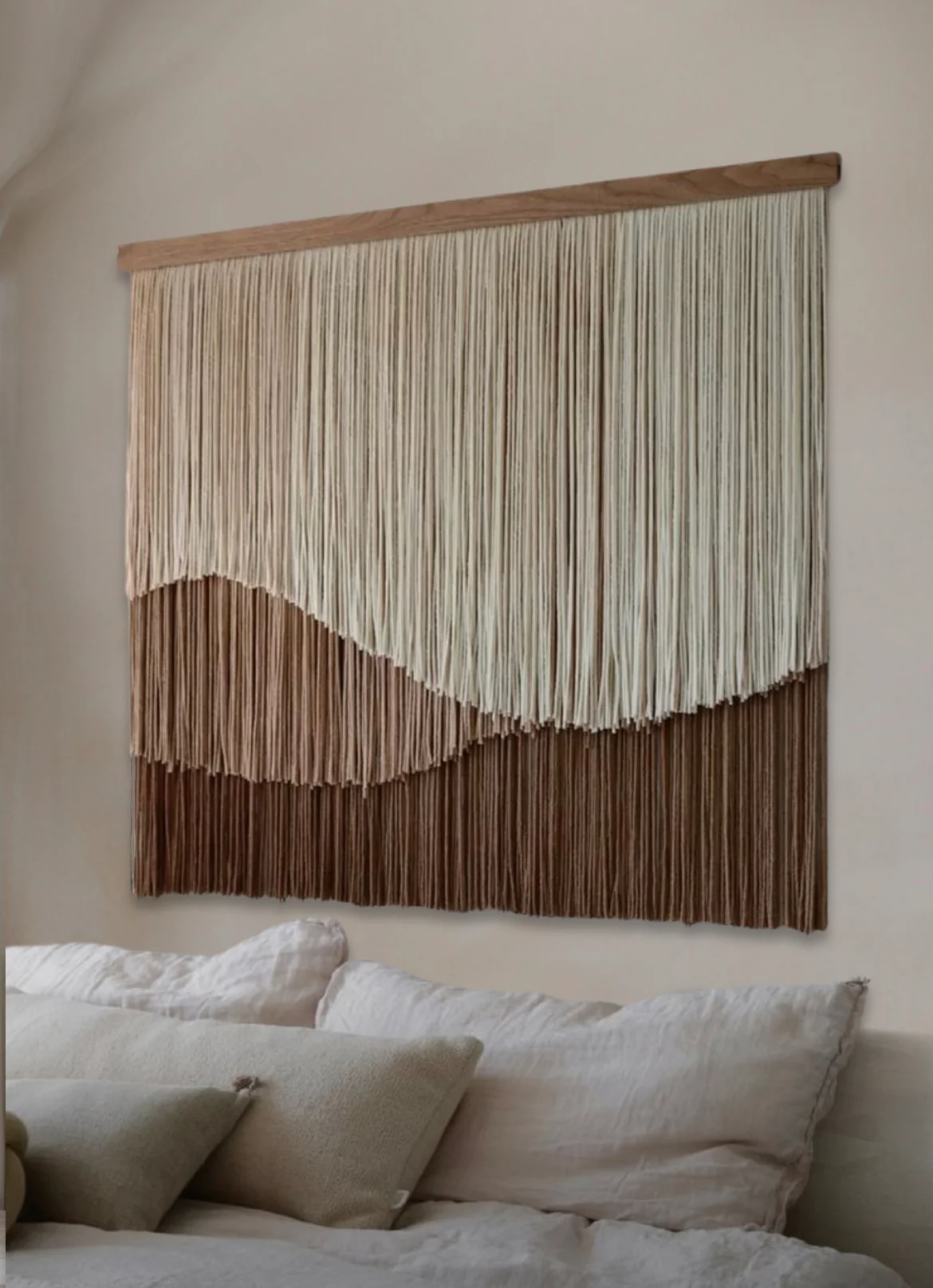 Decora con nuestro tapiz cuadro de 3 capas de hilo (color natural, kaki y camel ) hecho de algodón y madera. Fabricado íntegramente a mano, por nuestros artesanos en Yucatán, México.
